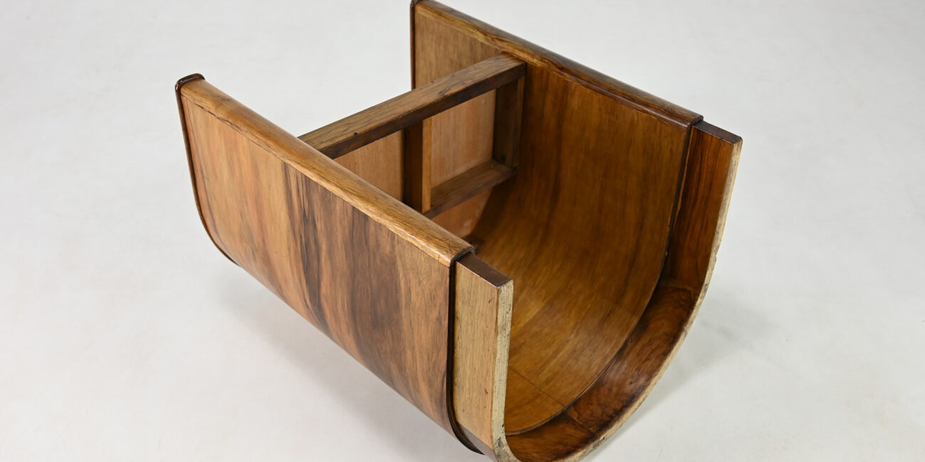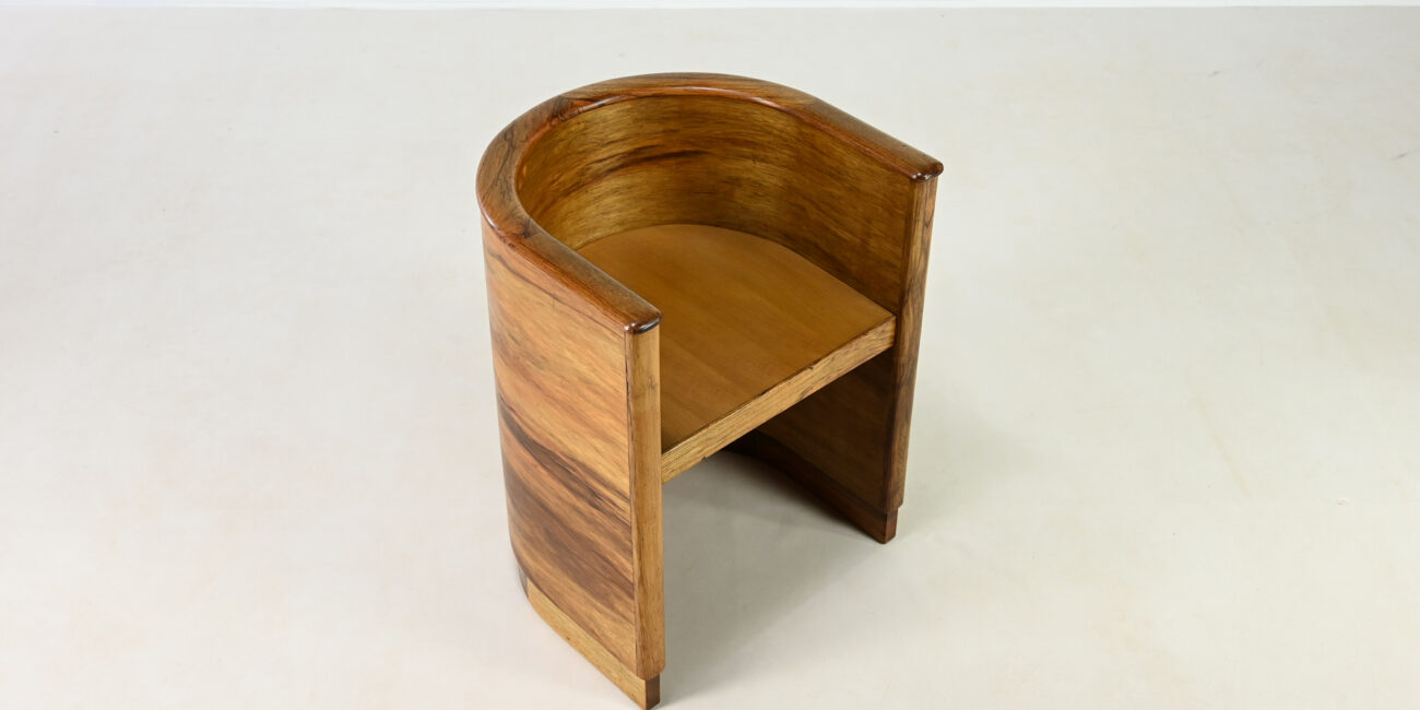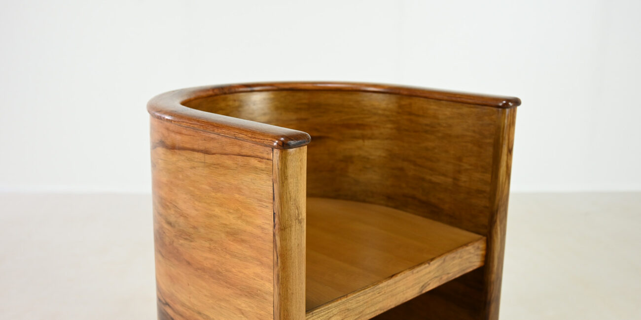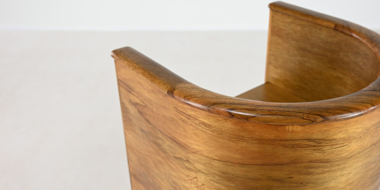 Elegant Art Deco concave armchair, in the manner of Alvar Aalto and Otto Korhonen work, made of walnut and walnut veneer. Lack of veneer in some spots, traces of use such as scratches, dents. Good structural and functional condition. France, C.1940. Signed under the seat.
