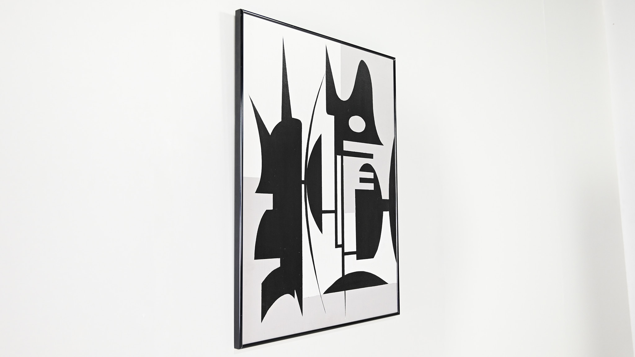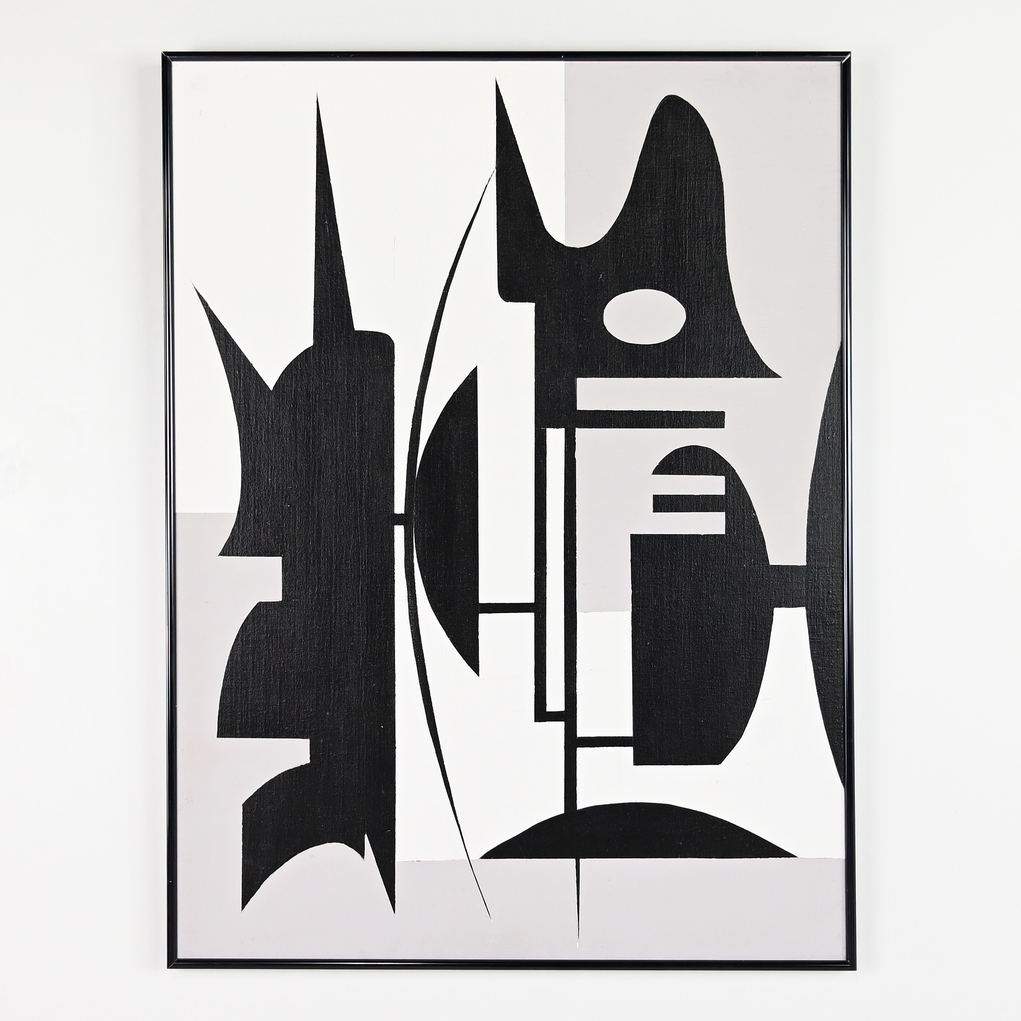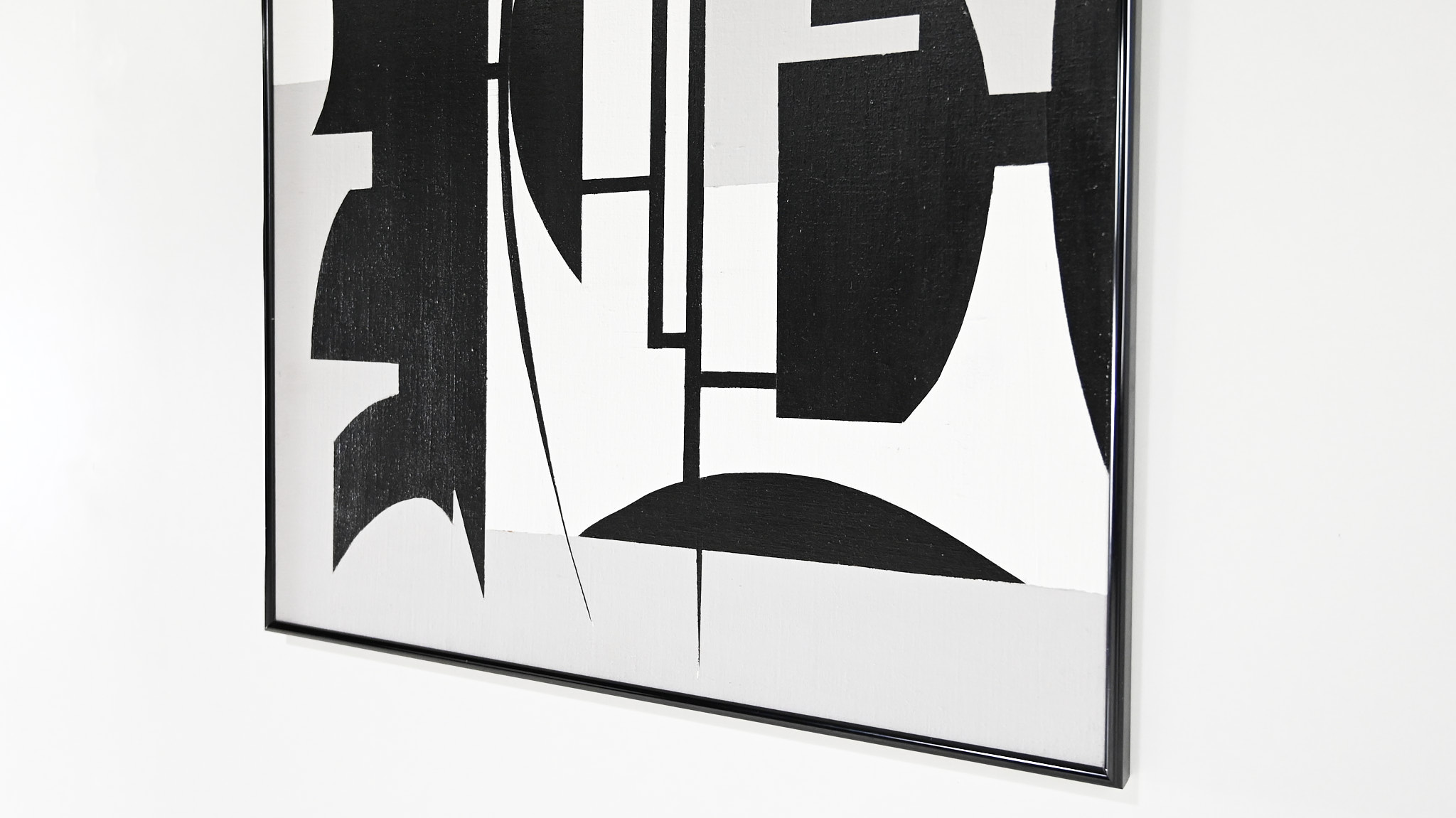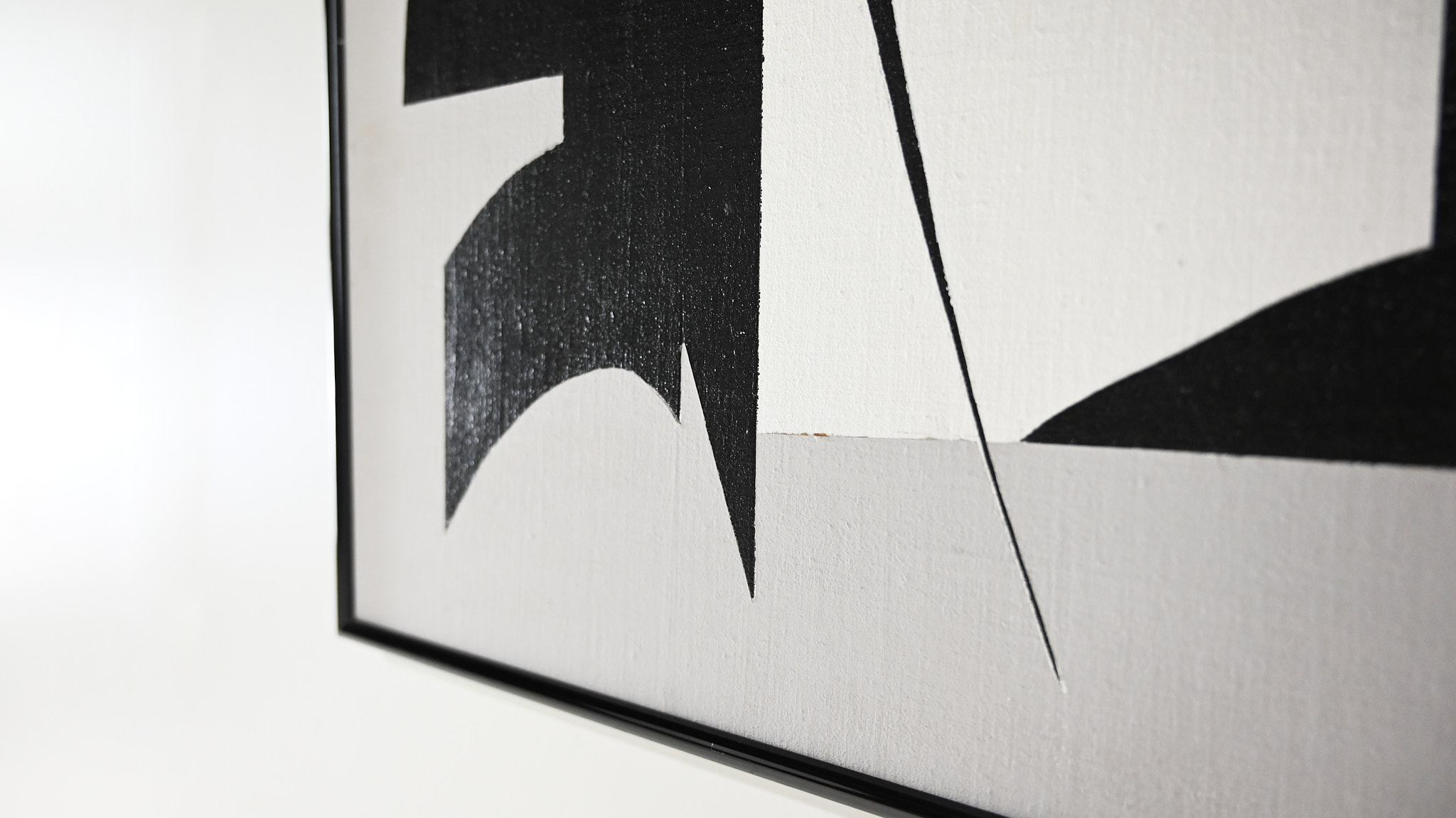 Beautiful abstract composition in white grey and black acrylic. Canvas on wood panel, in a black aluminum frame Artist unknown.