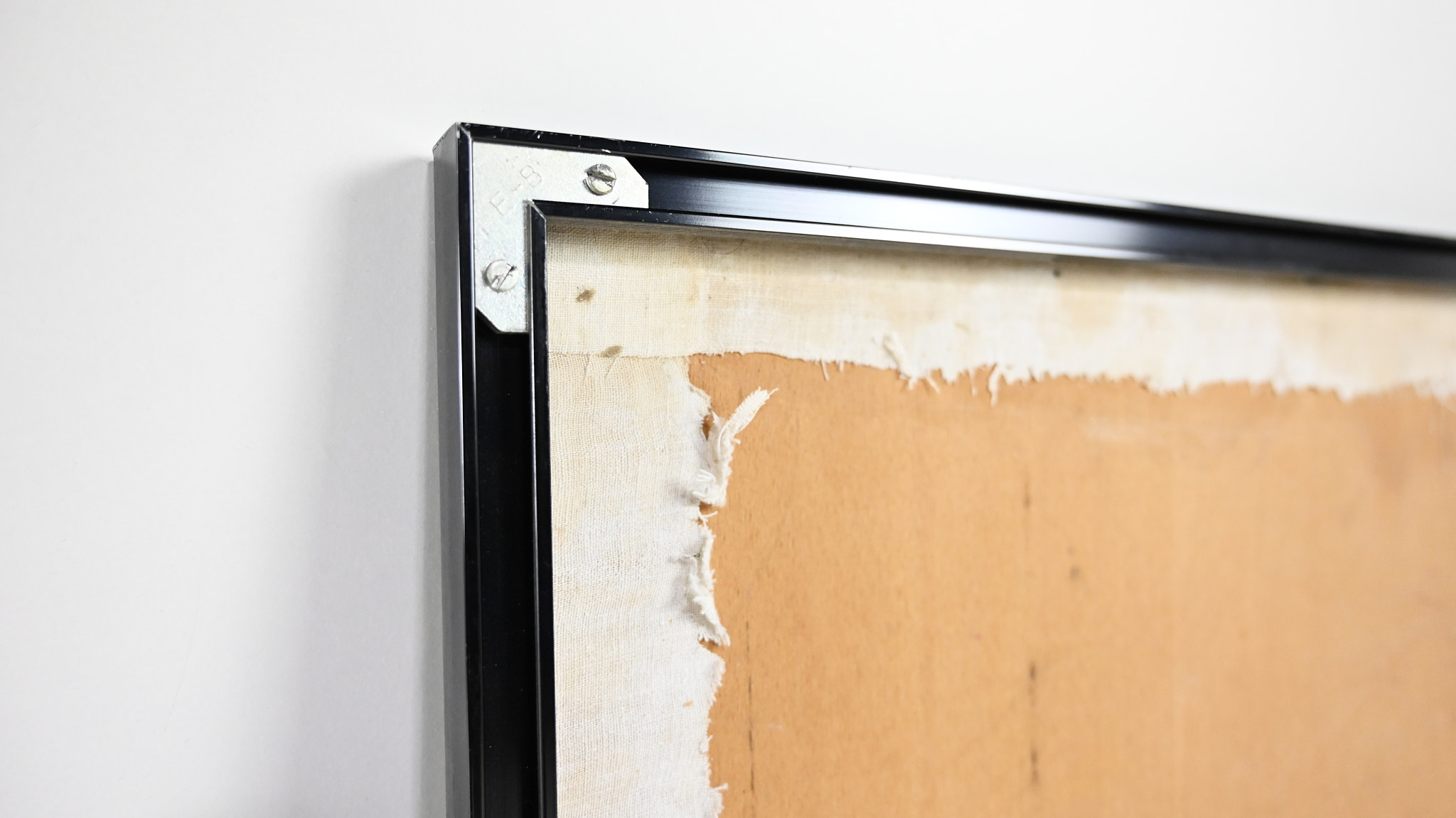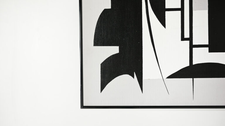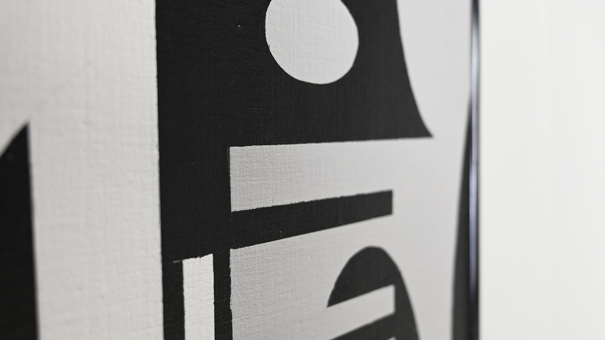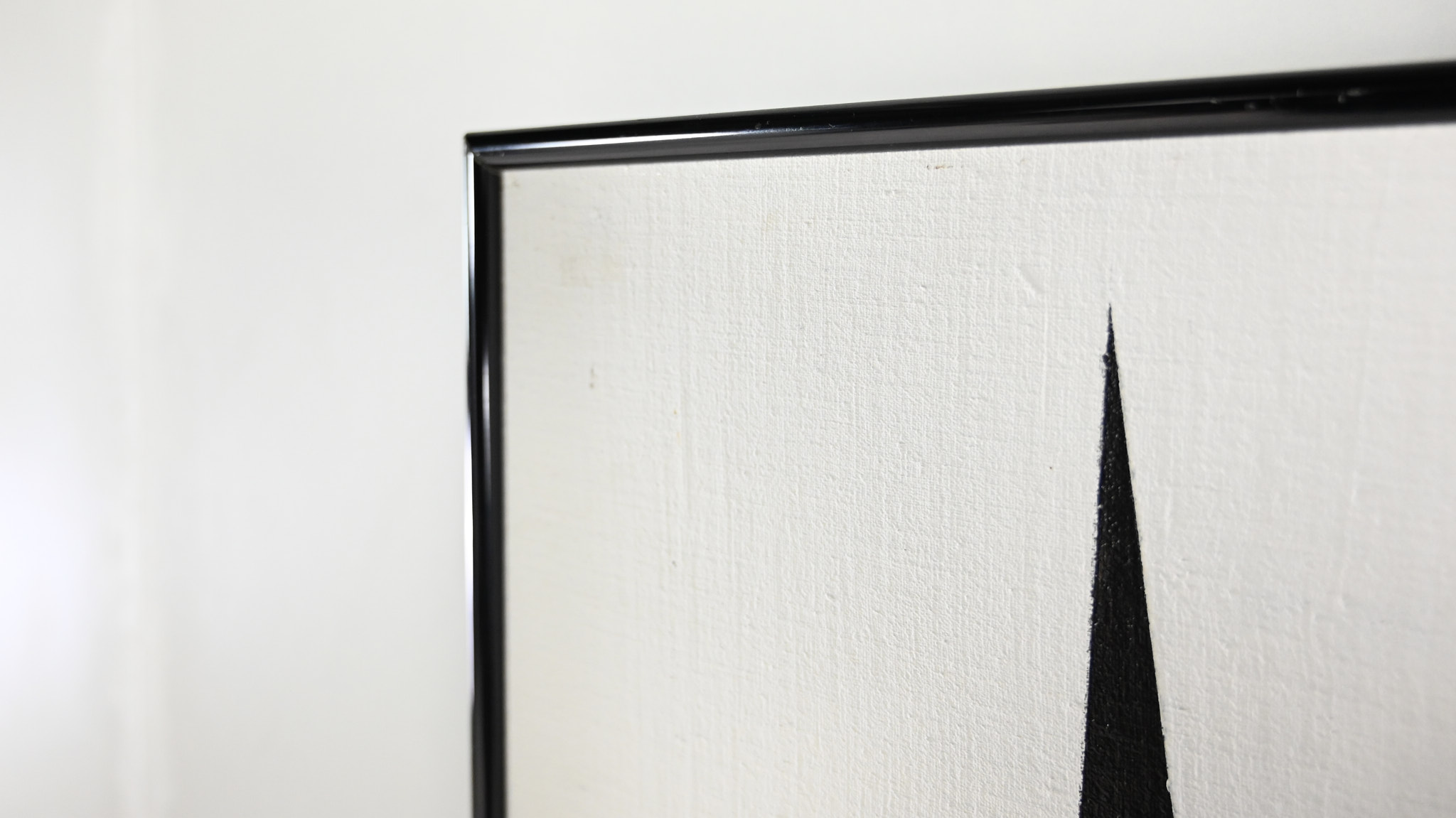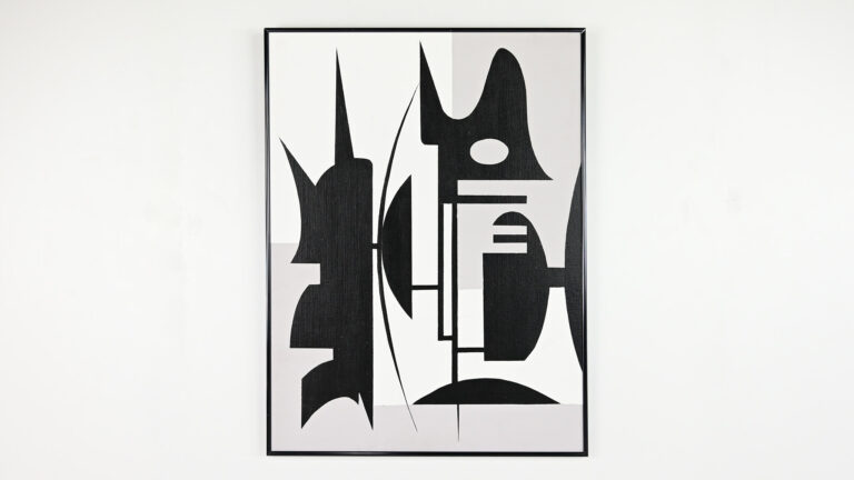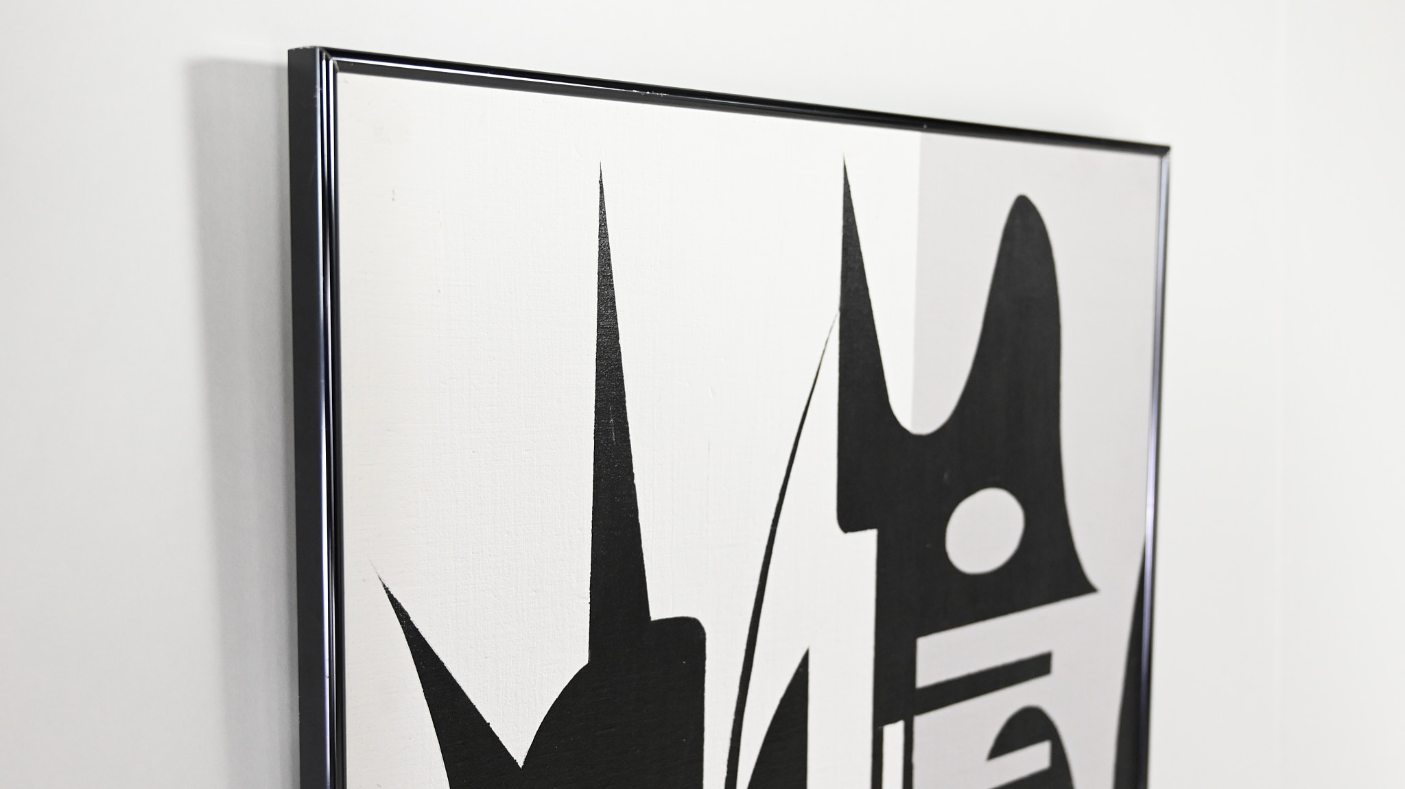 Beautiful abstract composition in white grey and black acrylic. Canvas on wood panel, in a black aluminum frame Artist unknown.