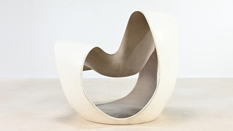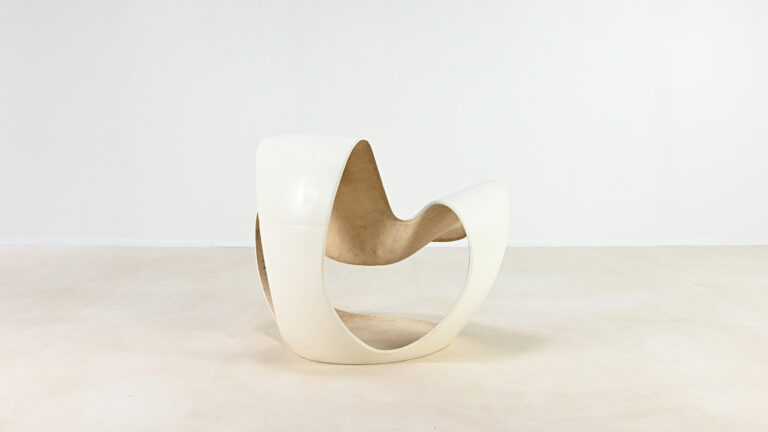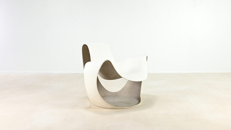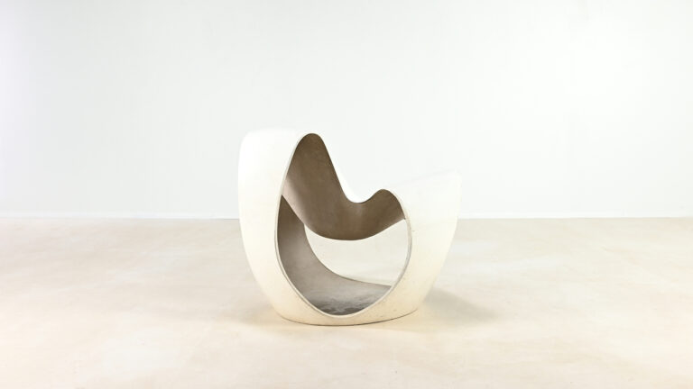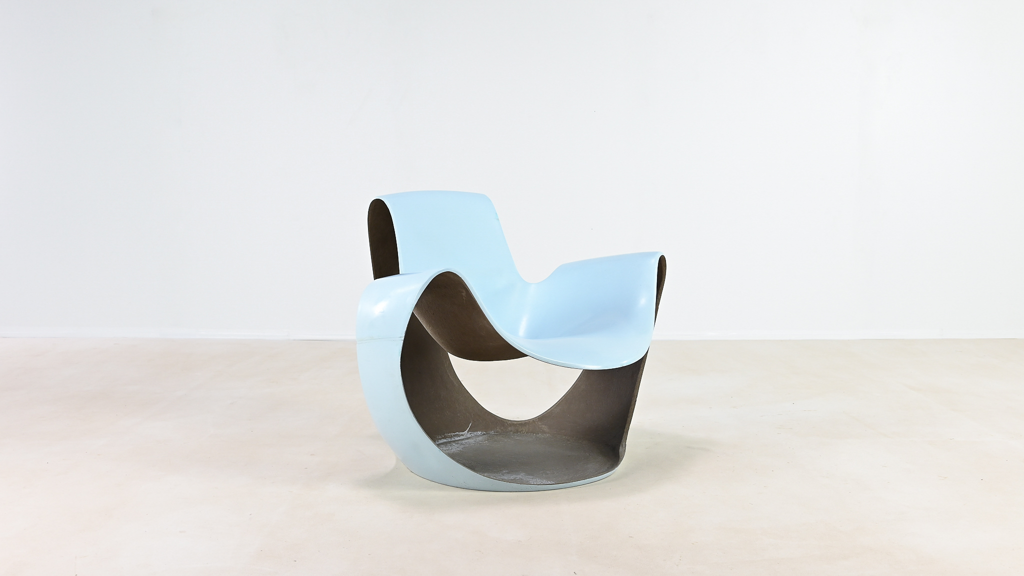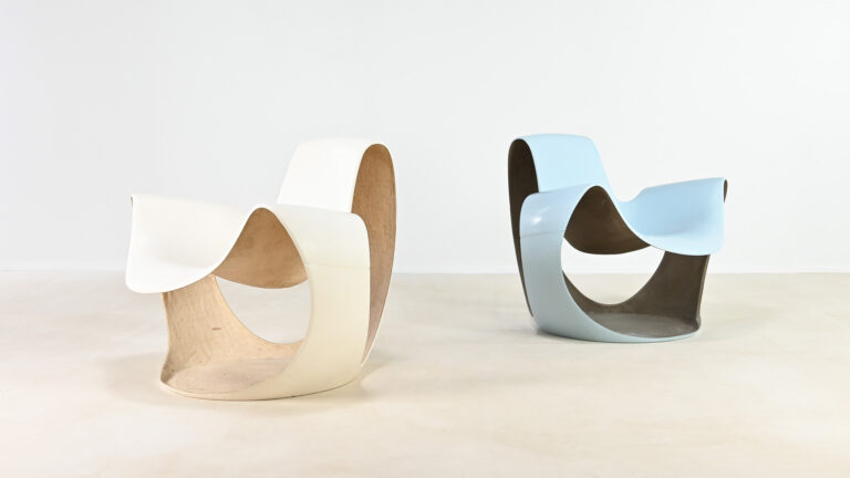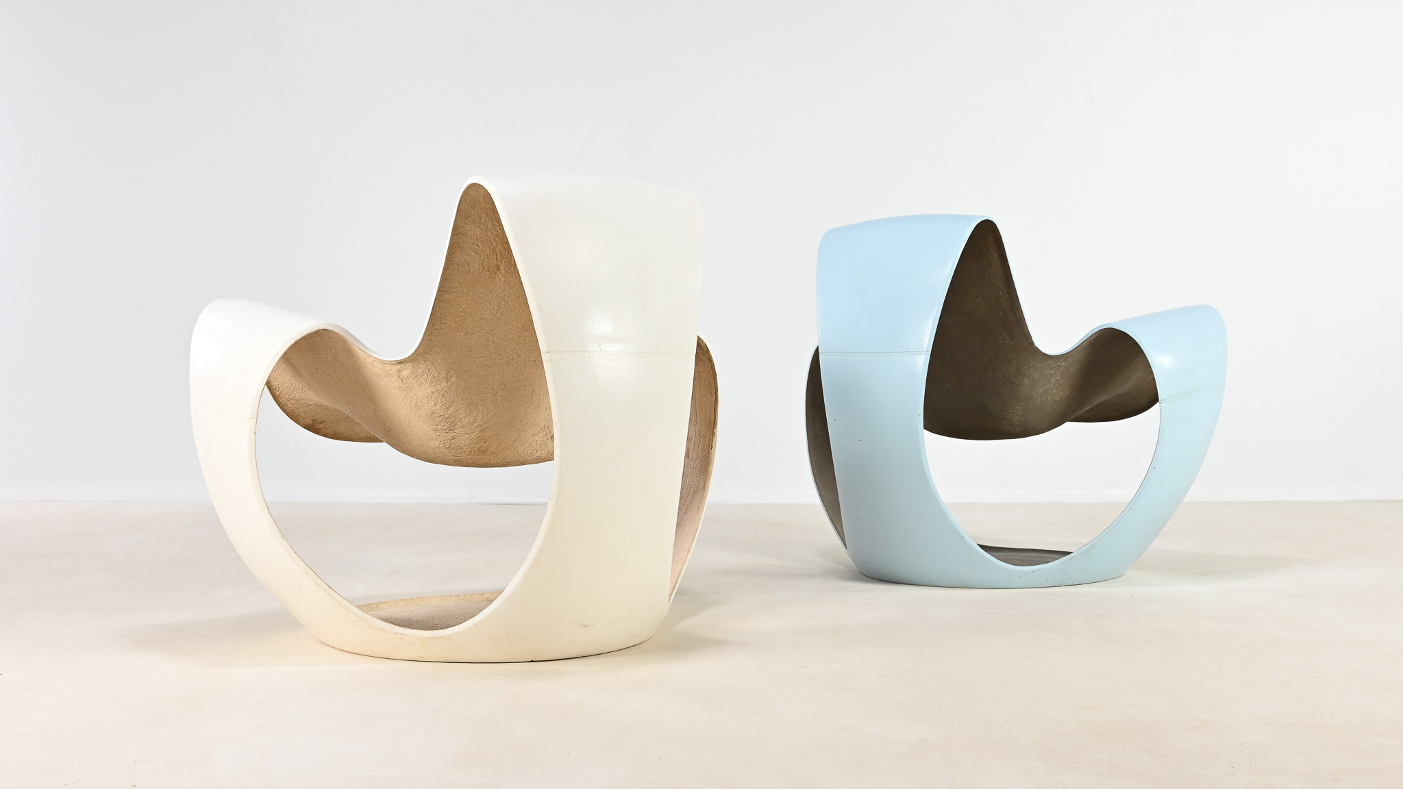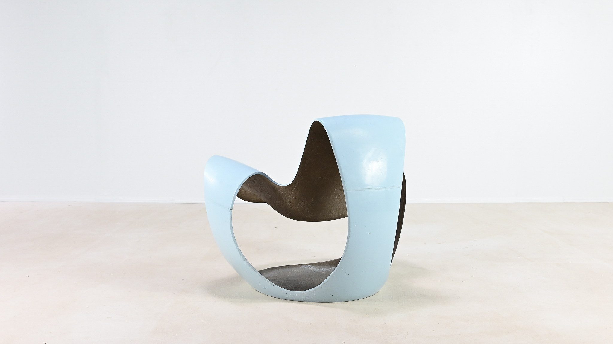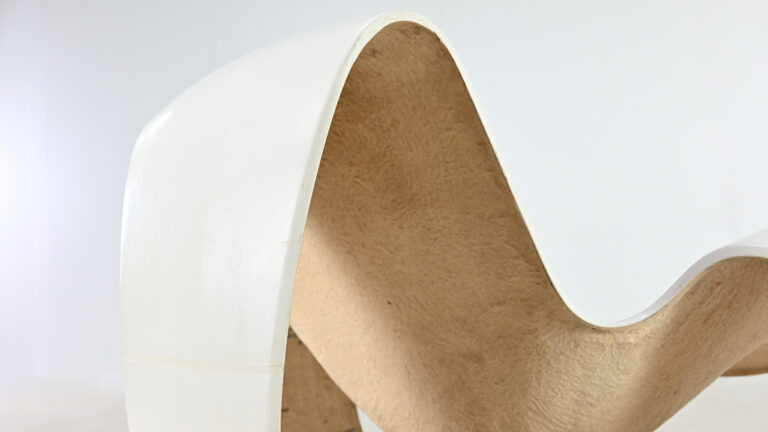Produced in limited numbers, each chair consists of two resin shells, lacquered with Gelcoat. This listing includes versions in white, sky blue, and orange. The interior retains a raw, textured surface—a result of the material constraints of the time—adding to its authenticity and charm. The Albatros stands out for its innovative use of molded fiberglass and resin, which allowed for its bold, ribbon-like shape. Each chair sits low to the ground and offers a surprisingly comfortable experience thanks to its enveloping silhouette and organic balance.