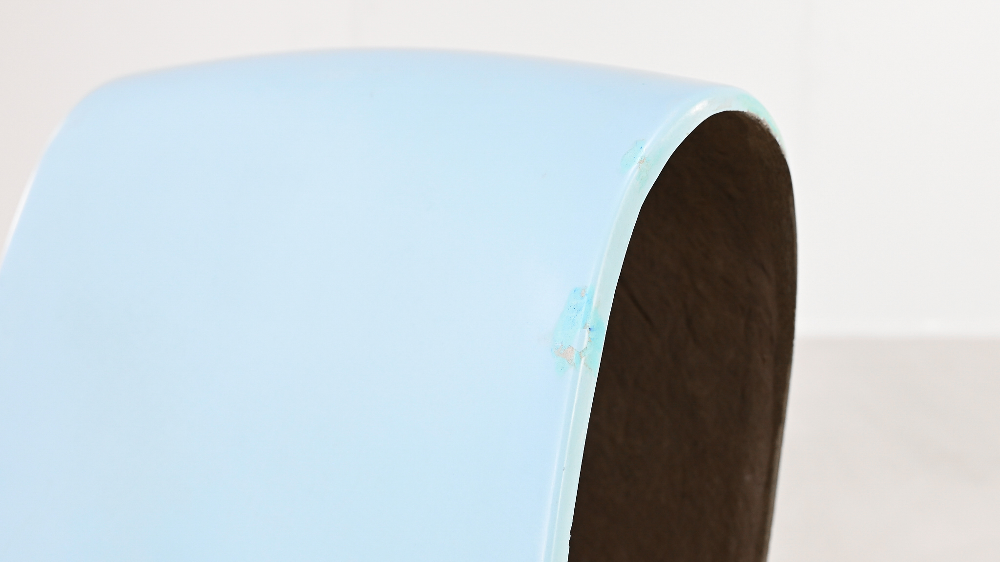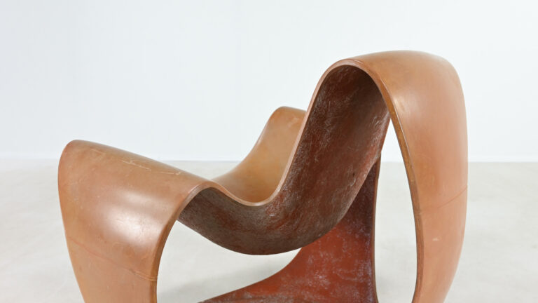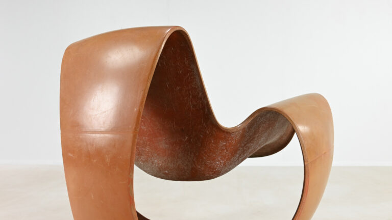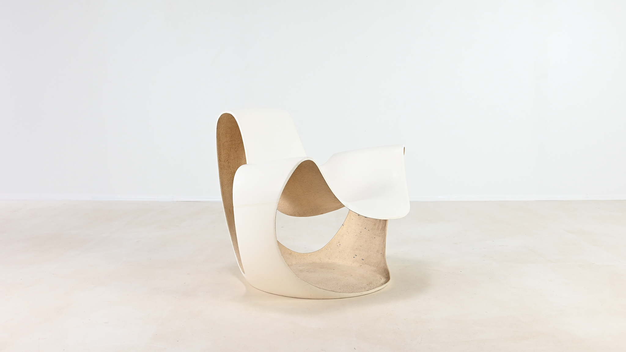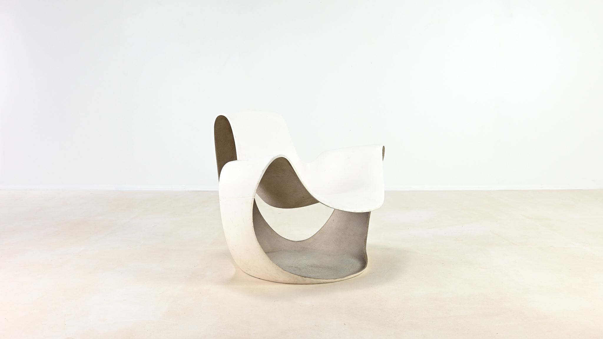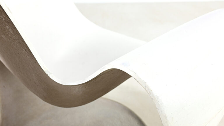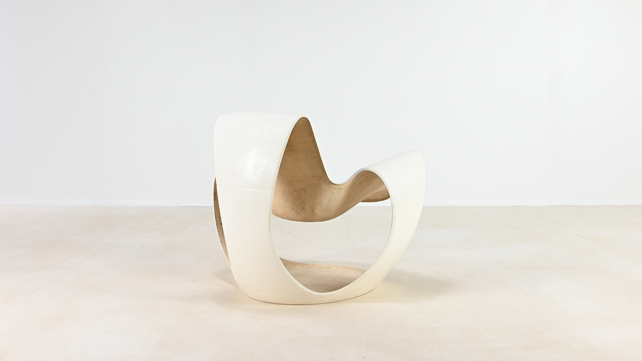 Produced in limited numbers, each chair consists of two resin shells, lacquered with Gelcoat. This listing includes versions in white, sky blue, and orange. The interior retains a raw, textured surface—a result of the material constraints of the time—adding to its authenticity and charm. The Albatros stands out for its innovative use of molded fiberglass and resin, which allowed for its bold, ribbon-like shape. Each chair sits low to the ground and offers a surprisingly comfortable experience thanks to its enveloping silhouette and organic balance.