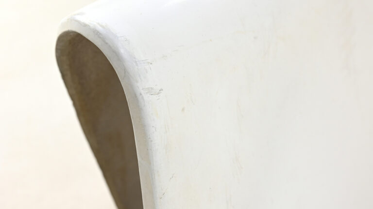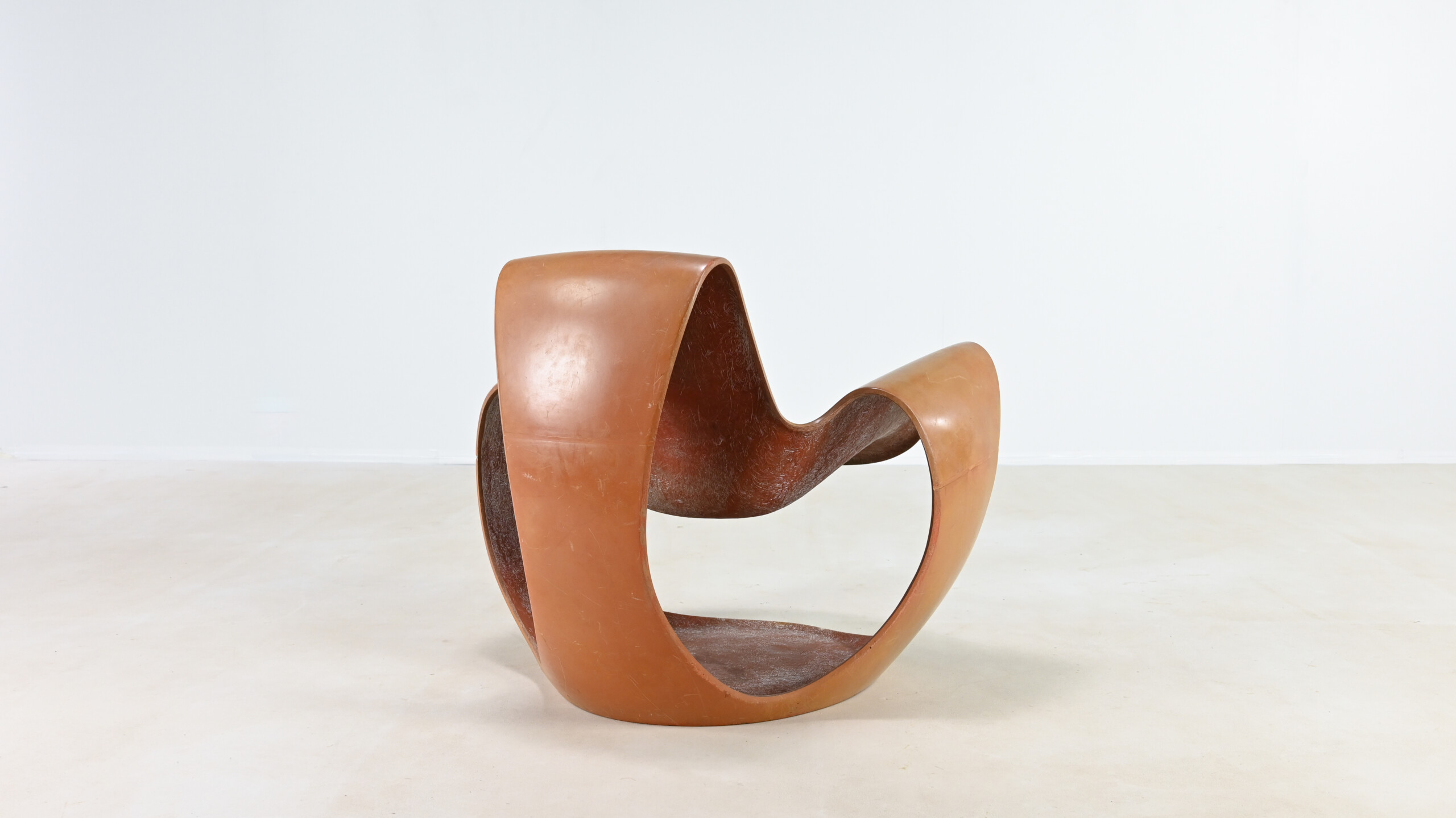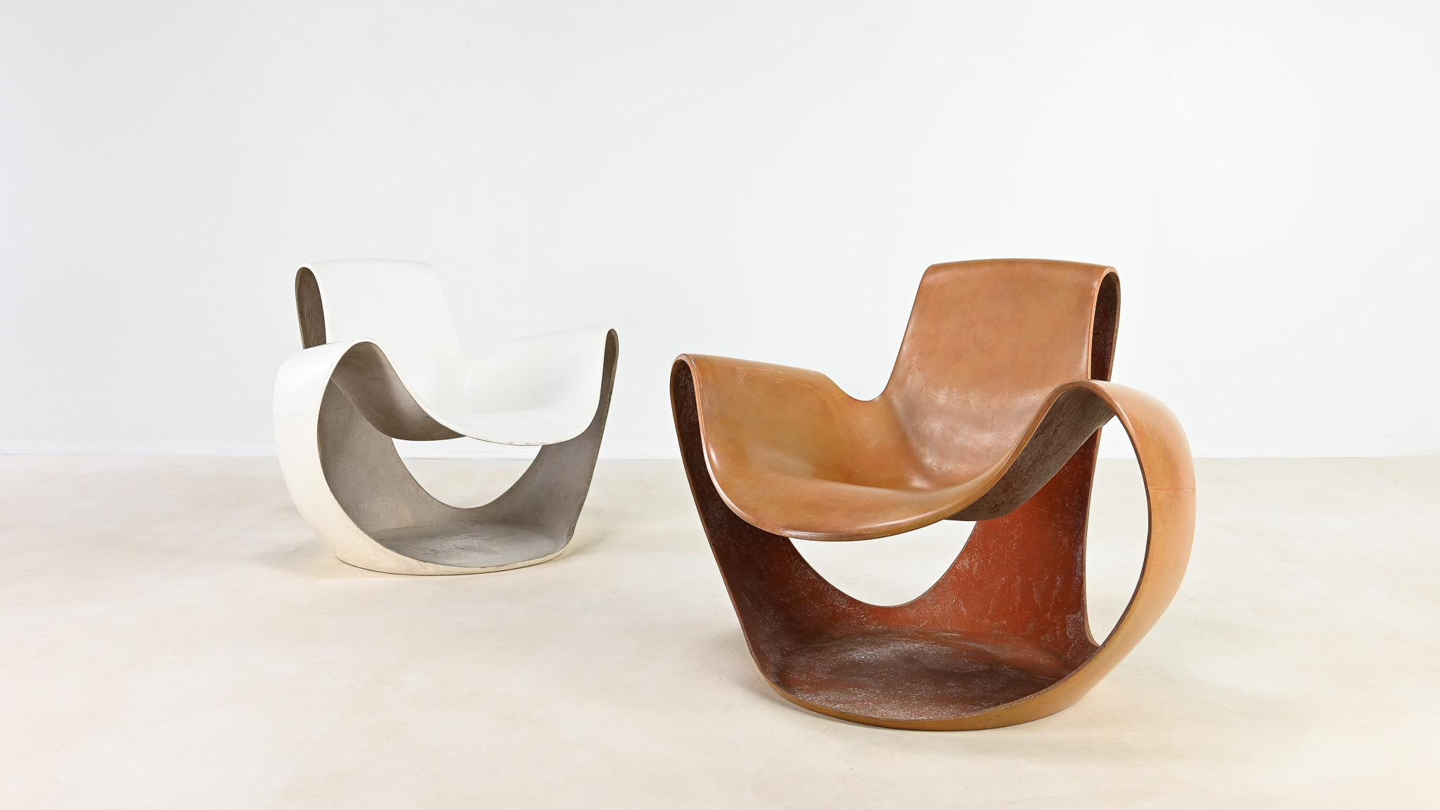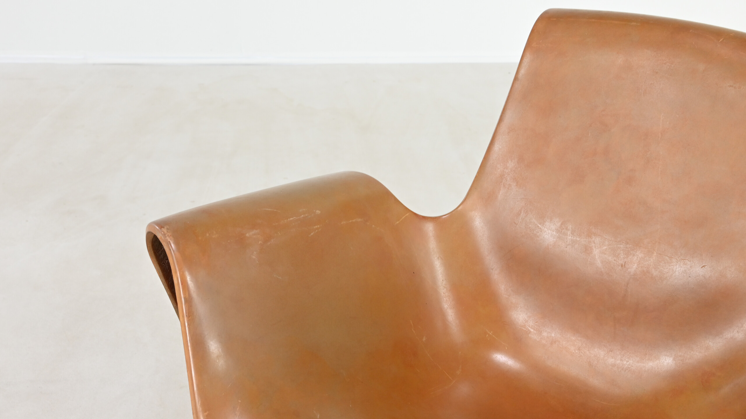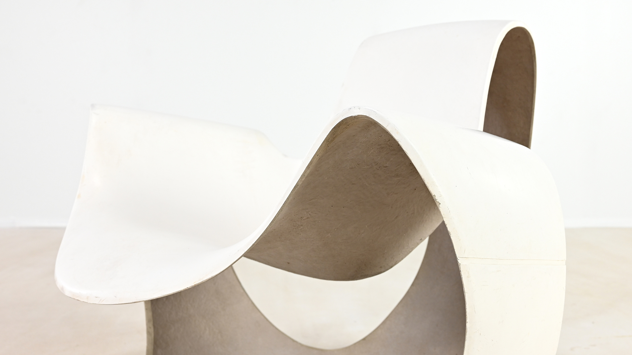 Produced in limited numbers, each chair consists of two resin shells, lacquered with Gelcoat. This listing includes versions in white, sky blue, and orange. The interior retains a raw, textured surface—a result of the material constraints of the time—adding to its authenticity and charm. The Albatros stands out for its innovative use of molded fiberglass and resin, which allowed for its bold, ribbon-like shape. Each chair sits low to the ground and offers a surprisingly comfortable experience thanks to its enveloping silhouette and organic balance.