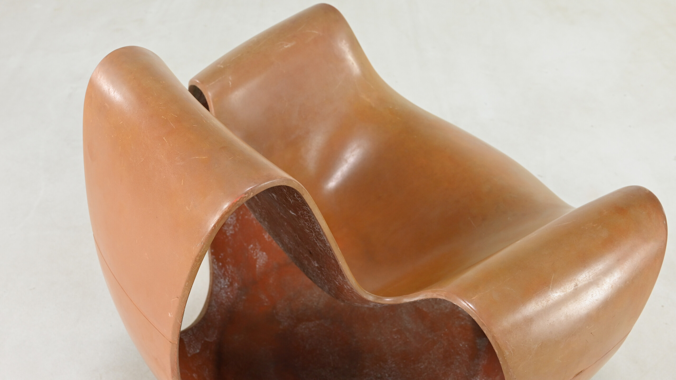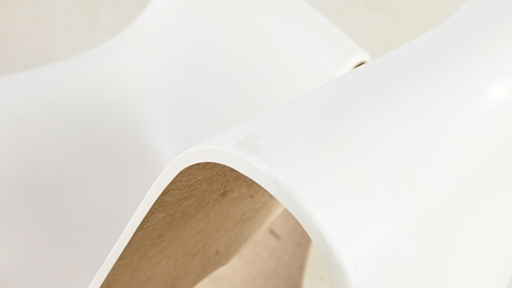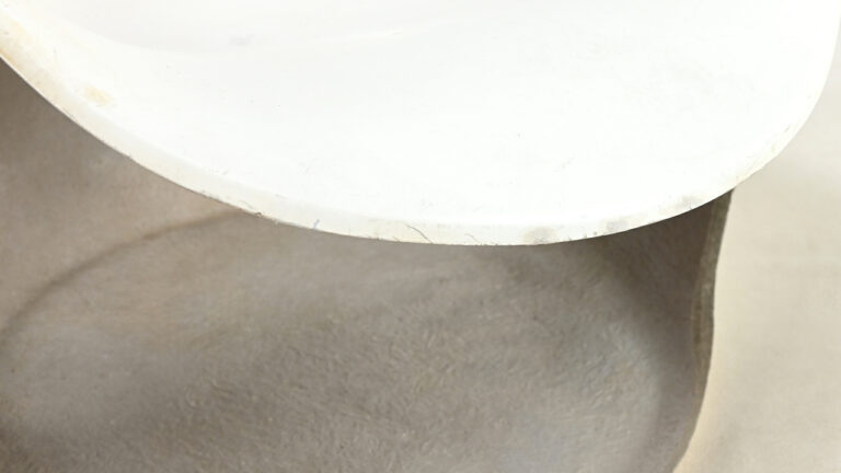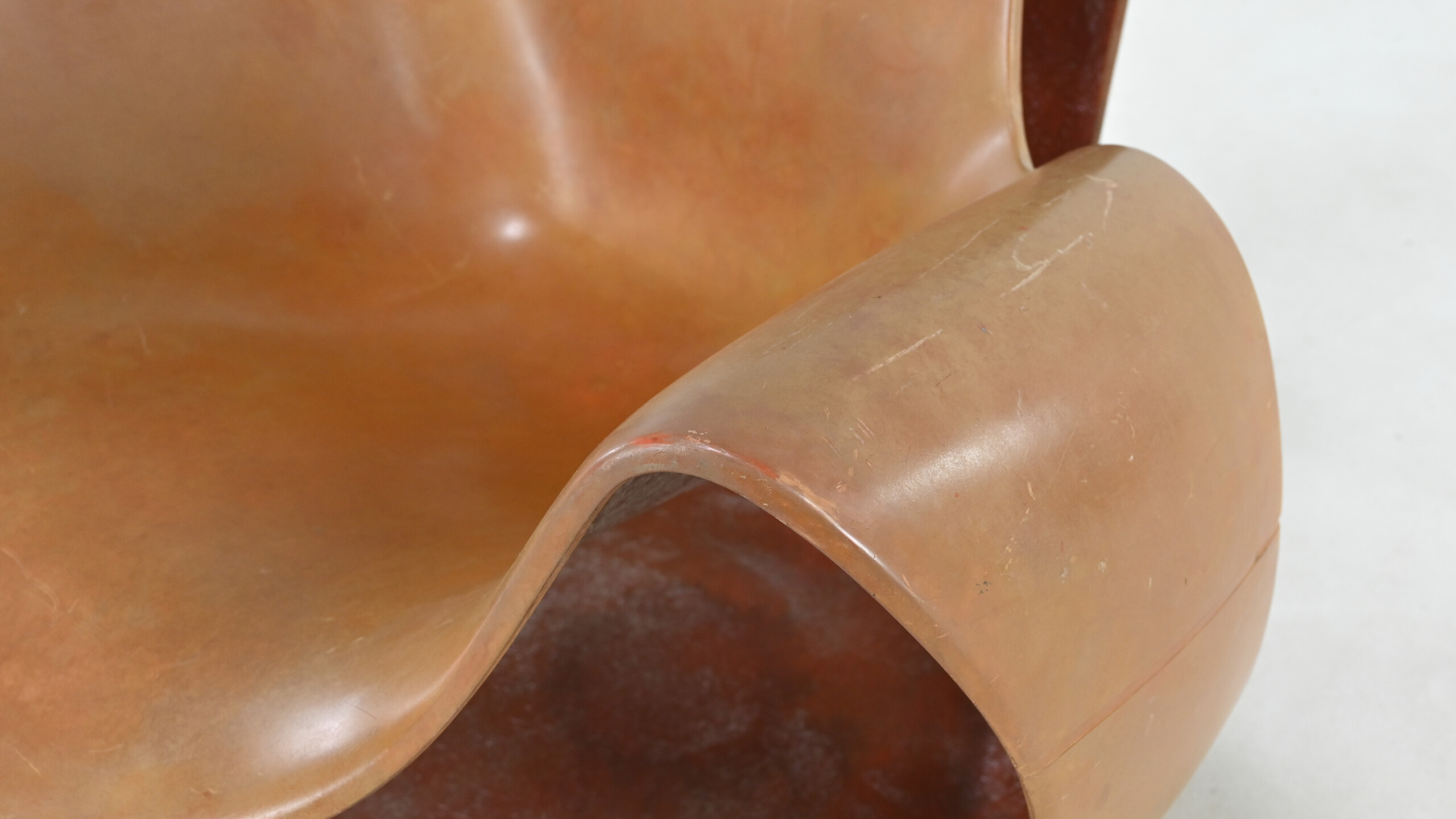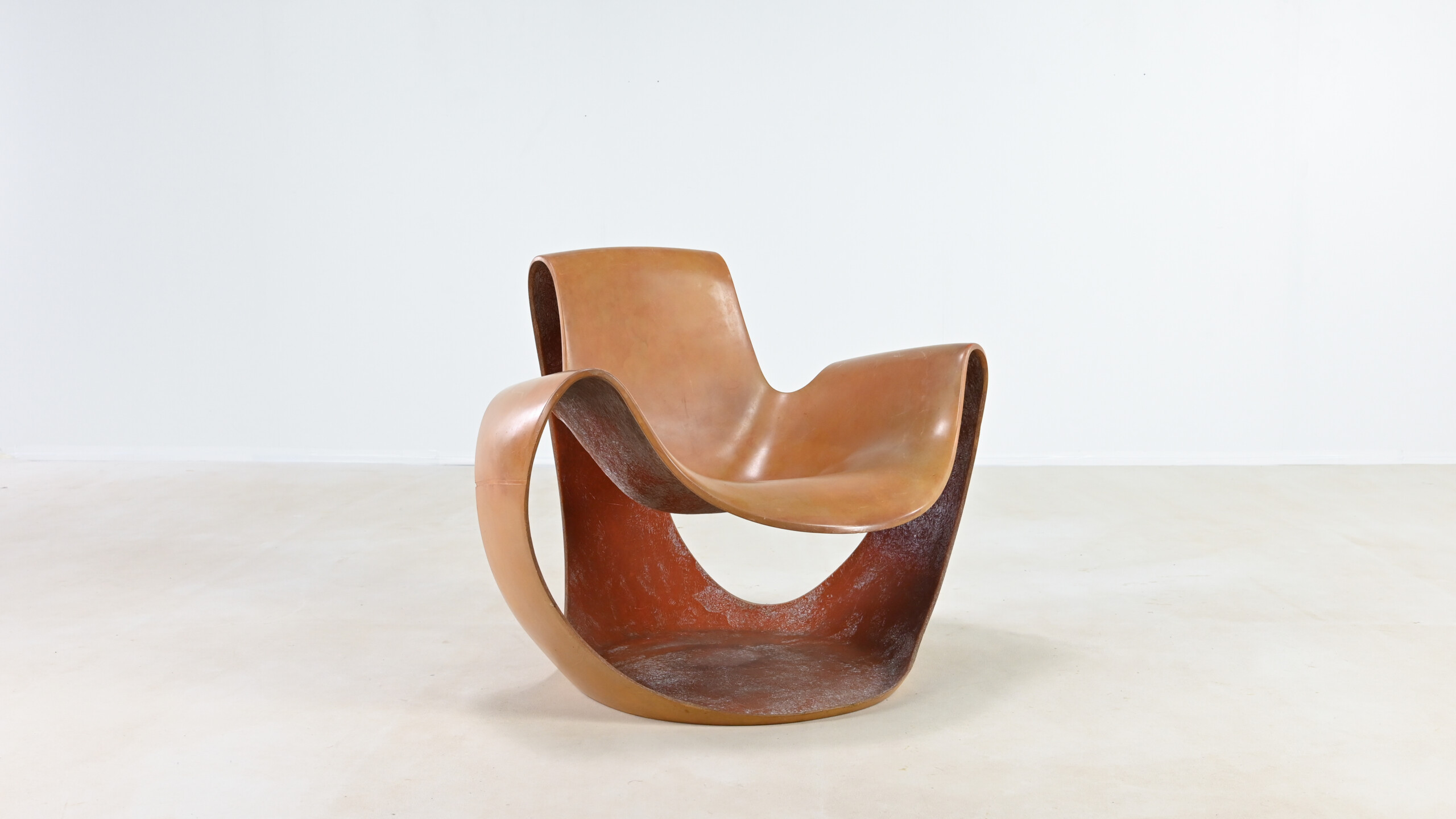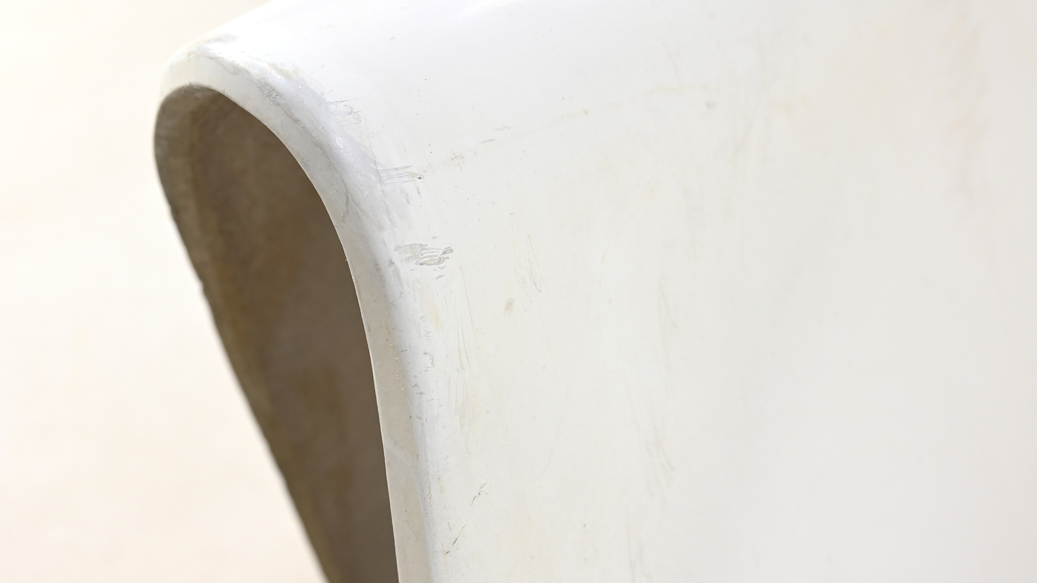 Produced in limited numbers, each chair consists of two resin shells, lacquered with Gelcoat. This listing includes versions in white, sky blue, and orange. The interior retains a raw, textured surface—a result of the material constraints of the time—adding to its authenticity and charm. The Albatros stands out for its innovative use of molded fiberglass and resin, which allowed for its bold, ribbon-like shape. Each chair sits low to the ground and offers a surprisingly comfortable experience thanks to its enveloping silhouette and organic balance.