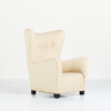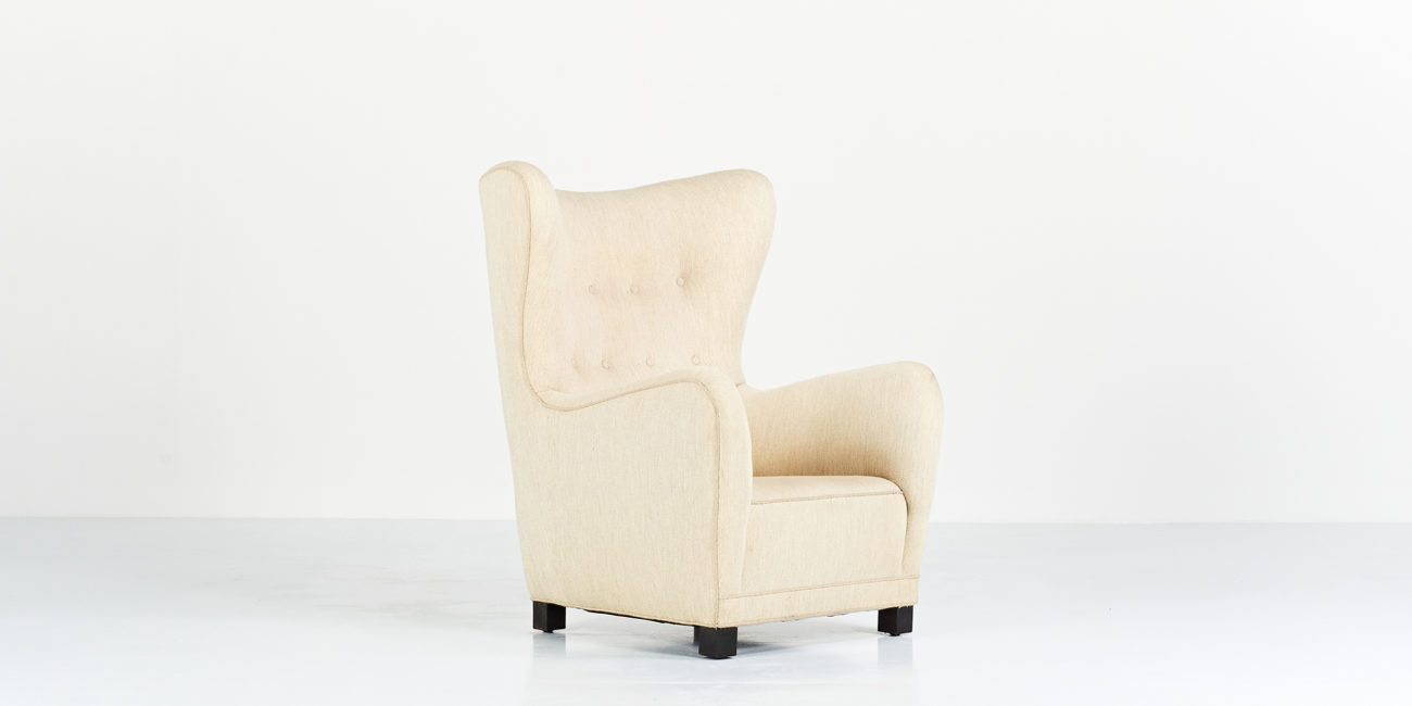 Wing chair model FH 1672, produced by Fritz Hansen during the 1940s. This armchair, with voluptuous curves, is here upholstered in its original beige woolen fabric, and rests on an ebony stained beech base. Small traces of use, very good general condition. Seat height: 36cm.