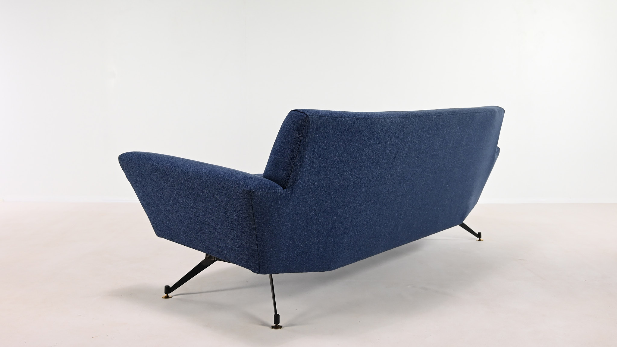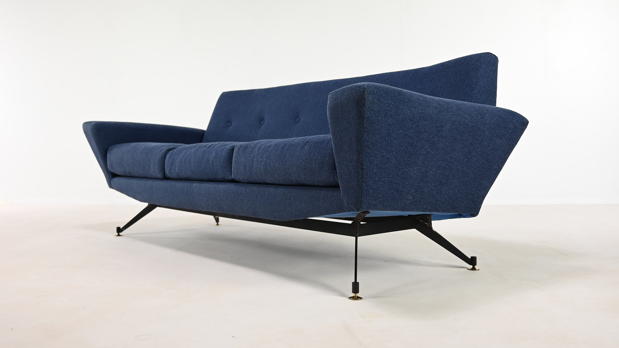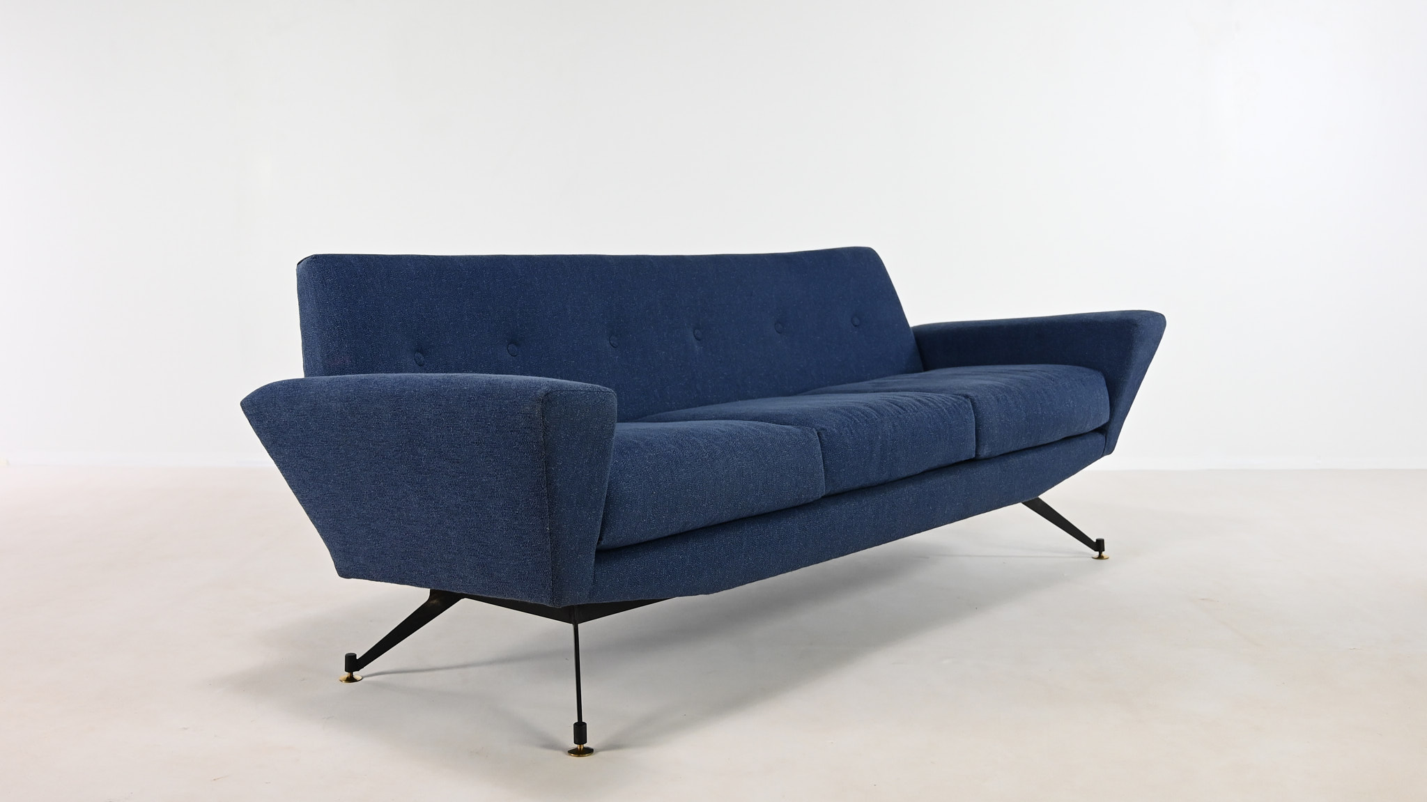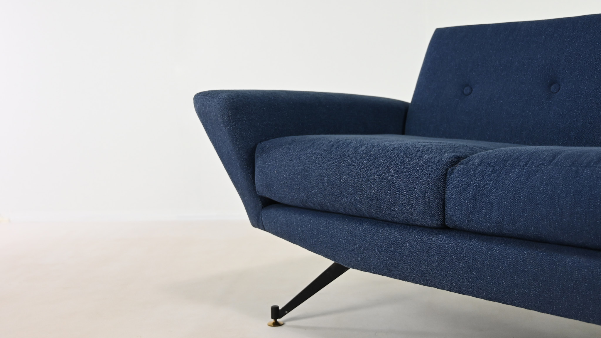 Beautiful sofa manufactured by Lenzi in Italy during the 1950s. This comfortable piece features exceptional proportions and a distinctive design with its modernist lines. The base shows traces of use and patina of time, while the blue upholstery remains in very good condition, aside from two subtle reddish discolorations on the backrest (see photos). Seat height: 44 cm.