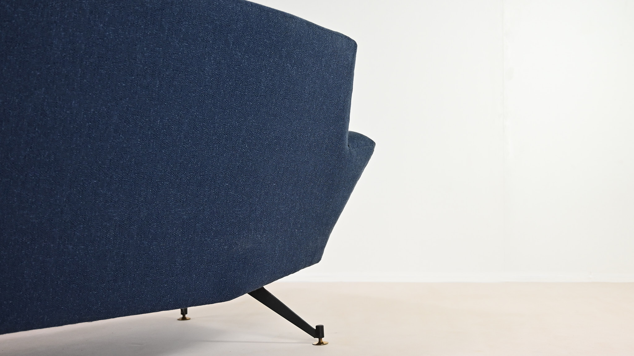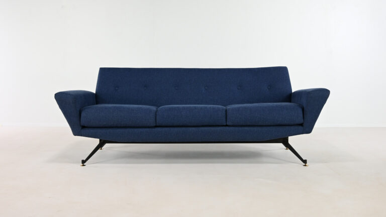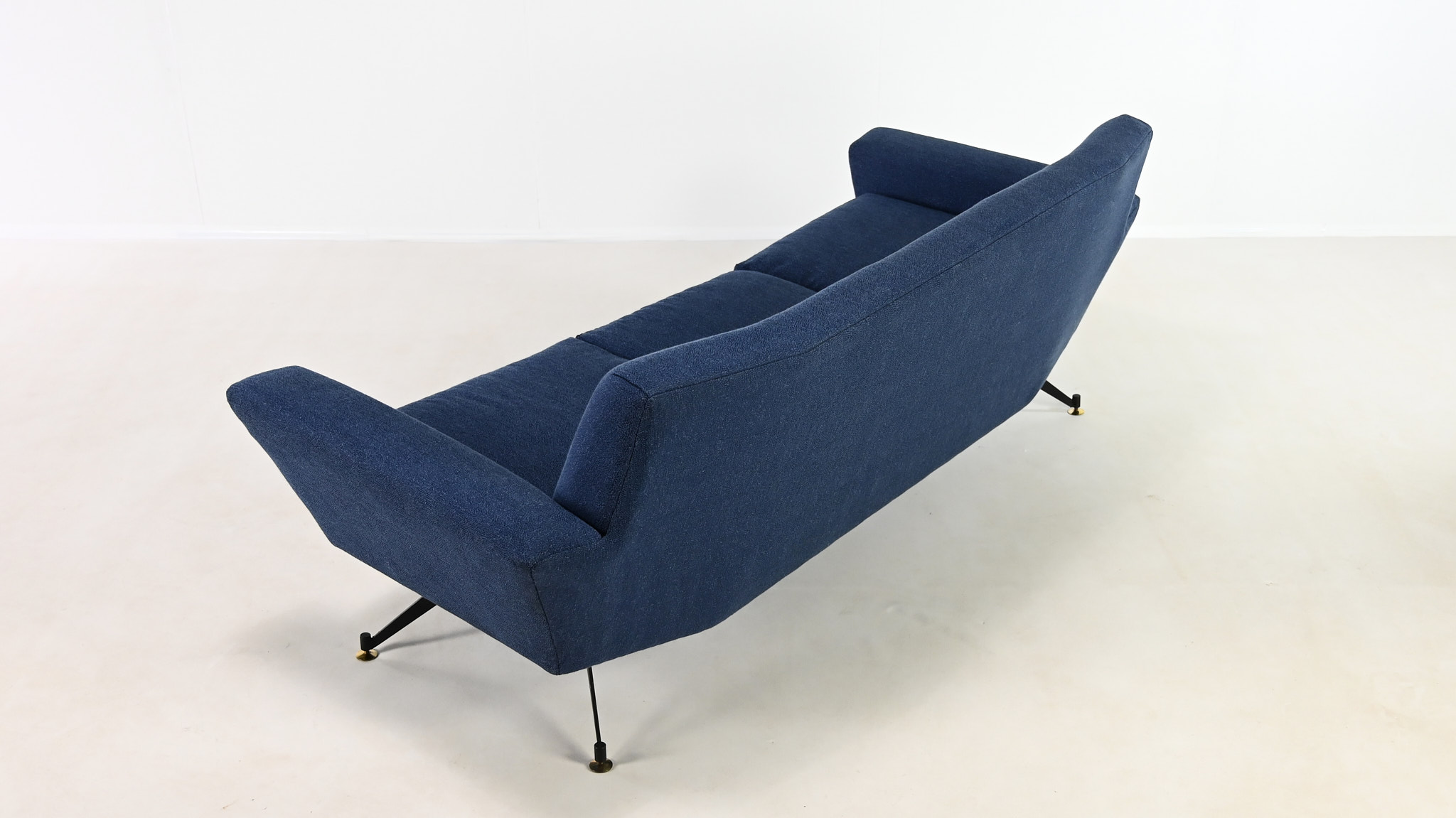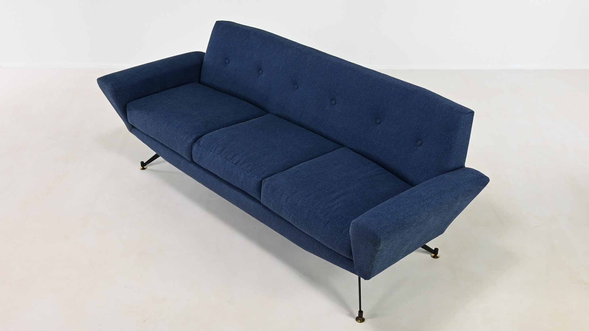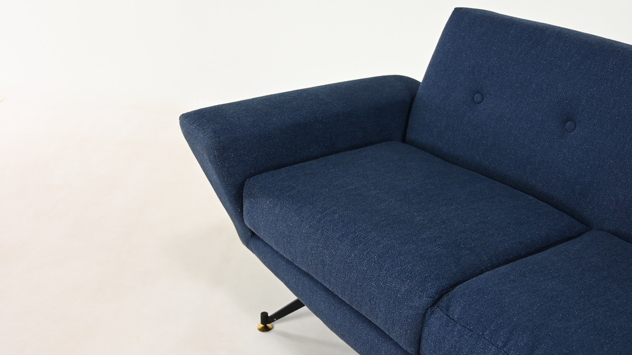 Beautiful sofa manufactured by Lenzi in Italy during the 1950s. This comfortable piece features exceptional proportions and a distinctive design with its modernist lines. The base shows traces of use and patina of time, while the blue upholstery remains in very good condition, aside from two subtle reddish discolorations on the backrest (see photos). Seat height: 44 cm.