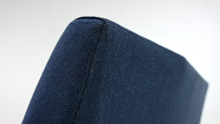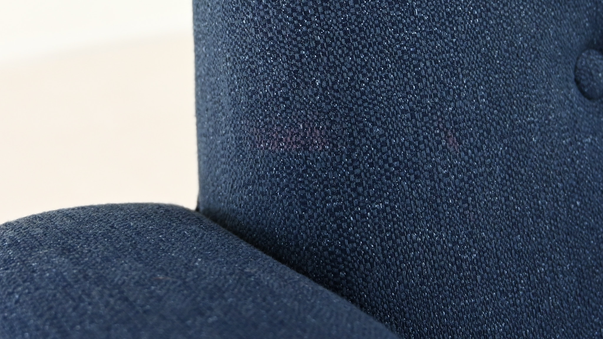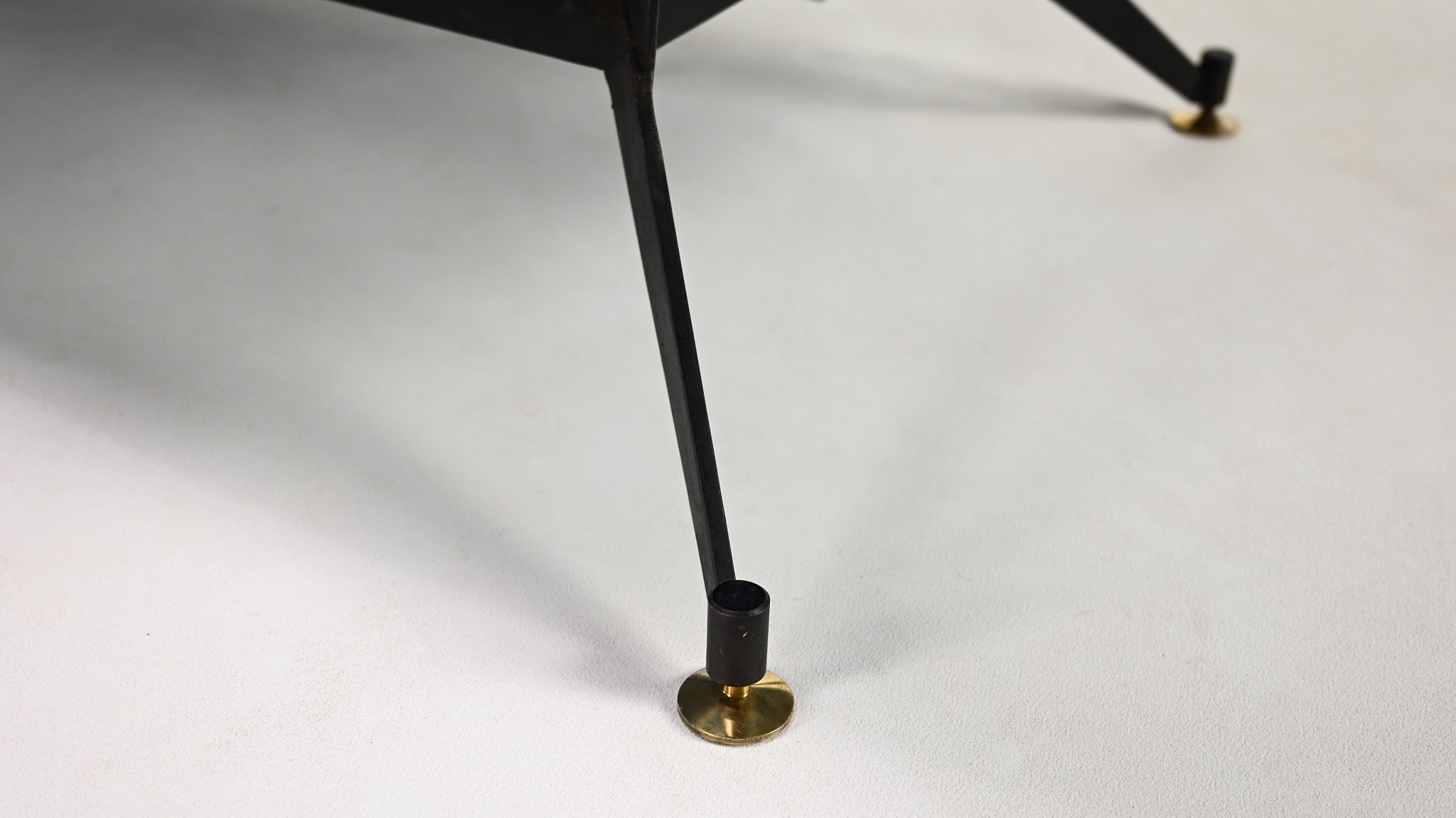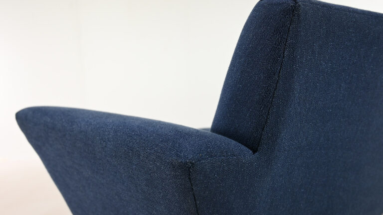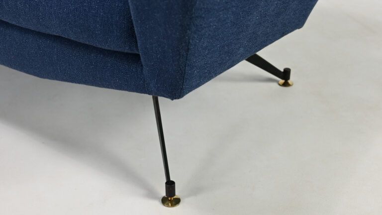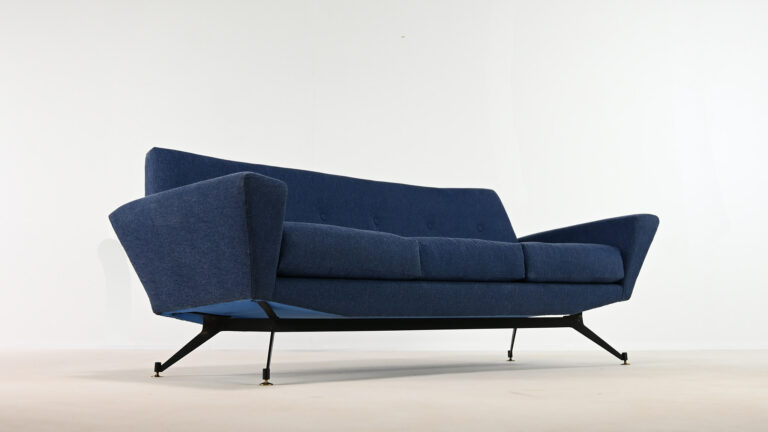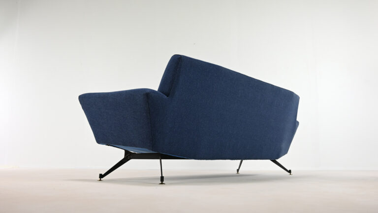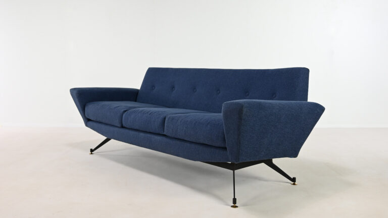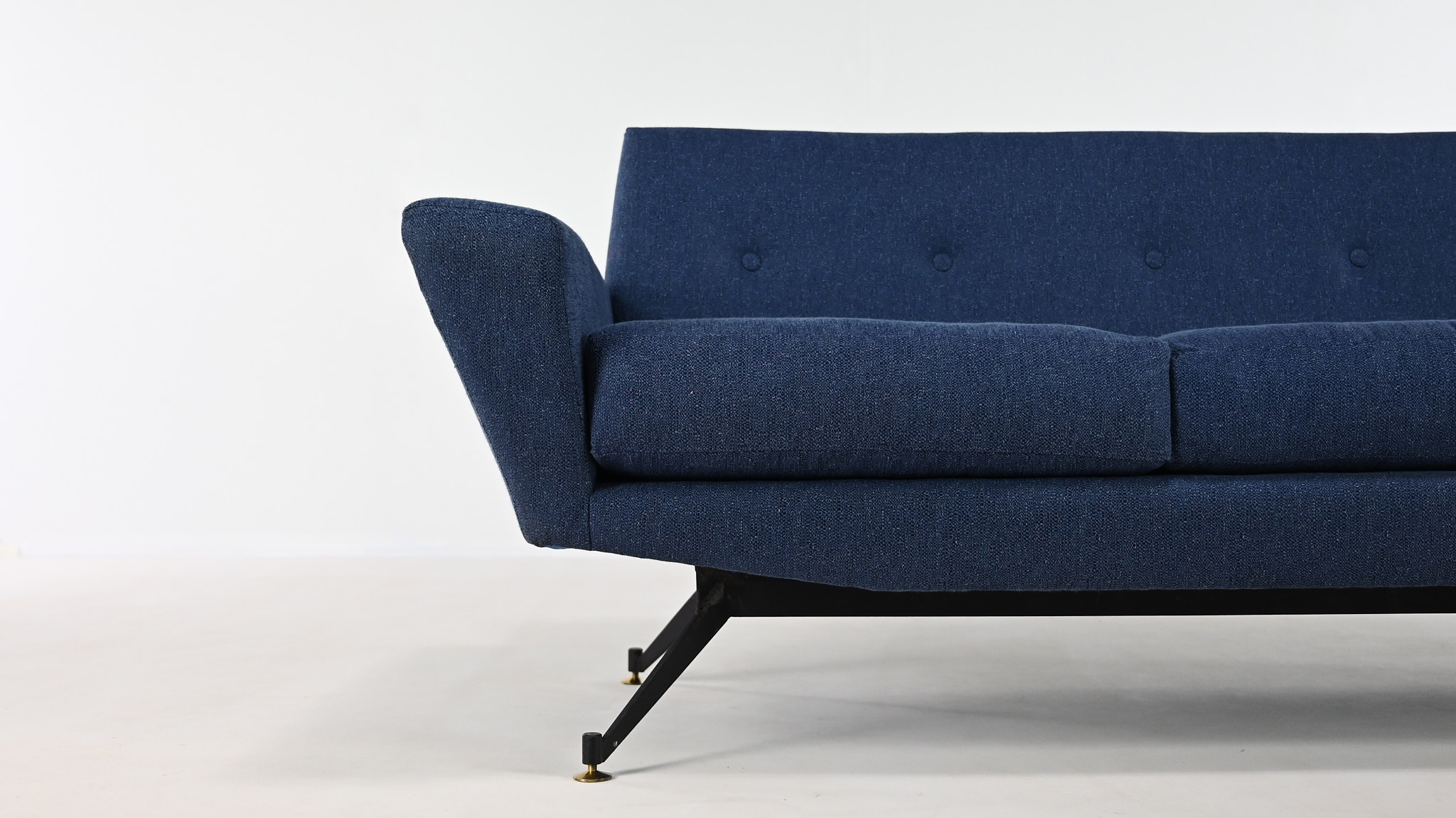 Beautiful sofa manufactured by Lenzi in Italy during the 1950s. This comfortable piece features exceptional proportions and a distinctive design with its modernist lines. The base shows traces of use and patina of time, while the blue upholstery remains in very good condition, aside from two subtle reddish discolorations on the backrest (see photos). Seat height: 44 cm.