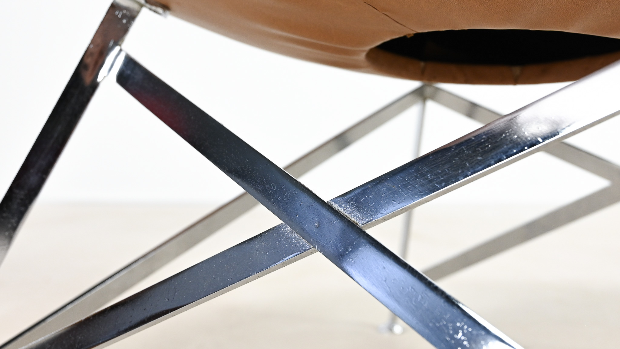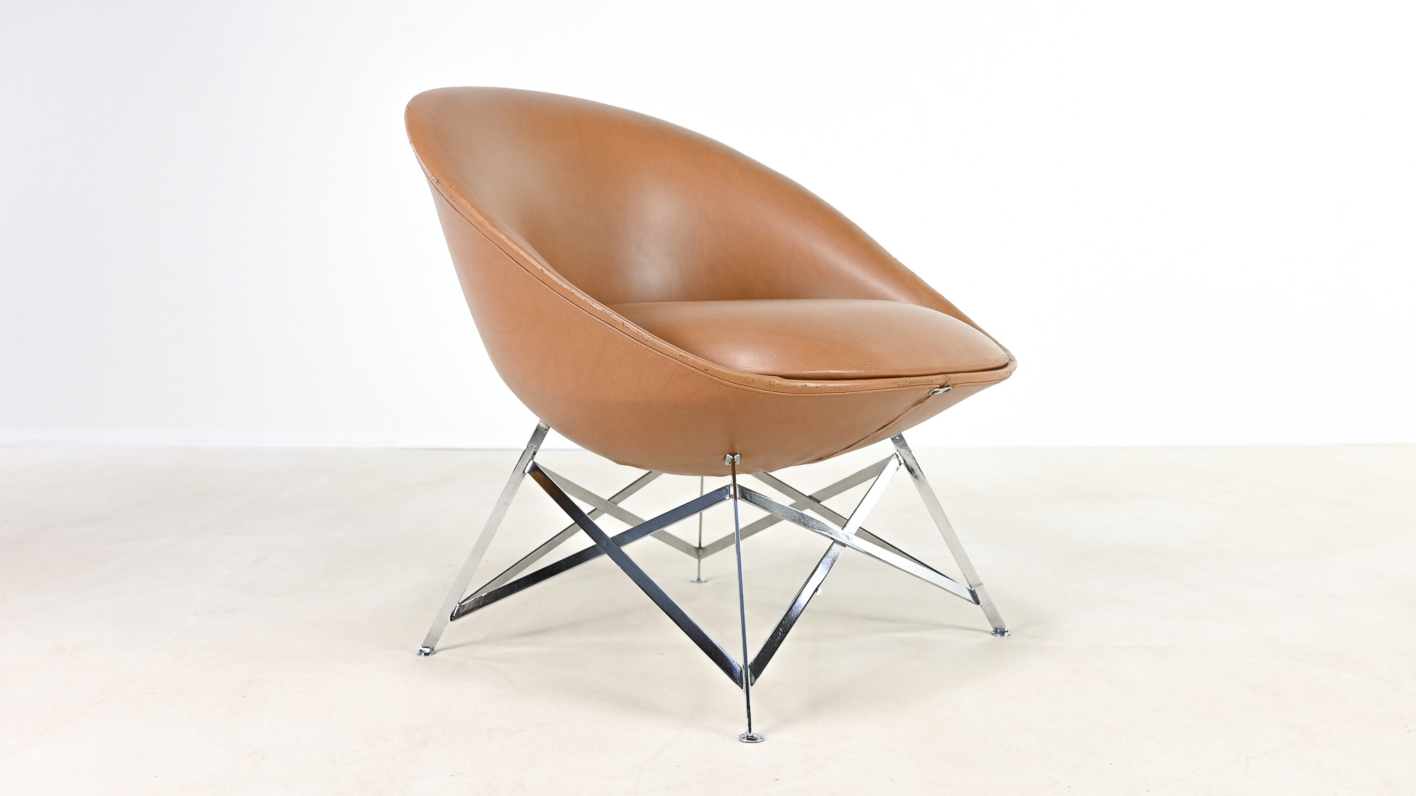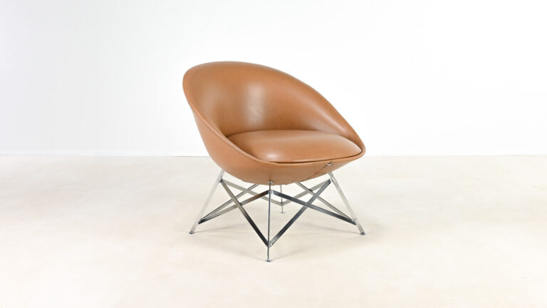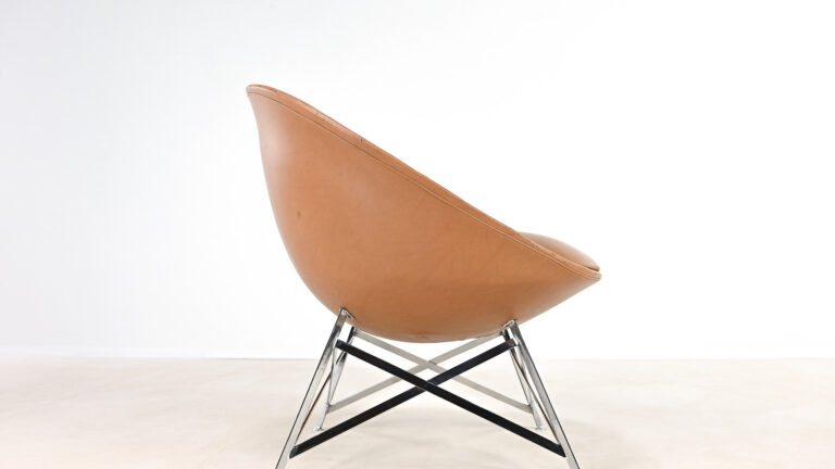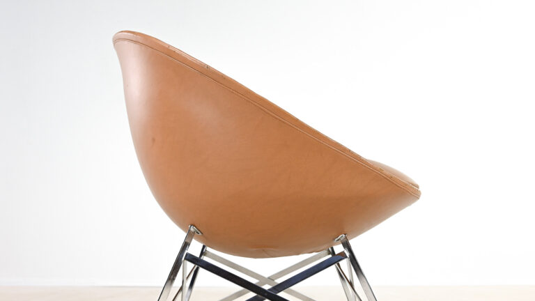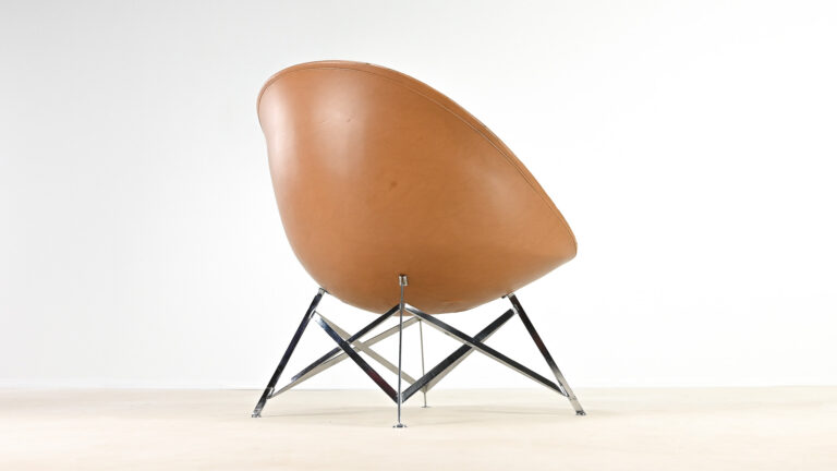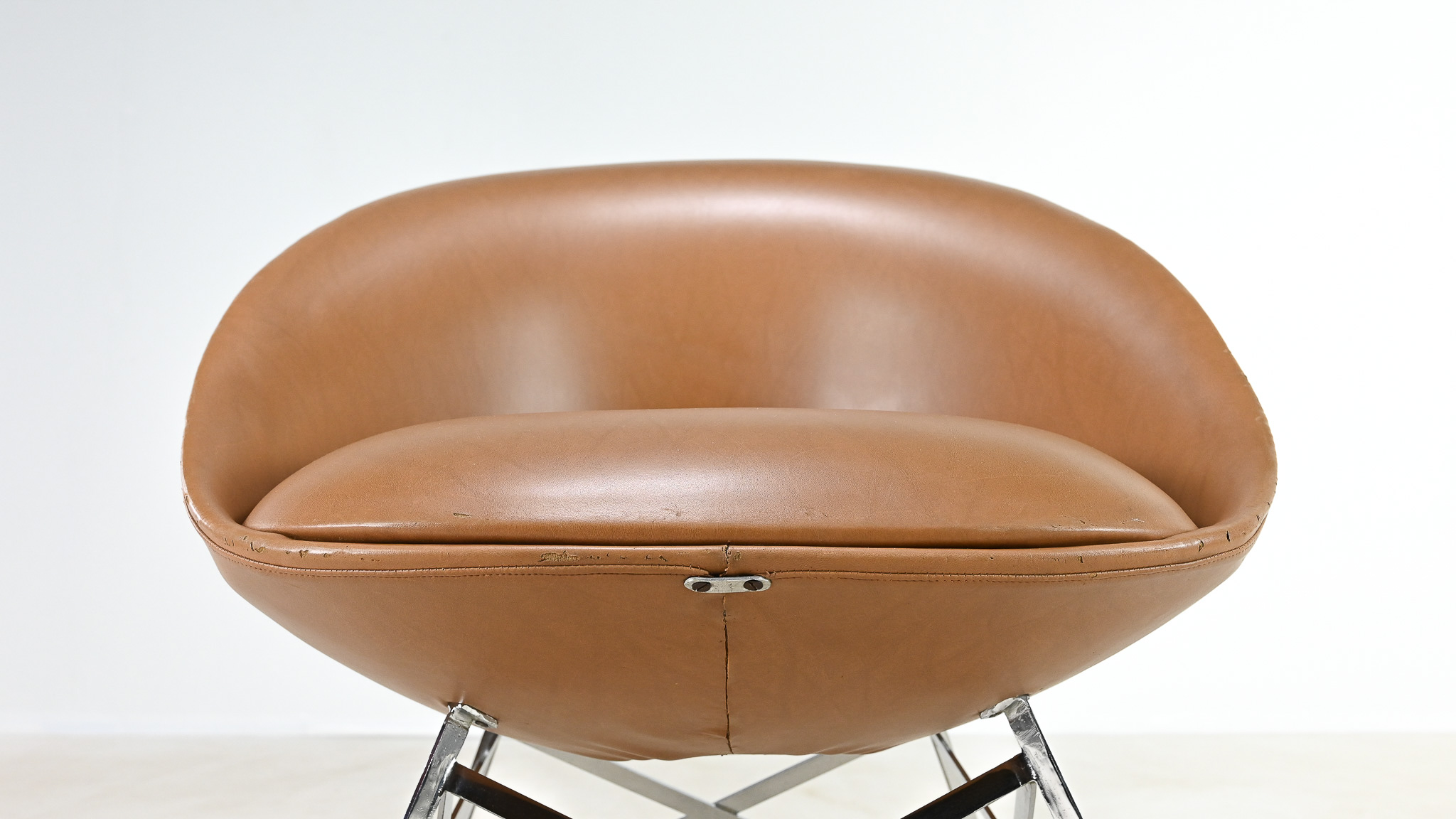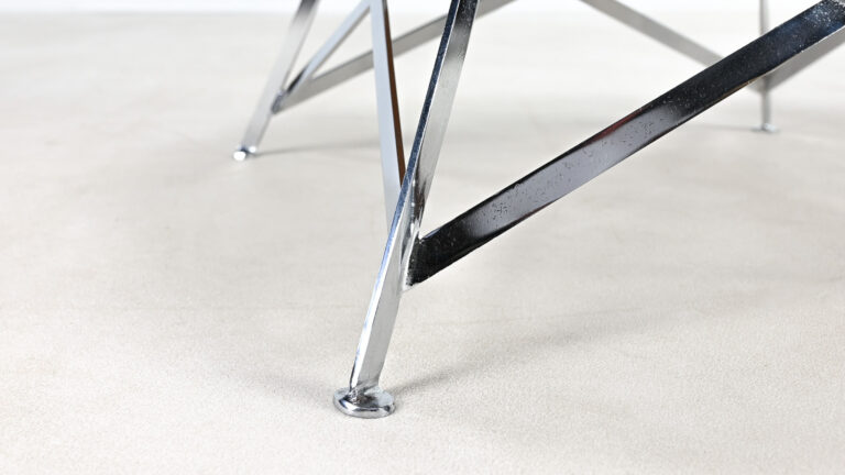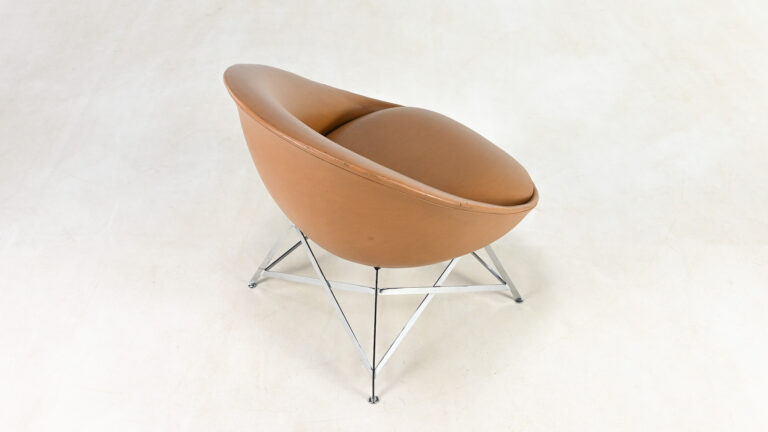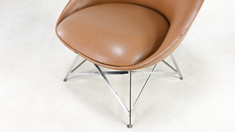 This example is a rare variant of the K1 chair, more commonly found with the circular “DS wheel” base. It features a resin and fiberglass shell, upholstered in polyvinyl stretched over latex foam, resting on a chromed steel base known as the “Tour Eiffel.” Calka drew inspiration for this structure from the work of Charles and Ray Eames, whom he greatly admired.