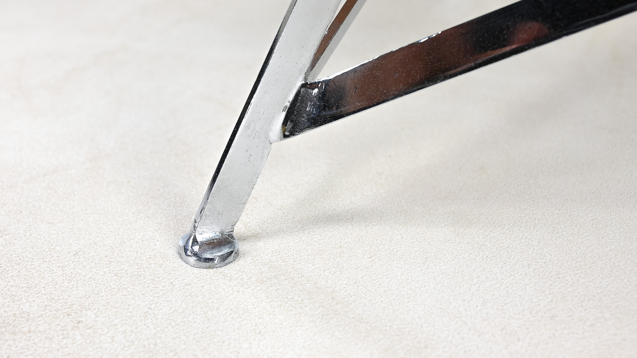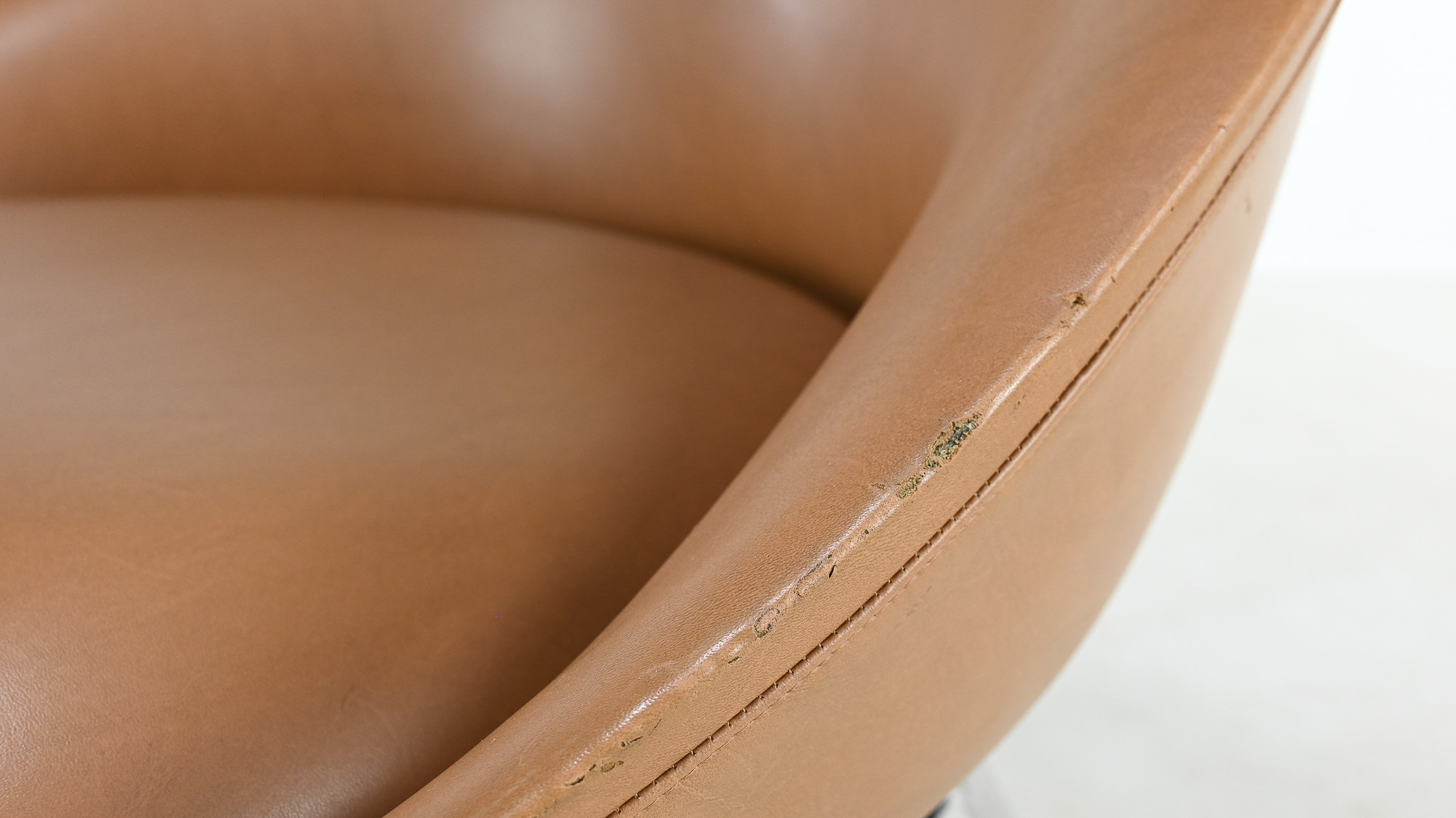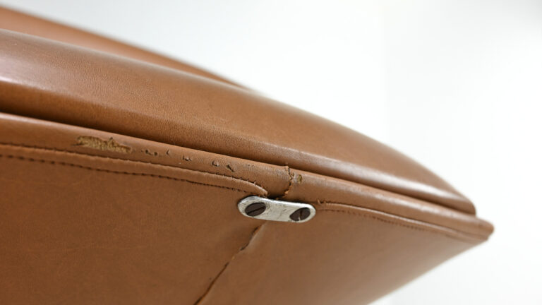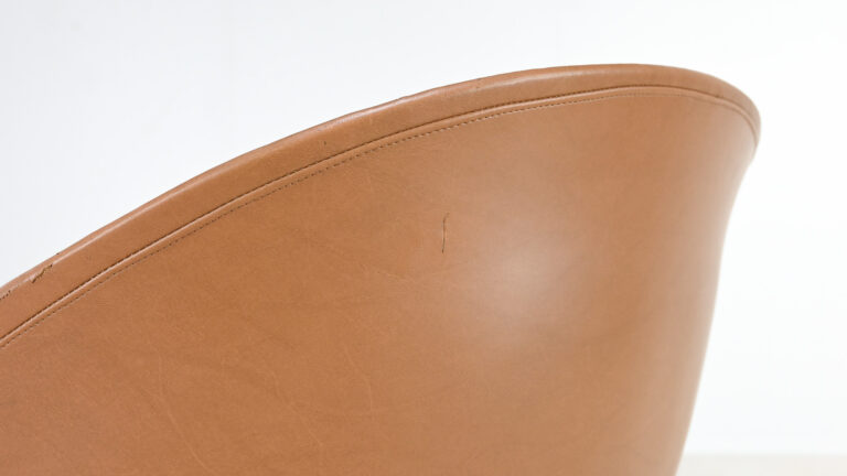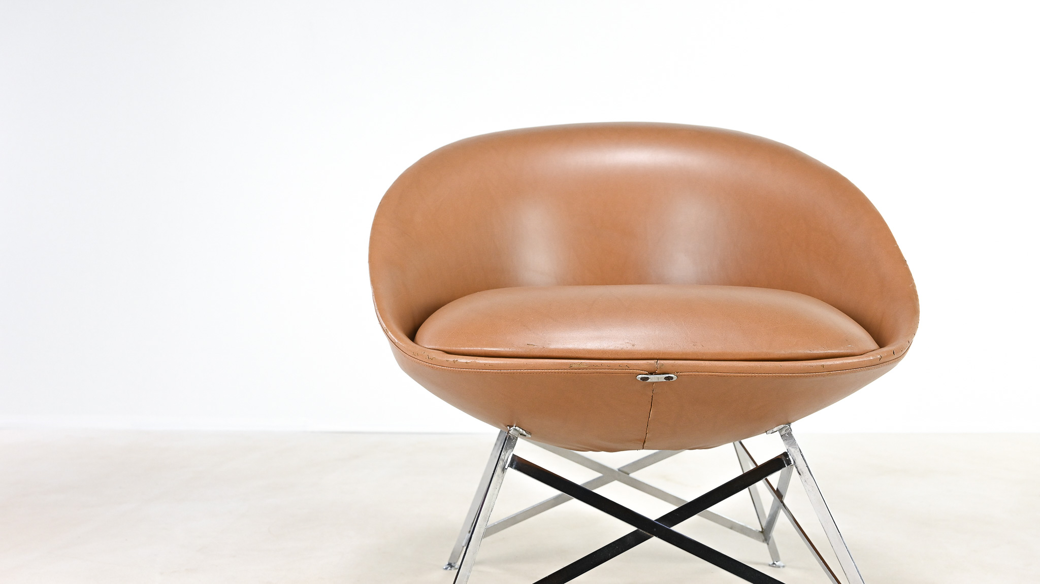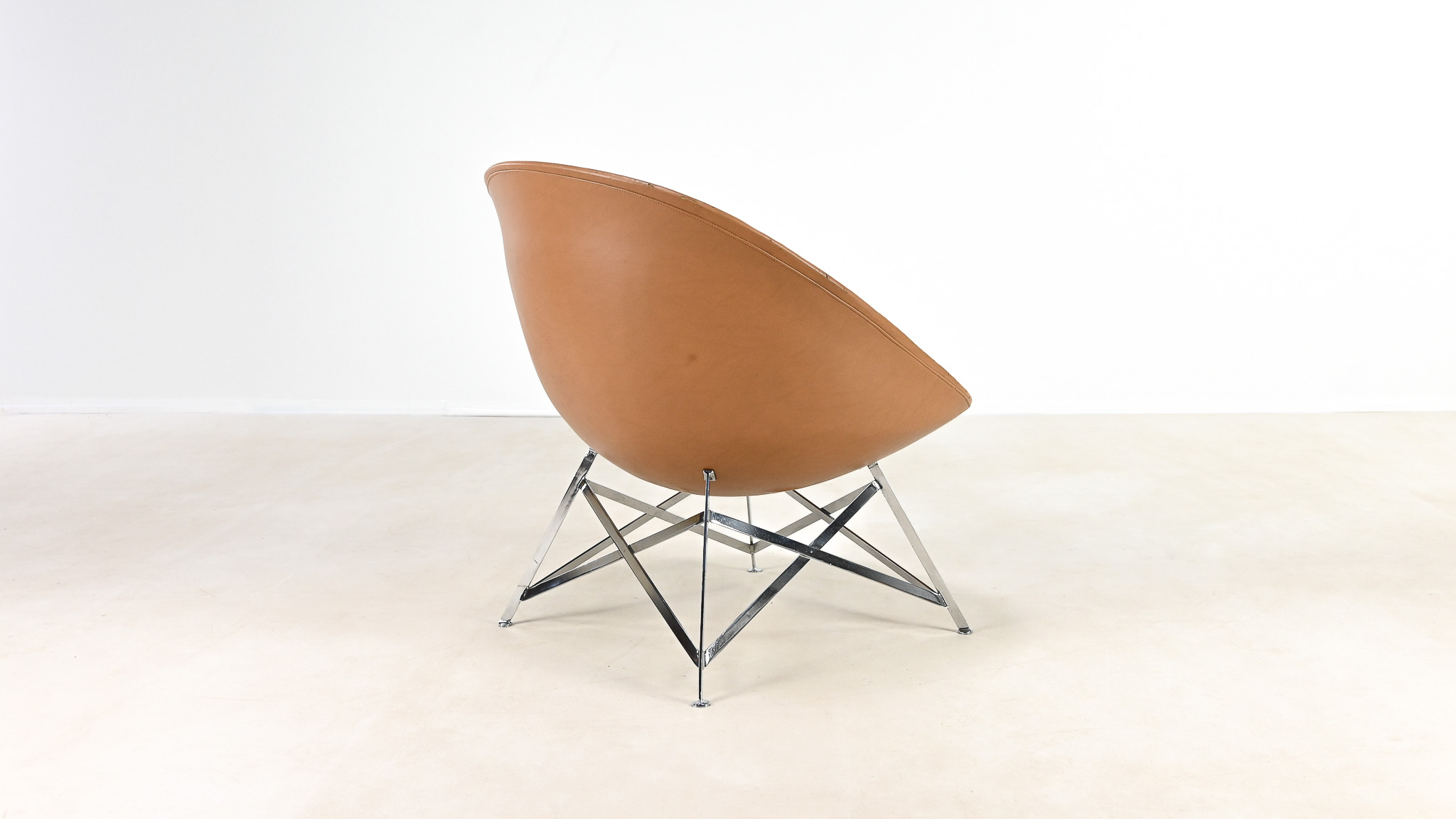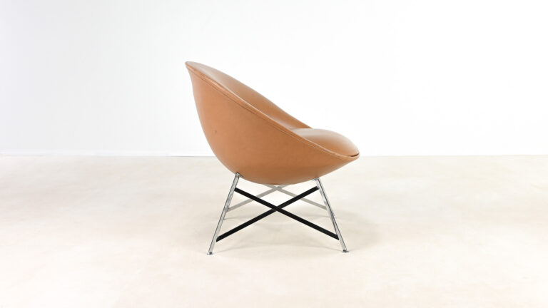 This example is a rare variant of the K1 chair, more commonly found with the circular “DS wheel” base. It features a resin and fiberglass shell, upholstered in polyvinyl stretched over latex foam, resting on a chromed steel base known as the “Tour Eiffel.” Calka drew inspiration for this structure from the work of Charles and Ray Eames, whom he greatly admired.