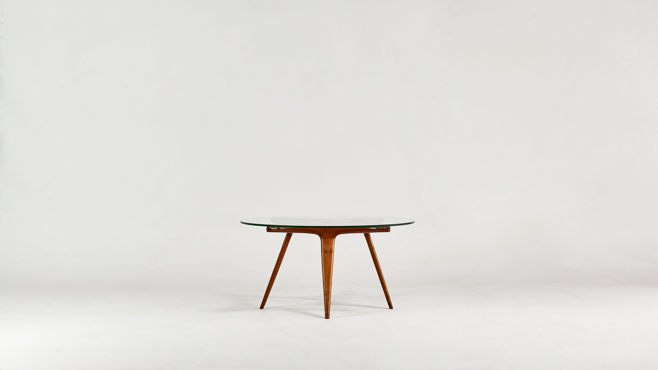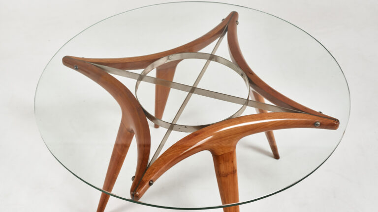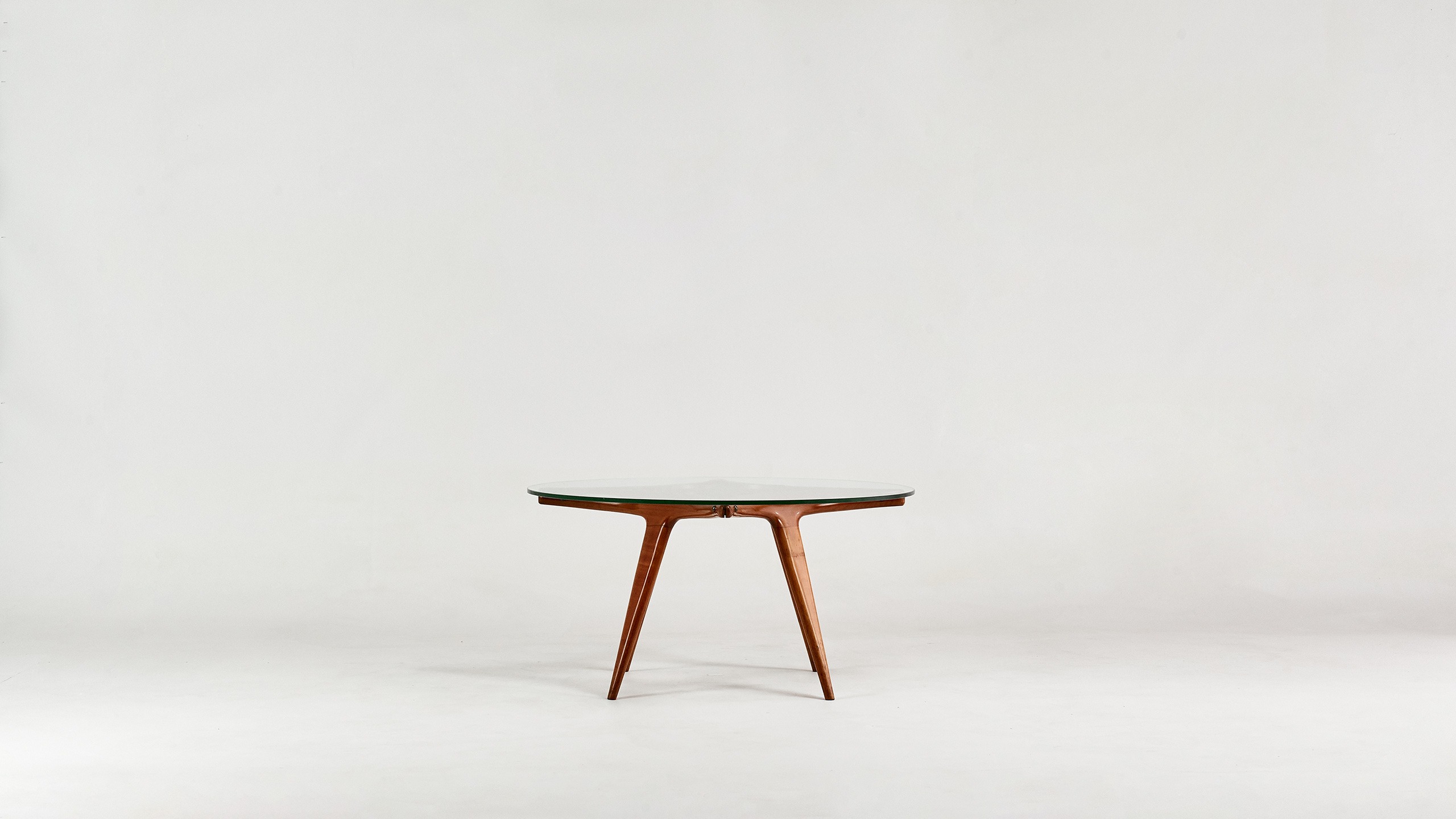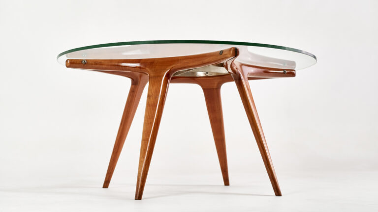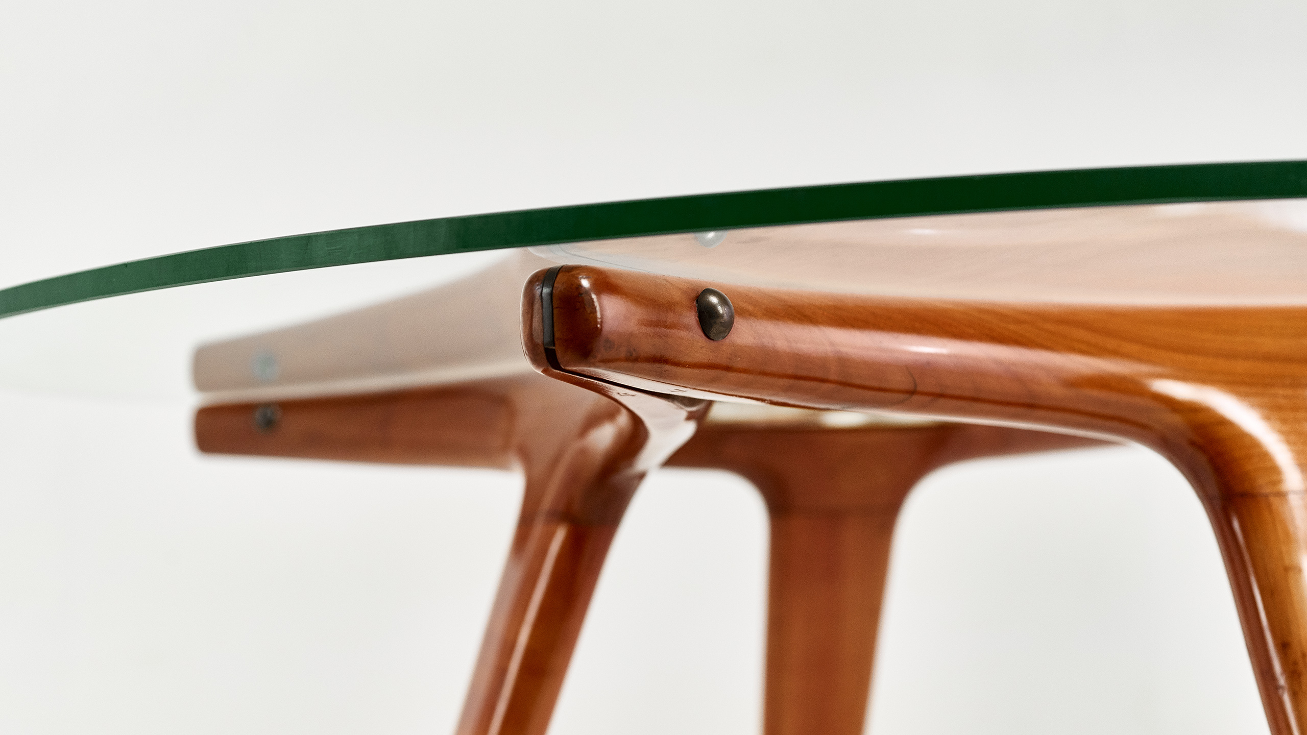 Extremely rare coffee table, also called either “occasional” or “cocktail” table, from the Italian master Gio Ponti. It consists of a round glass top resting on a structure in varnished cherry wood, enhanced with brass. Small flaws and patina of use, very good general condition. This table model, exceptional in design and with beautiful organic lines, was presented at the 20th century decorative arts sale at Sotheby’s on November 4, 1999, during which it doubled the estimate (Hammer price at the time: £ 2,800; with fees: £ 3,220, i.e. € 5,034, source: Artprice). The sale catalog is available on request.