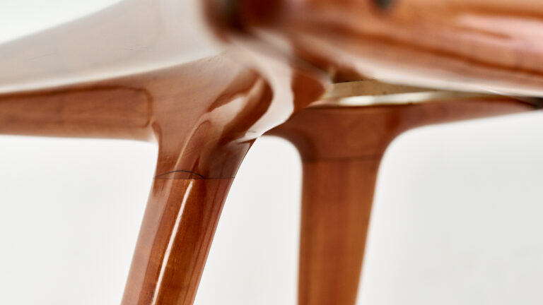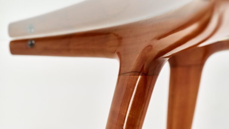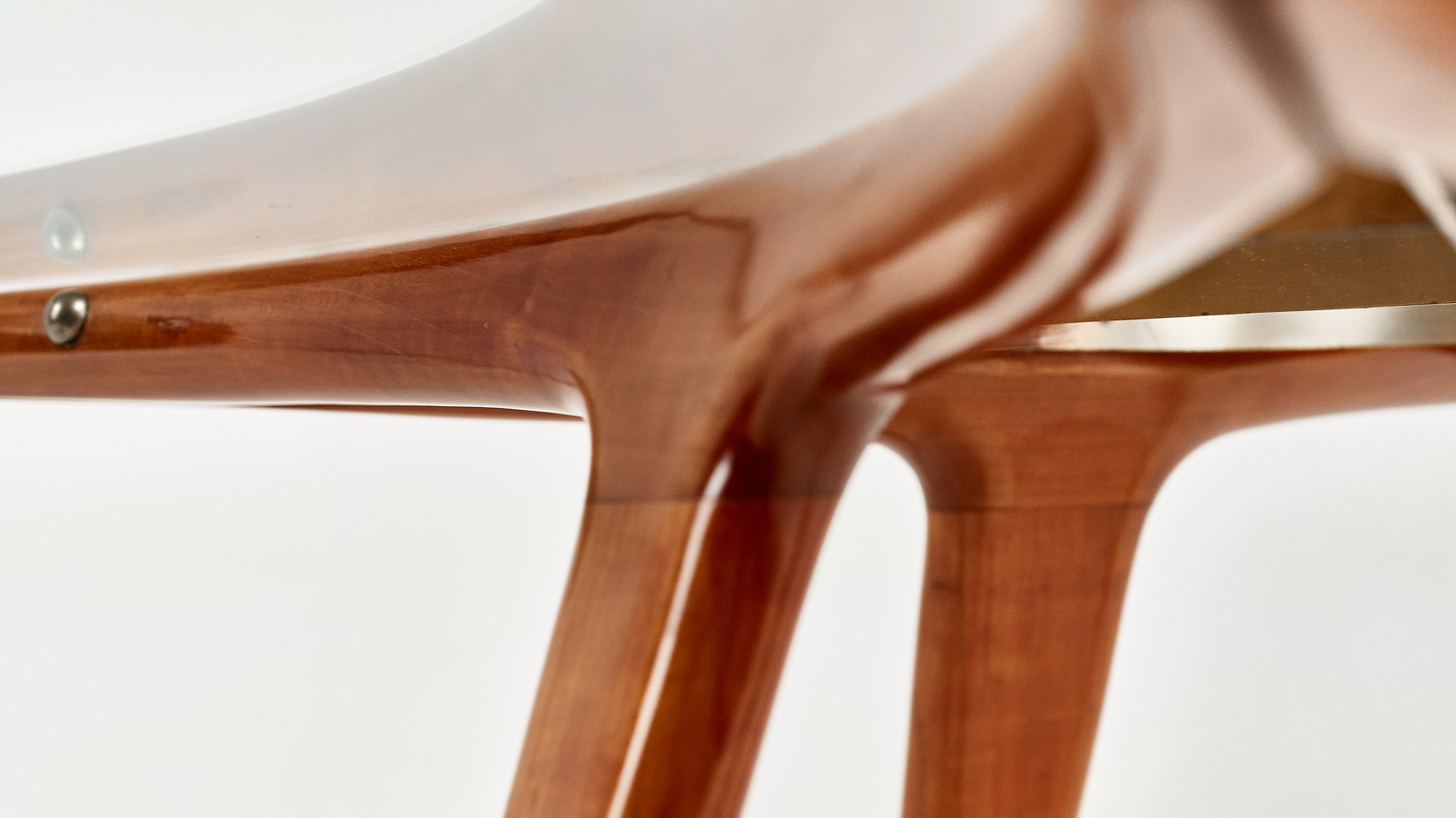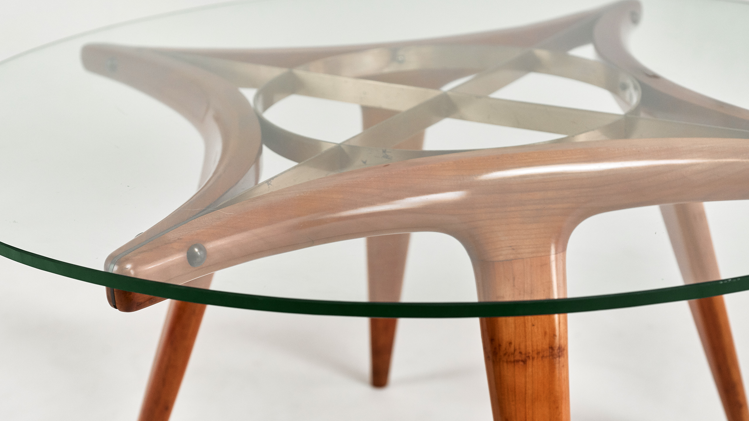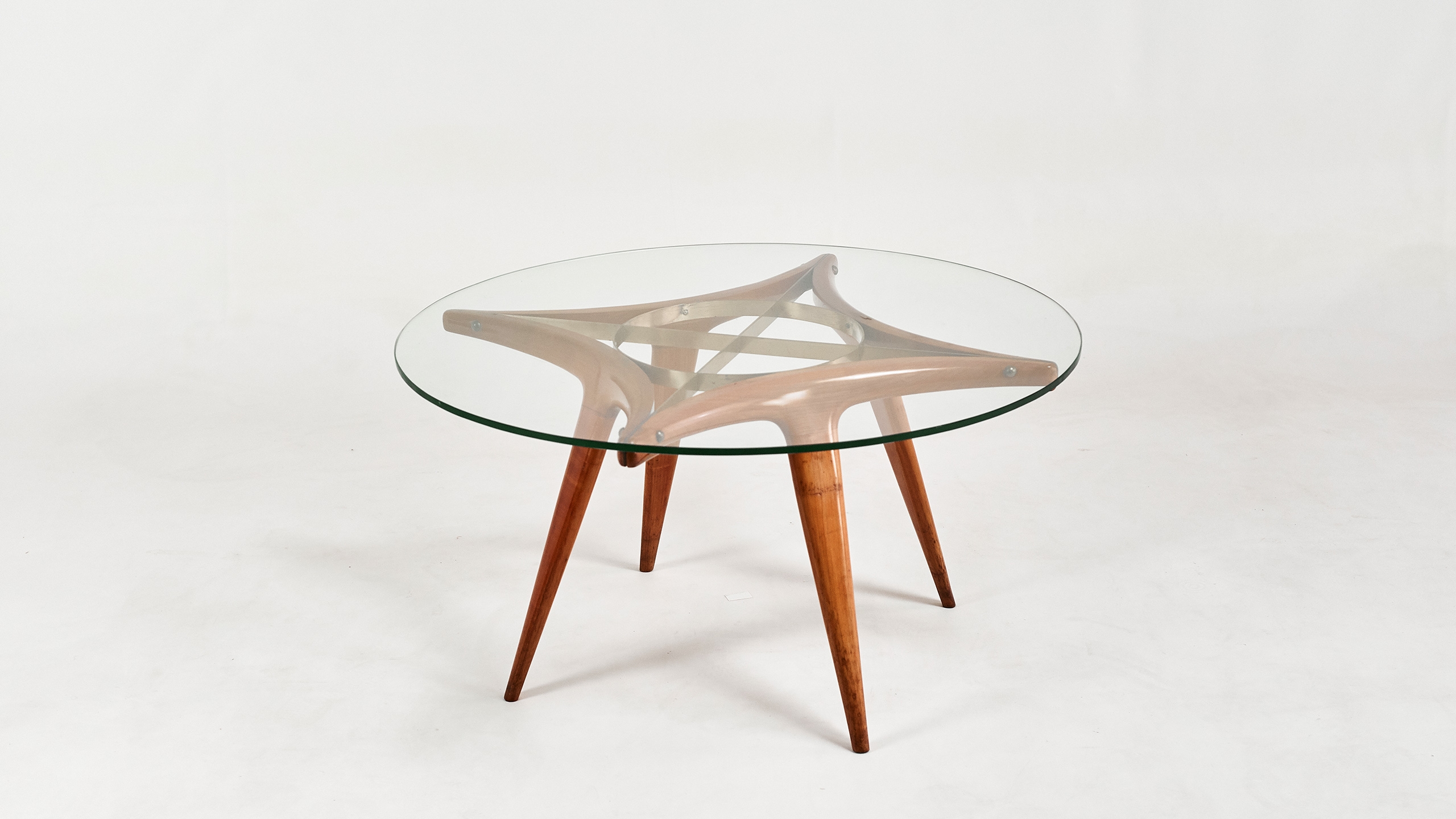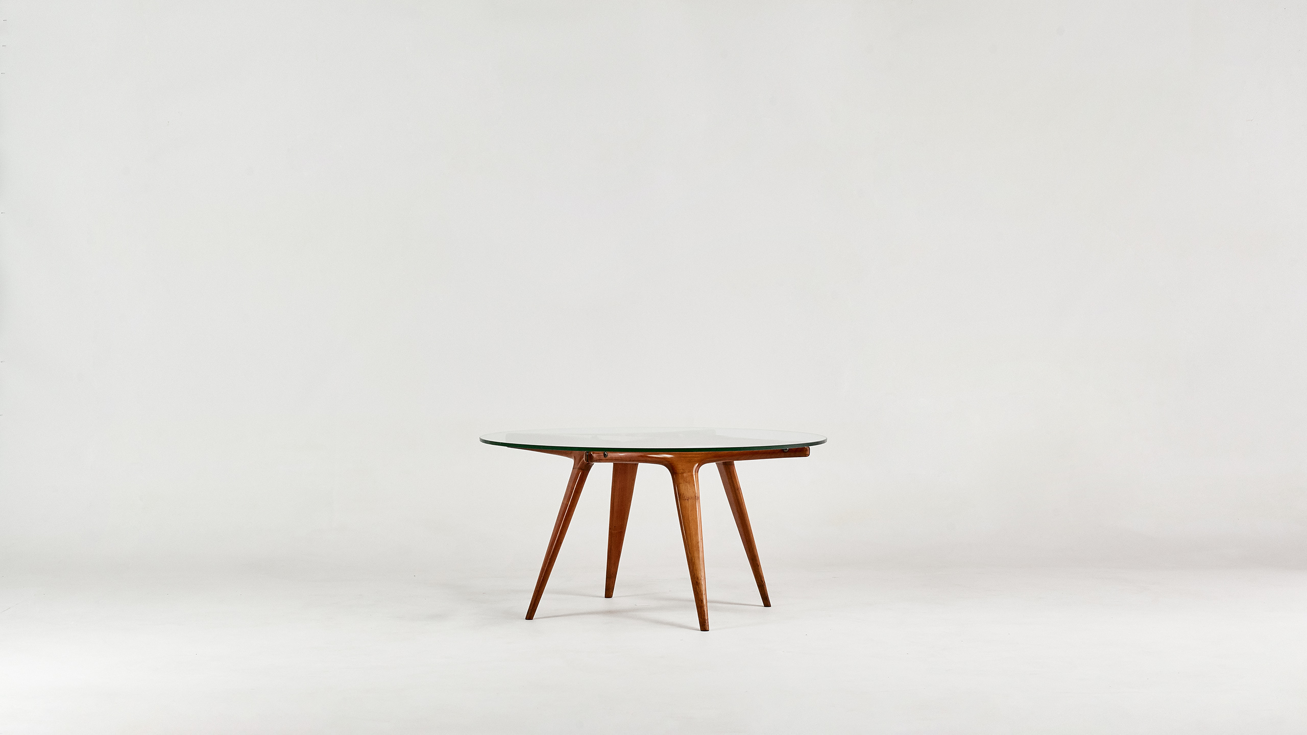 Extremely rare coffee table, also called either “occasional” or “cocktail” table, from the Italian master Gio Ponti. It consists of a round glass top resting on a structure in varnished cherry wood, enhanced with brass. Small flaws and patina of use, very good general condition. This table model, exceptional in design and with beautiful organic lines, was presented at the 20th century decorative arts sale at Sotheby’s on November 4, 1999, during which it doubled the estimate (Hammer price at the time: £ 2,800; with fees: £ 3,220, i.e. € 5,034, source: Artprice). The sale catalog is available on request.