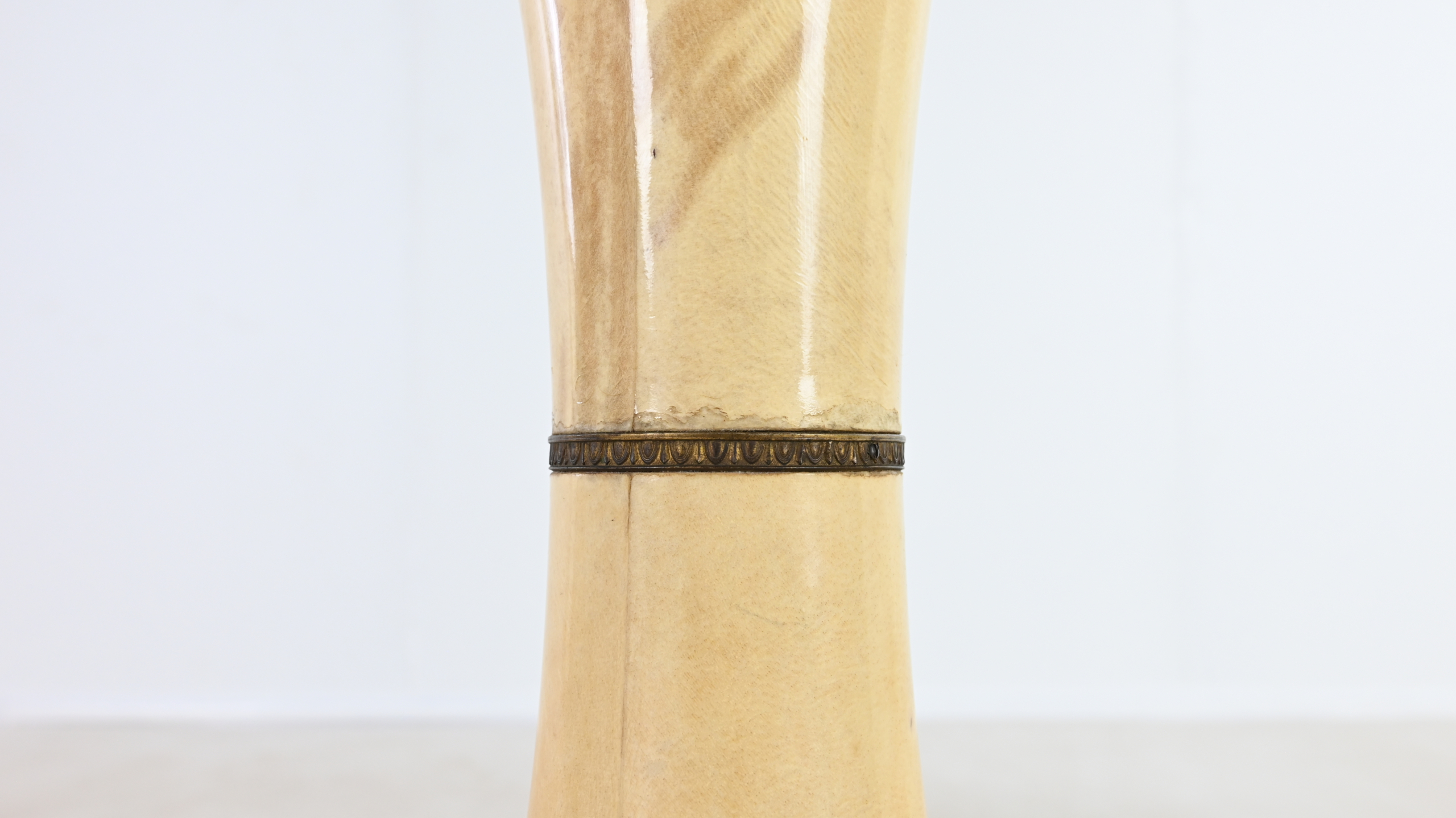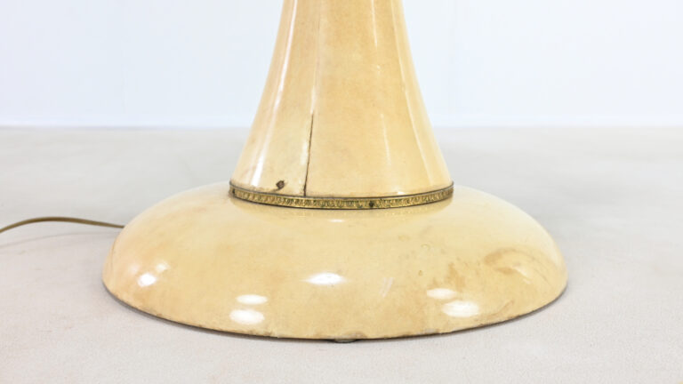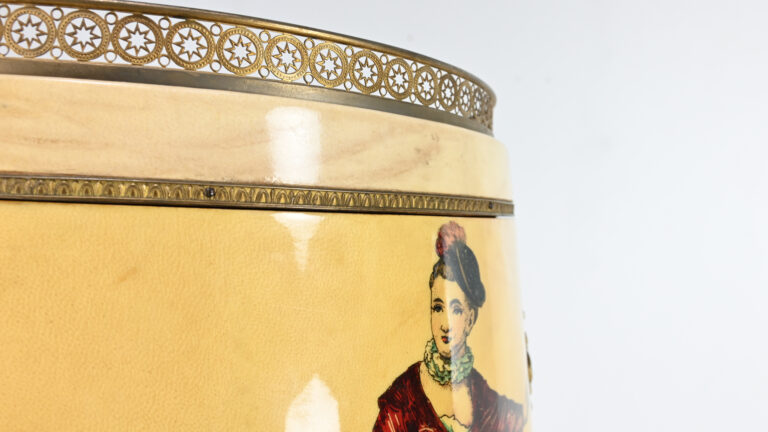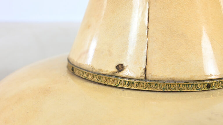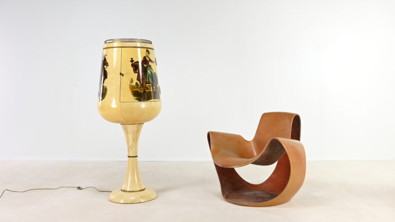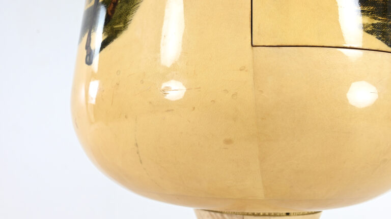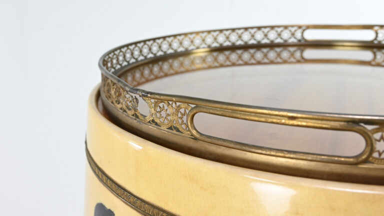 Aldo Tura (1909–1963) fut l’une des figures majeures du design italien d’après-guerre. Actif principalement en Lombardie, près de Milan, où il fonde son atelier en 1939, il développe un style immédiatement reconnaissable, mêlant techniques artisanales traditionnelles et matériaux audacieux. Son travail est particulièrement célèbre pour l’utilisation de peau de chèvre teintée et laquée à la main, appliquée sur des formes sculpturales. Outre la peau de chèvre, il expérimente également le bois laqué, le métal, le verre et parfois des matériaux plus singuliers tels que la coquille d’œuf. Produites en petites séries ou en pièces uniques, ses créations sont aujourd’hui recherchées pour leur rareté, leur raffinement et leur caractère décoratif inimitable.