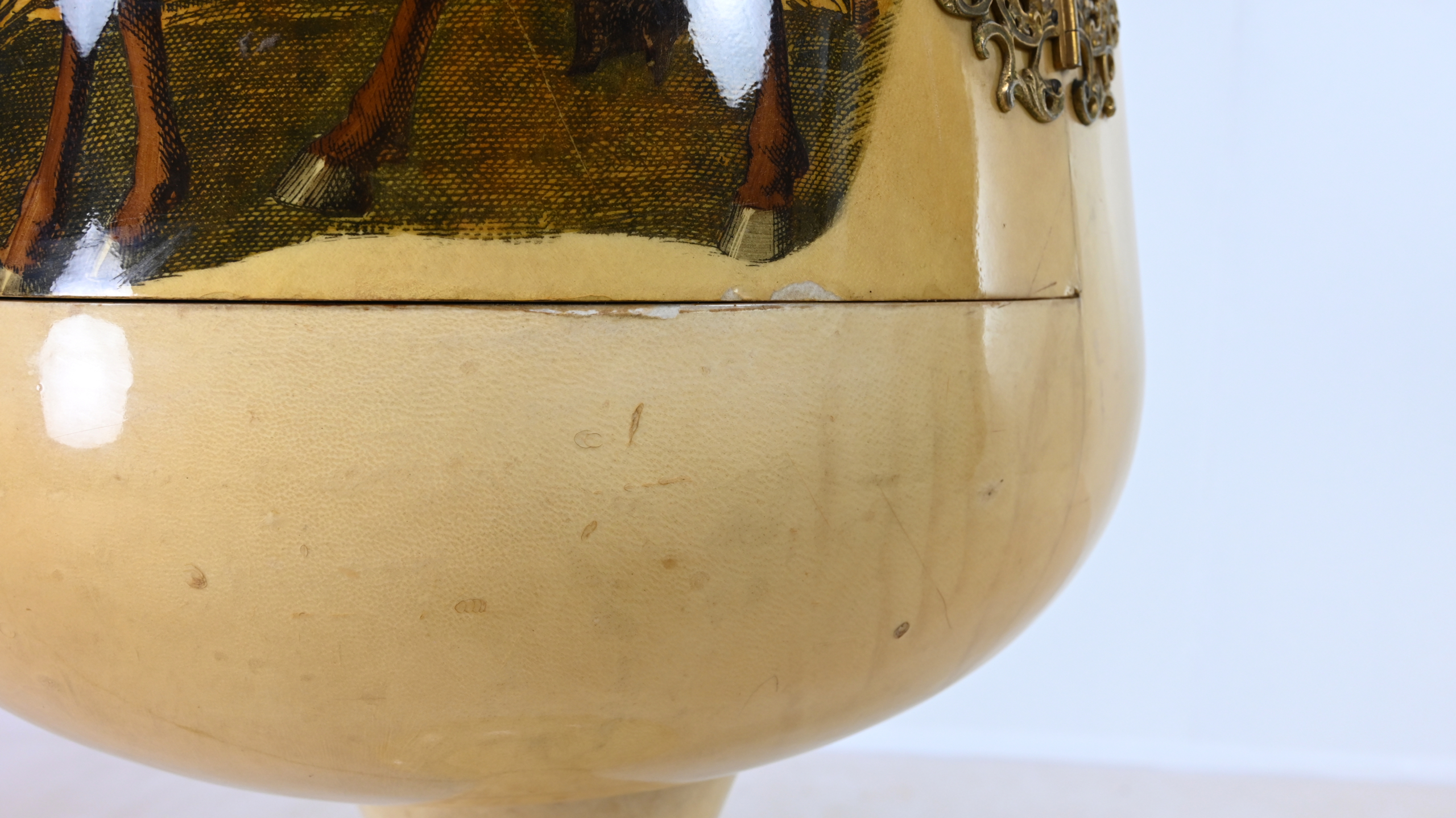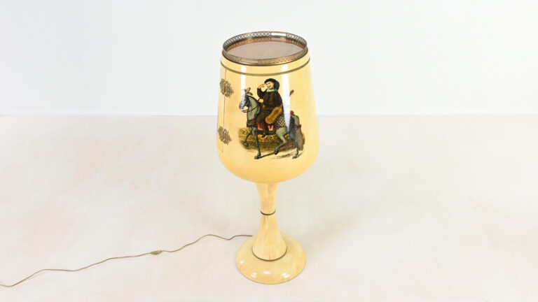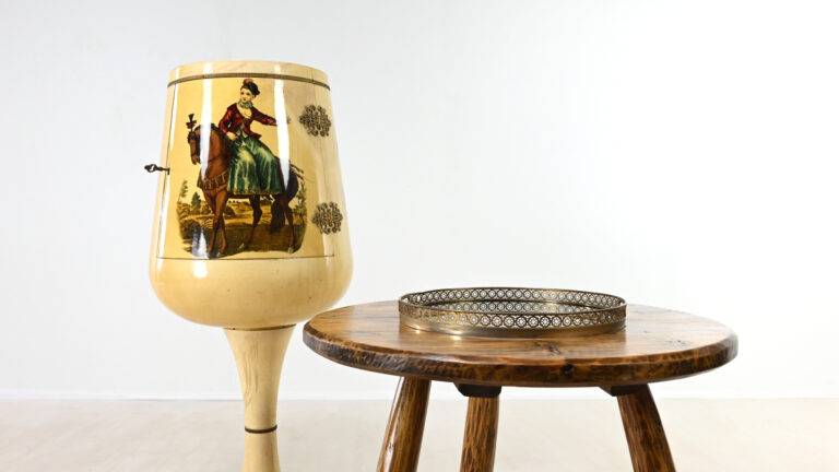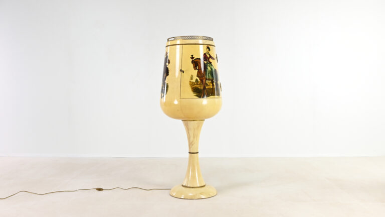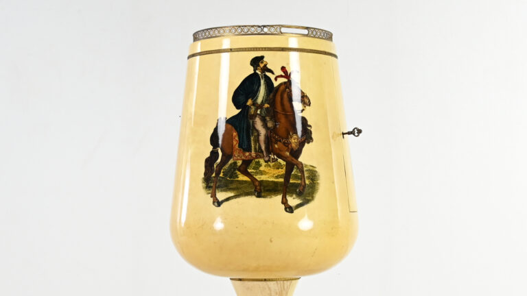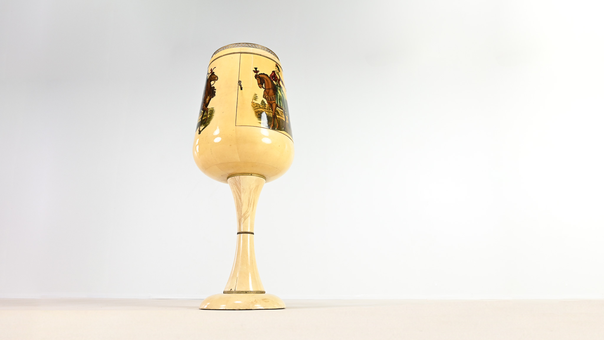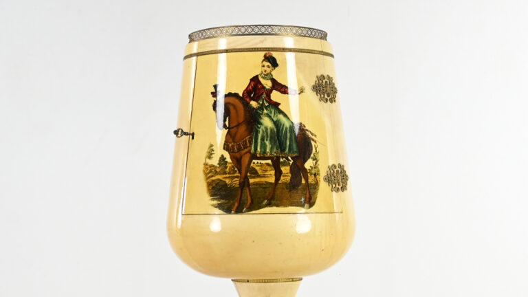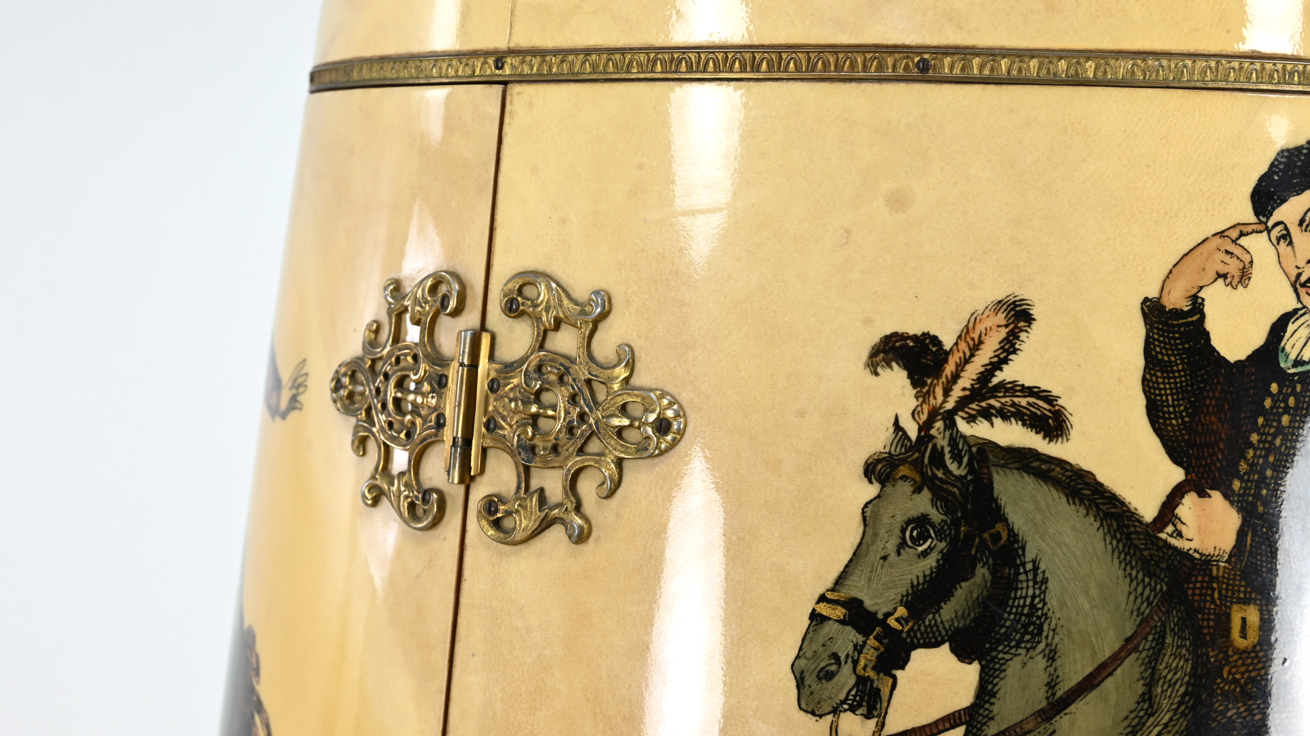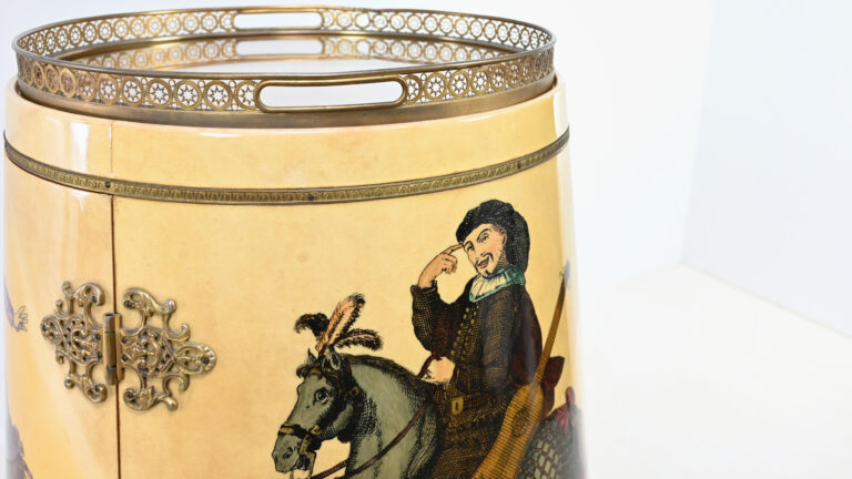 Le bar présente une silhouette galbée évoquant la forme d’un calice, revêtue d’une peau de chèvre laquée claire et ornée, sur toutes ses faces, de trois illustrations représentant des cavaliers du XIXe siècle. Il est surmonté d’un plateau rond en verre amovible, cerclé de laiton — idéal pour le service — et s’ouvre sur un compartiment intérieur miroité et rétroéclairé, doté d’une étagère fixe en verre.