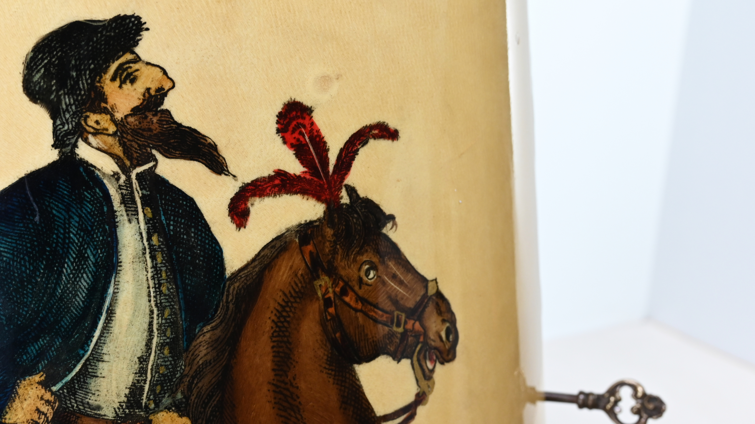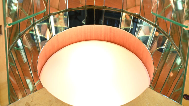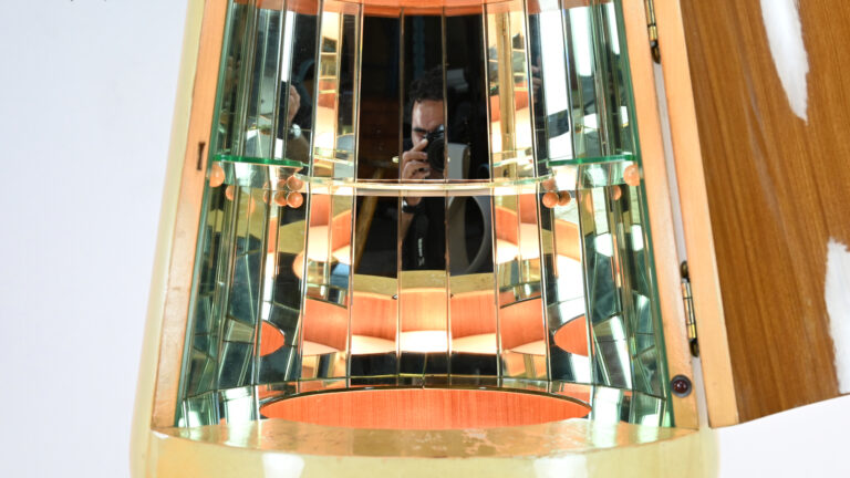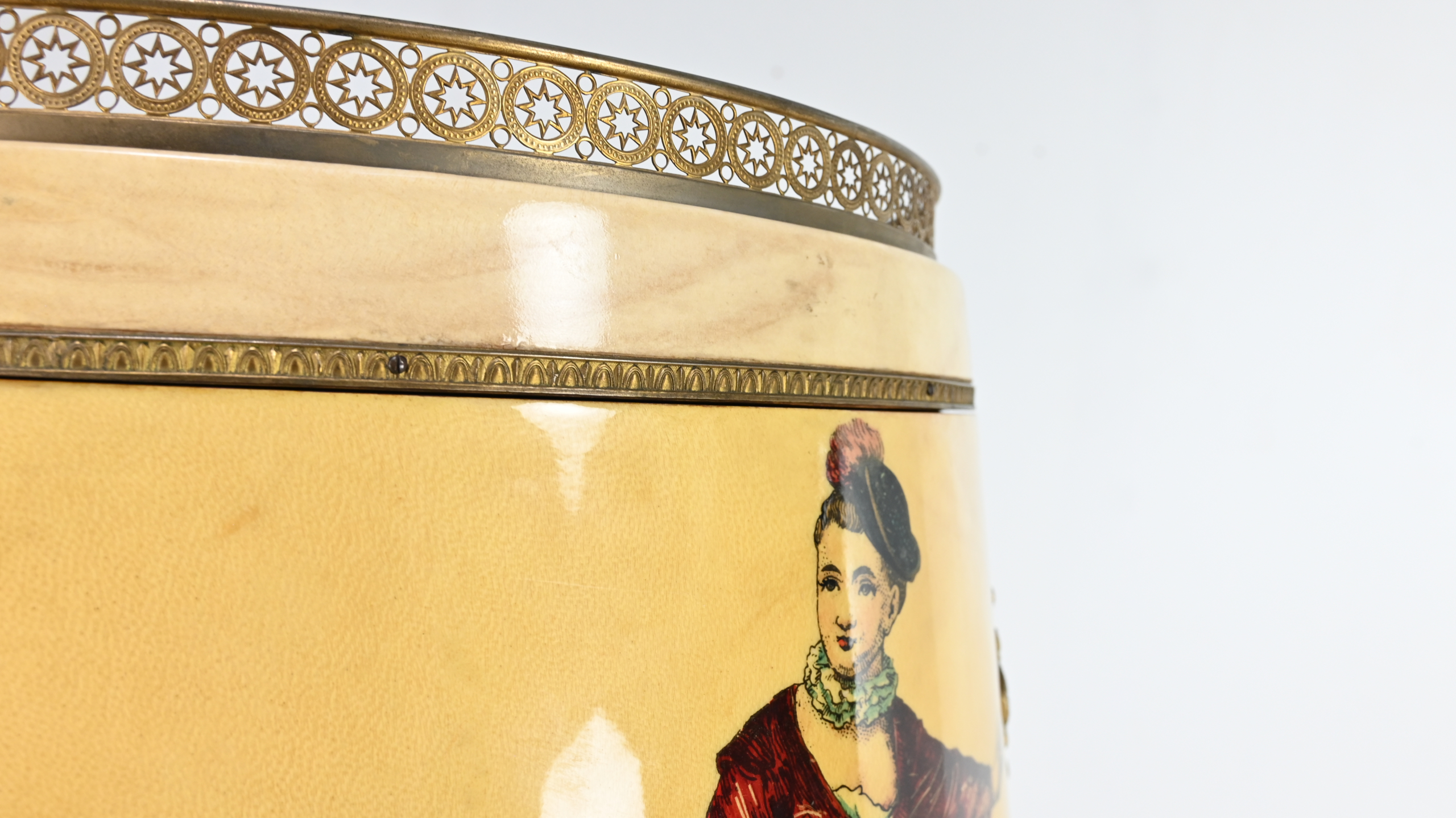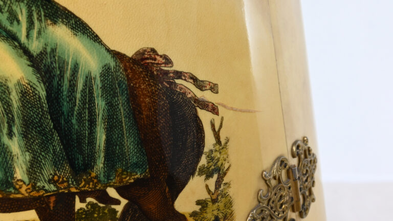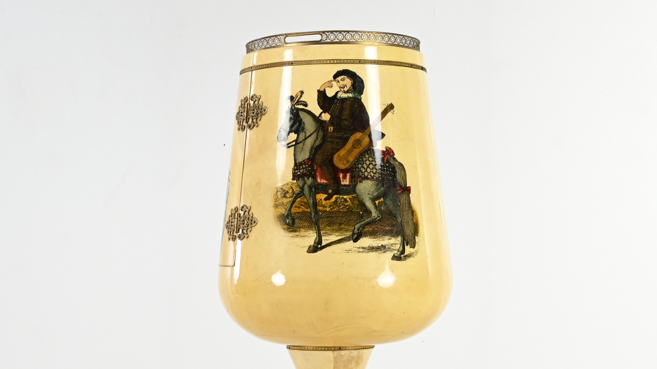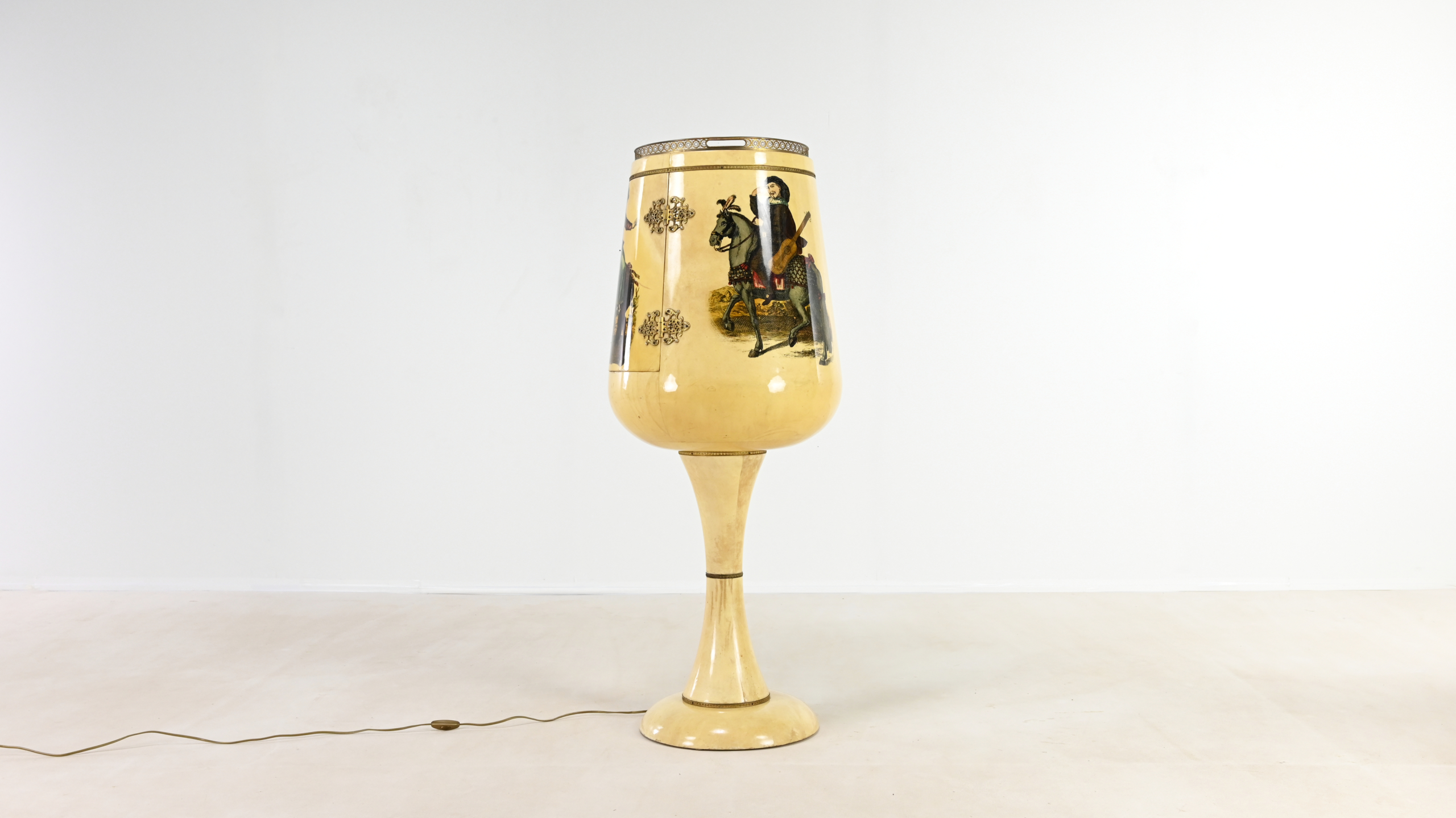 Le bar présente une silhouette galbée évoquant la forme d’un calice, revêtue d’une peau de chèvre laquée claire et ornée, sur toutes ses faces, de trois illustrations représentant des cavaliers du XIXe siècle. Il est surmonté d’un plateau rond en verre amovible, cerclé de laiton — idéal pour le service — et s’ouvre sur un compartiment intérieur miroité et rétroéclairé, doté d’une étagère fixe en verre.