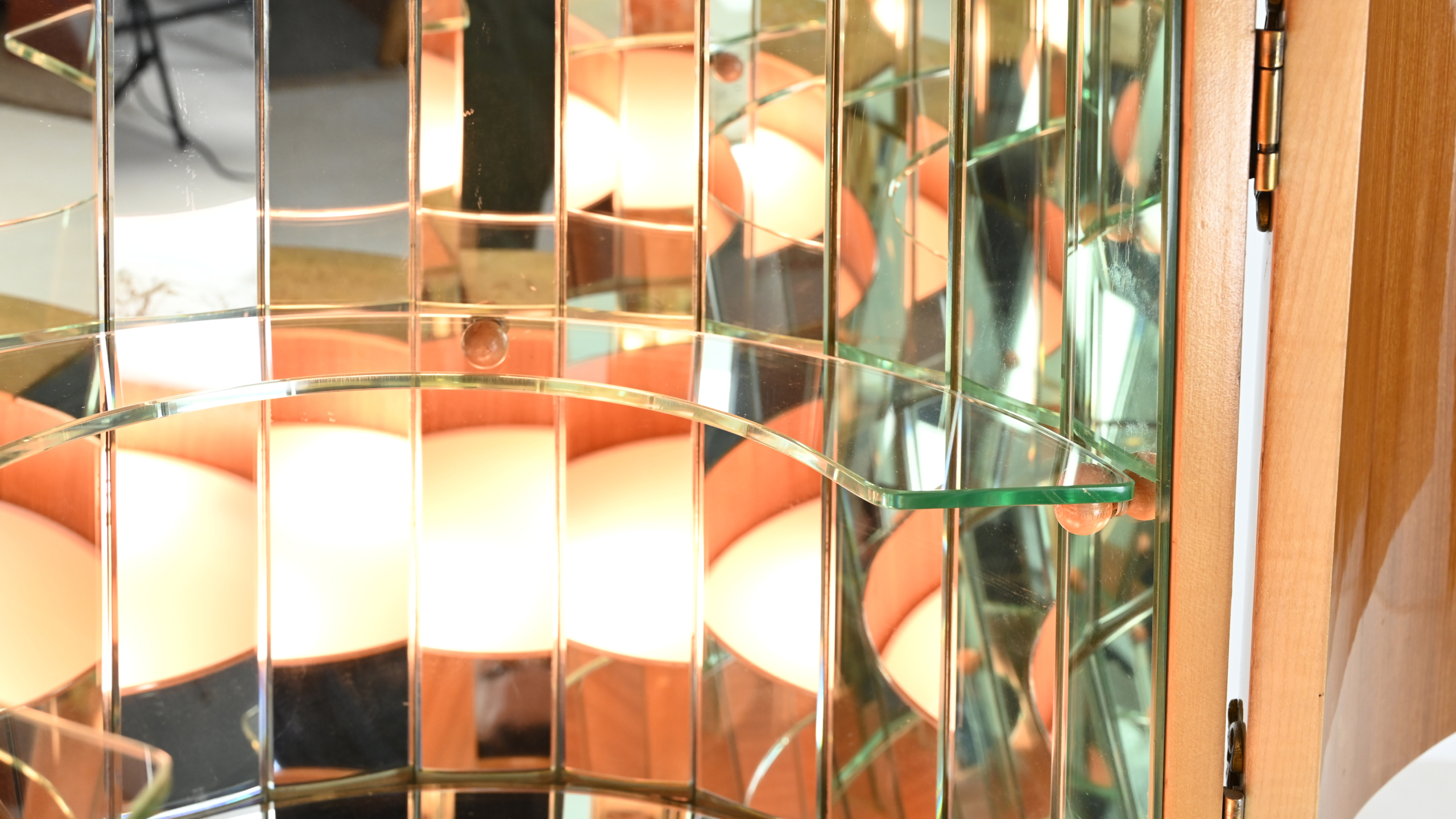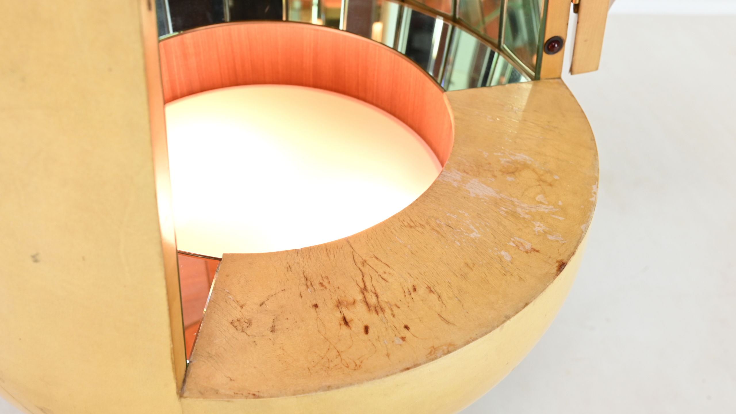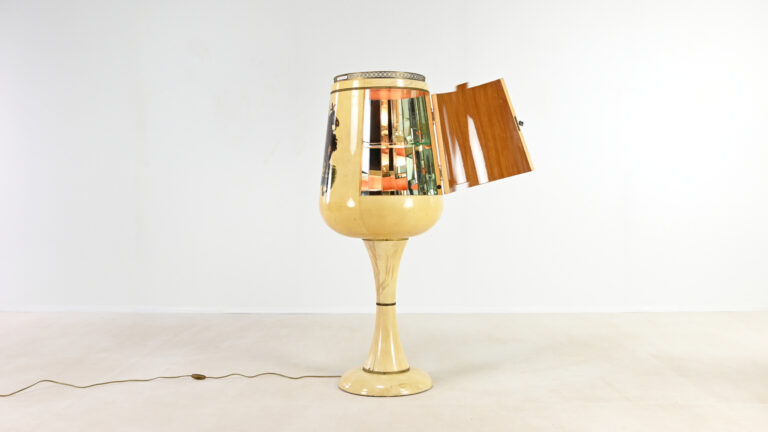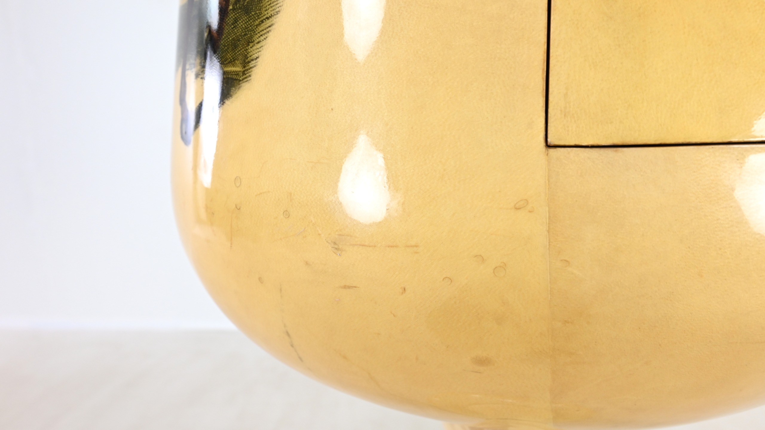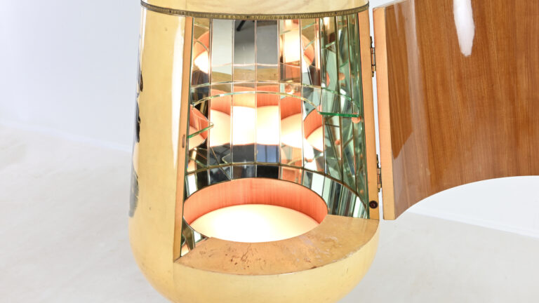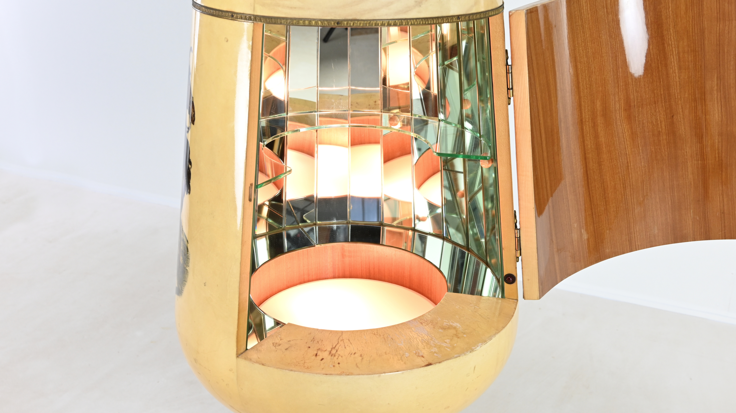 Illustration of Italian creative freedom in the mid-20th century, the Calice Illustration de la liberté créative italienne du milieu du XXe siècle, le bar Calice a été conçu par Aldo Tura, reconnu pour son usage novateur de la peau de chèvre laquée et l’excellence de son savoir-faire. Cette pièce incarne les caractéristiques emblématiques de l’œuvre de Tura : formes originales, matériaux luxueux et esthétique ludique singulière.