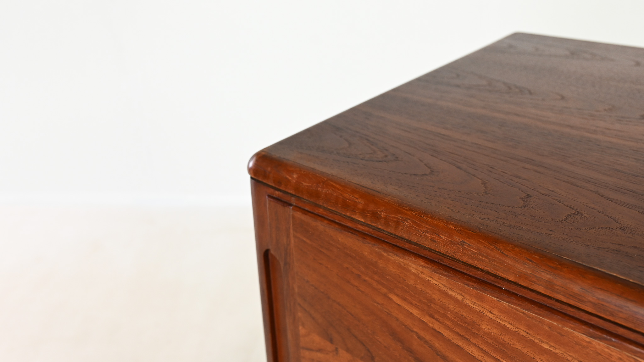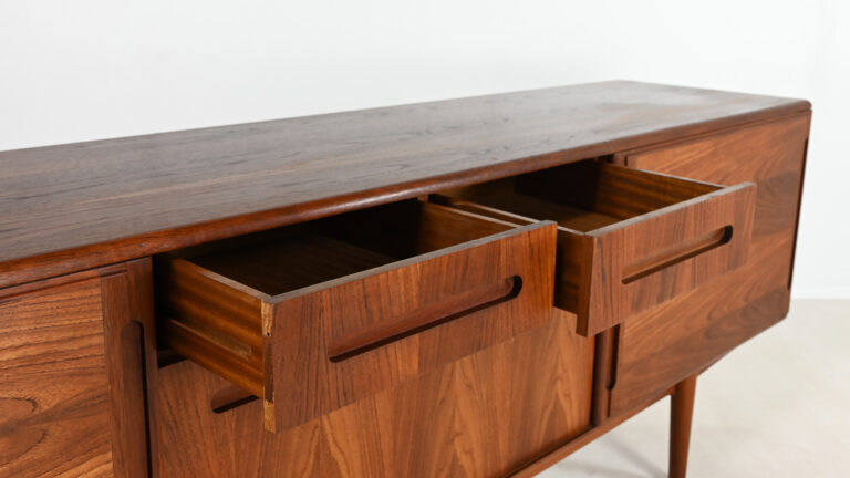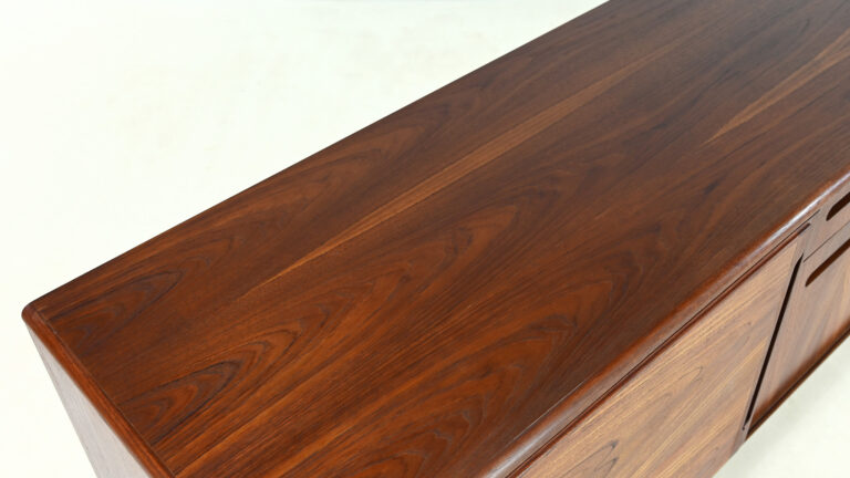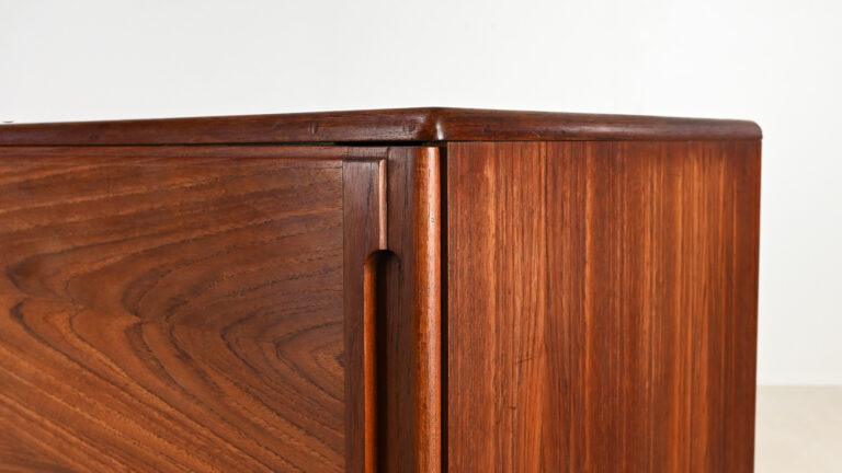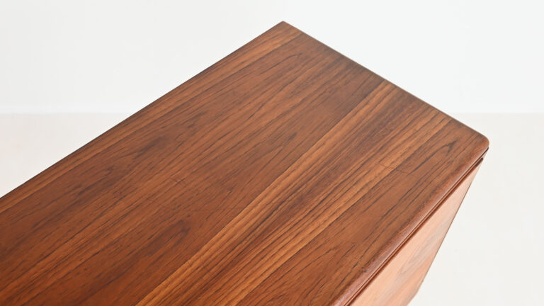 Graphique, élégante et parfaitement proportionnée, cette enfilade danoise des années 1960 est réalisée en teck et placage de teck sur bois latté. Son design met en valeur les lignes épurées et la simplicité fonctionnelle caractéristiques du mobilier scandinave d’après-guerre.
