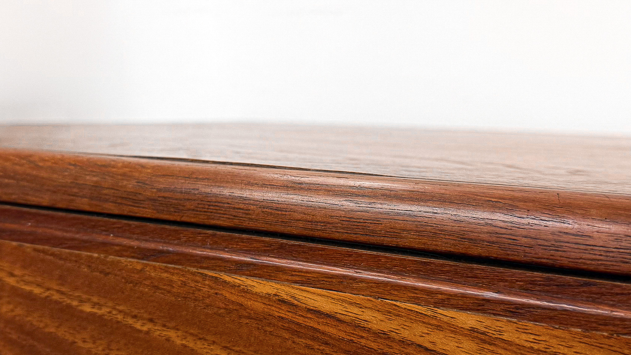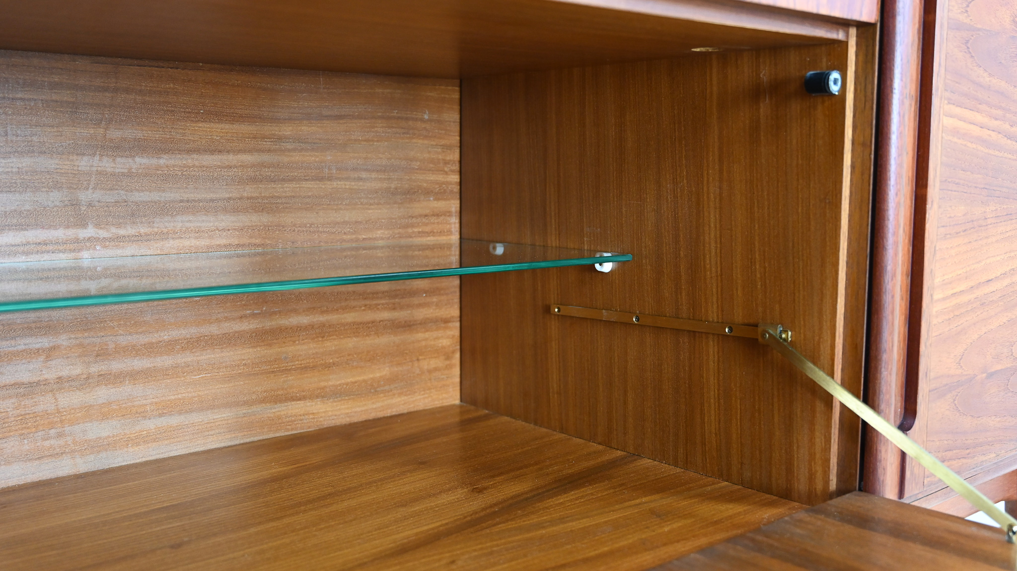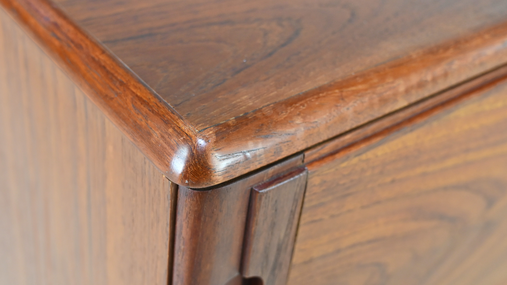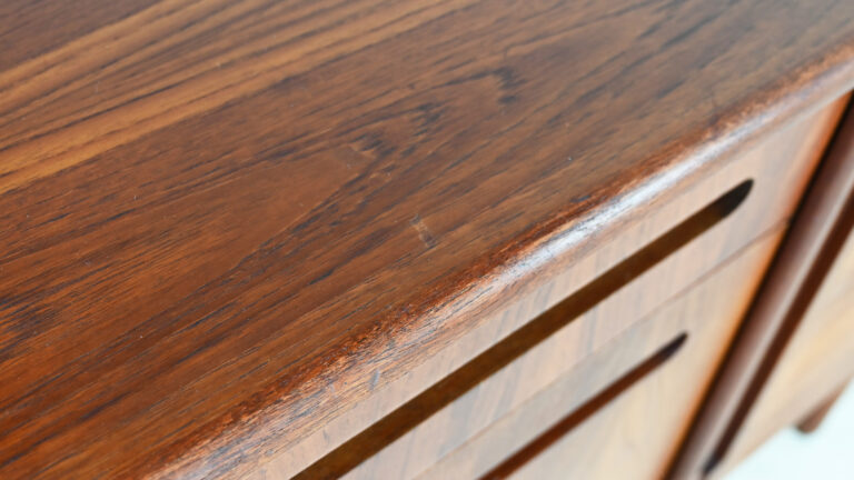 Le meuble présente un léger gonflement du bois sur l’arête supérieure, ainsi que des traces d’usage et une patine du temps, visibles sur les photographies. Il demeure néanmoins en bon état général : solide, esthétiquement équilibré et d’une très belle qualité d’exécution.
