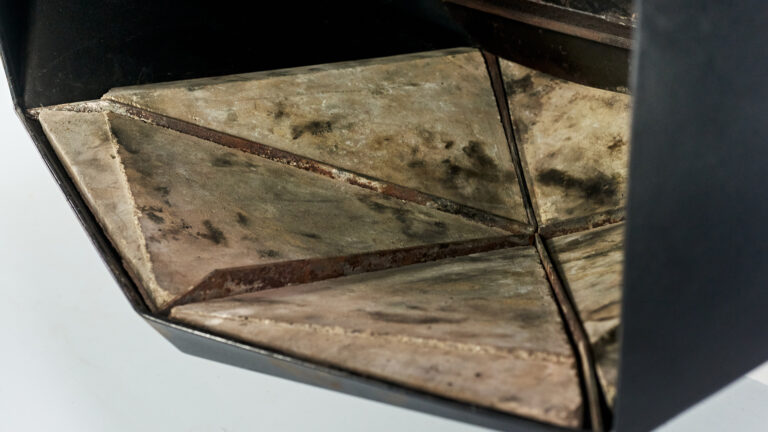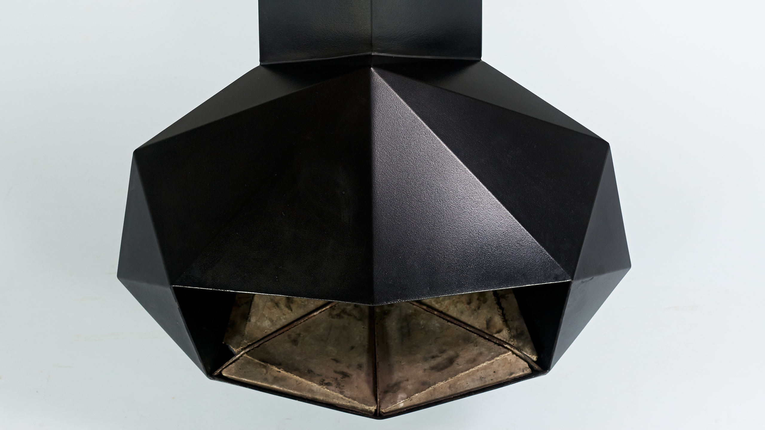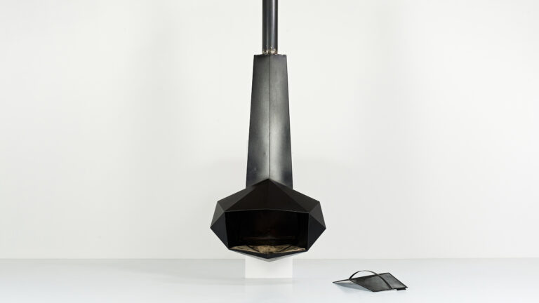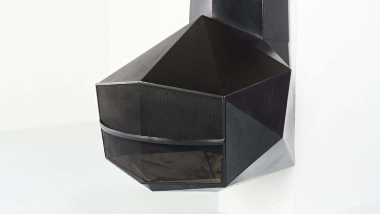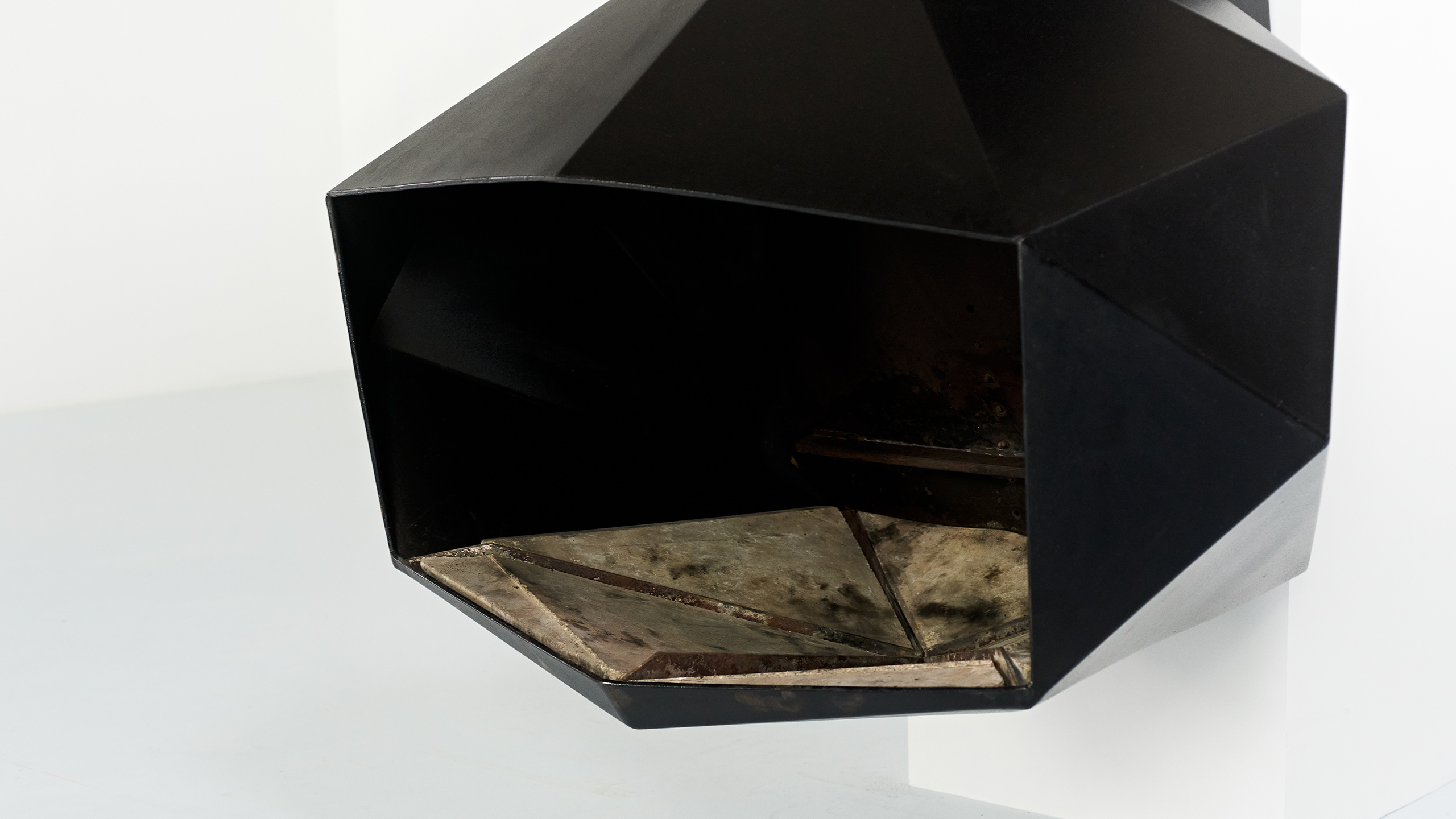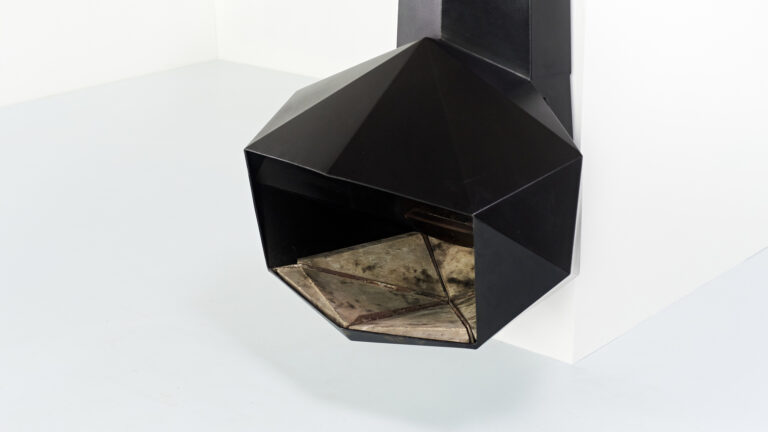 Cheminée murale vintage en acier noir facetté. Complète avec ses pierres réfractaires et son pare-feu en maille métallique. Patine et légères traces d’usage, excellent état général. Vers 1970.