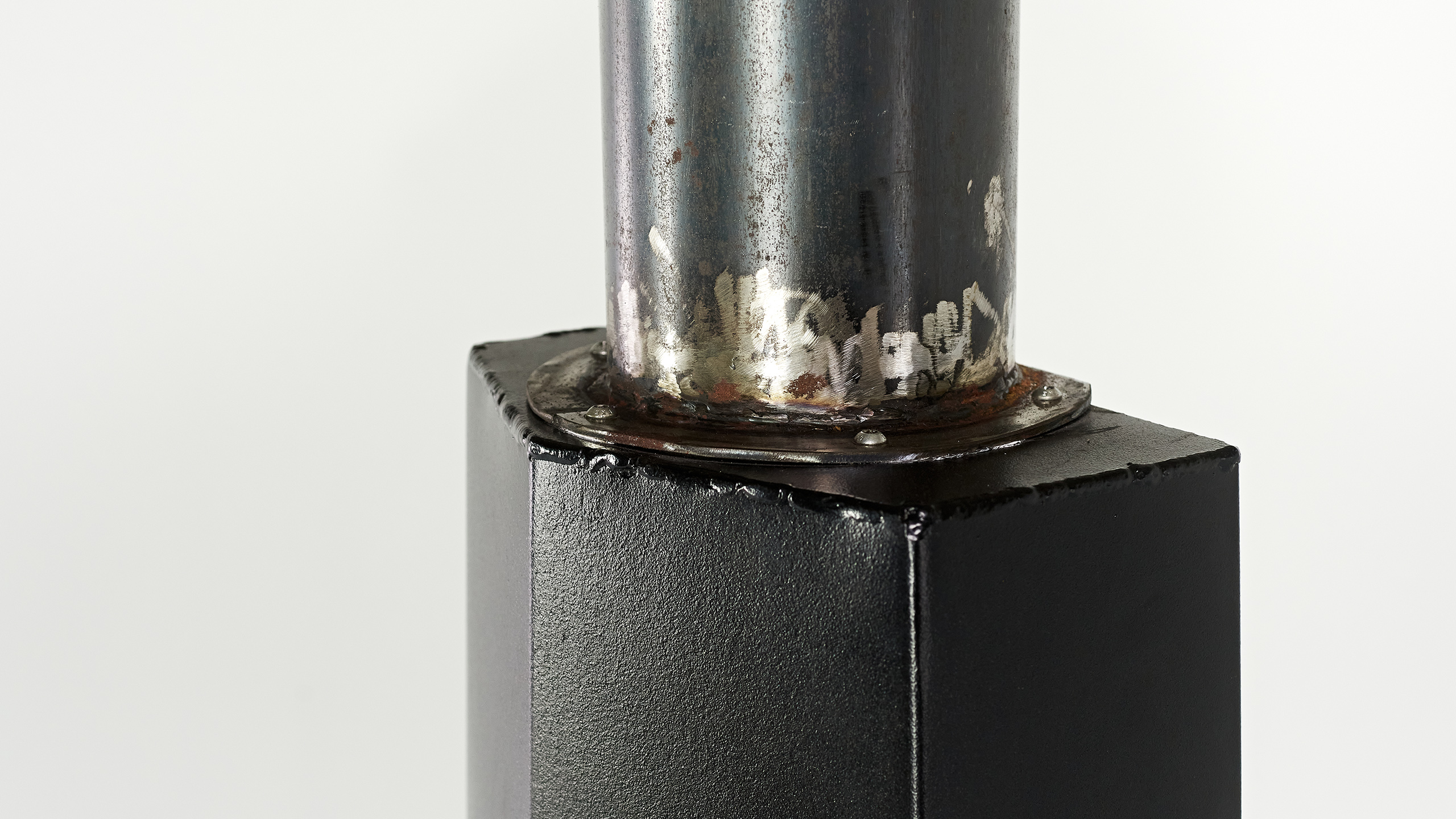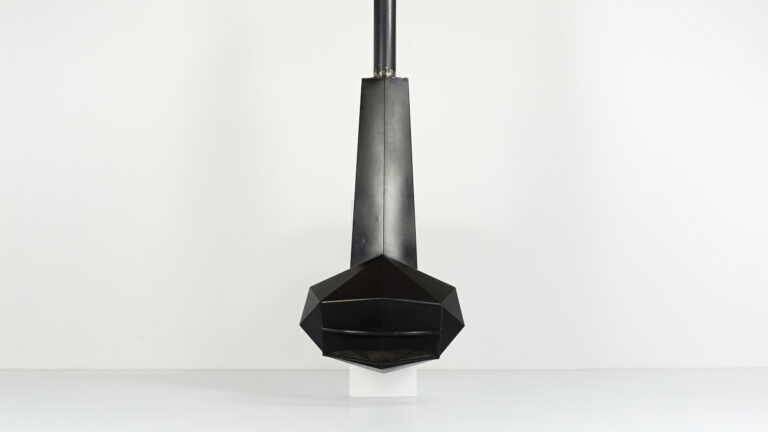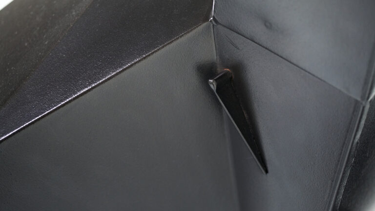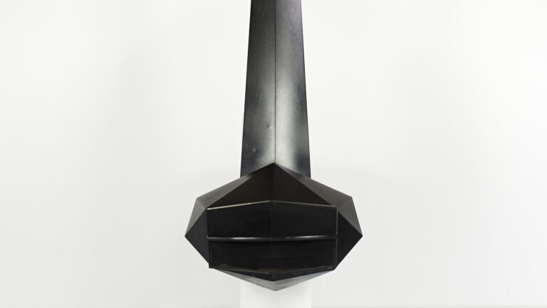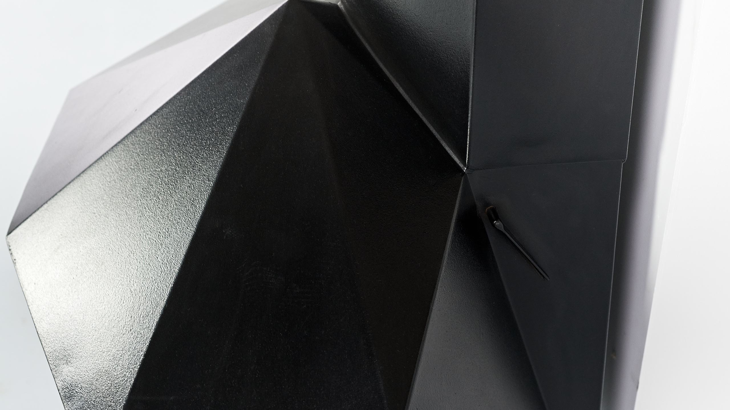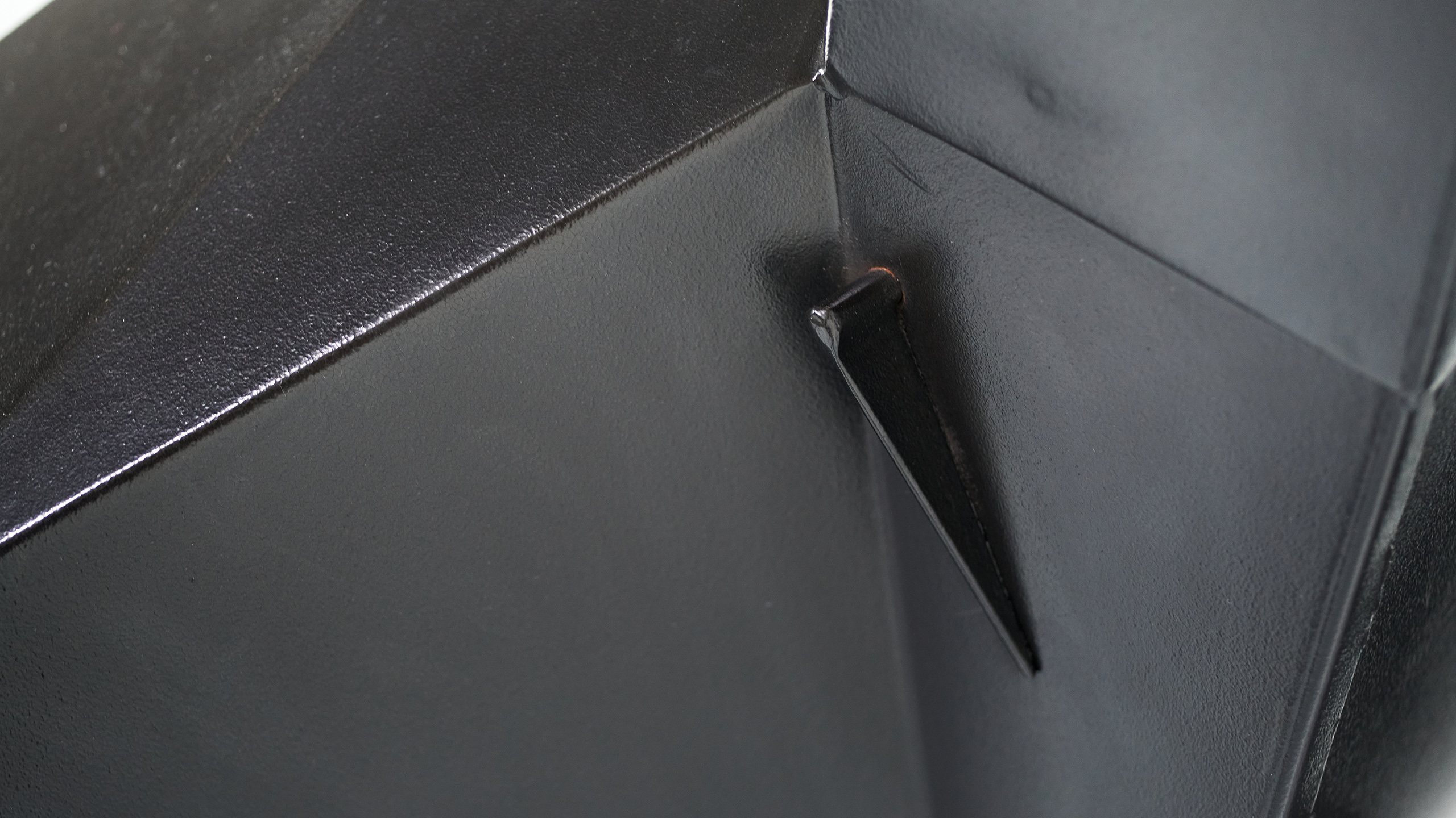 Cheminée murale vintage en acier noir facetté. Complète avec ses pierres réfractaires et son pare-feu en maille métallique. Patine et légères traces d’usage, excellent état général. Vers 1970.