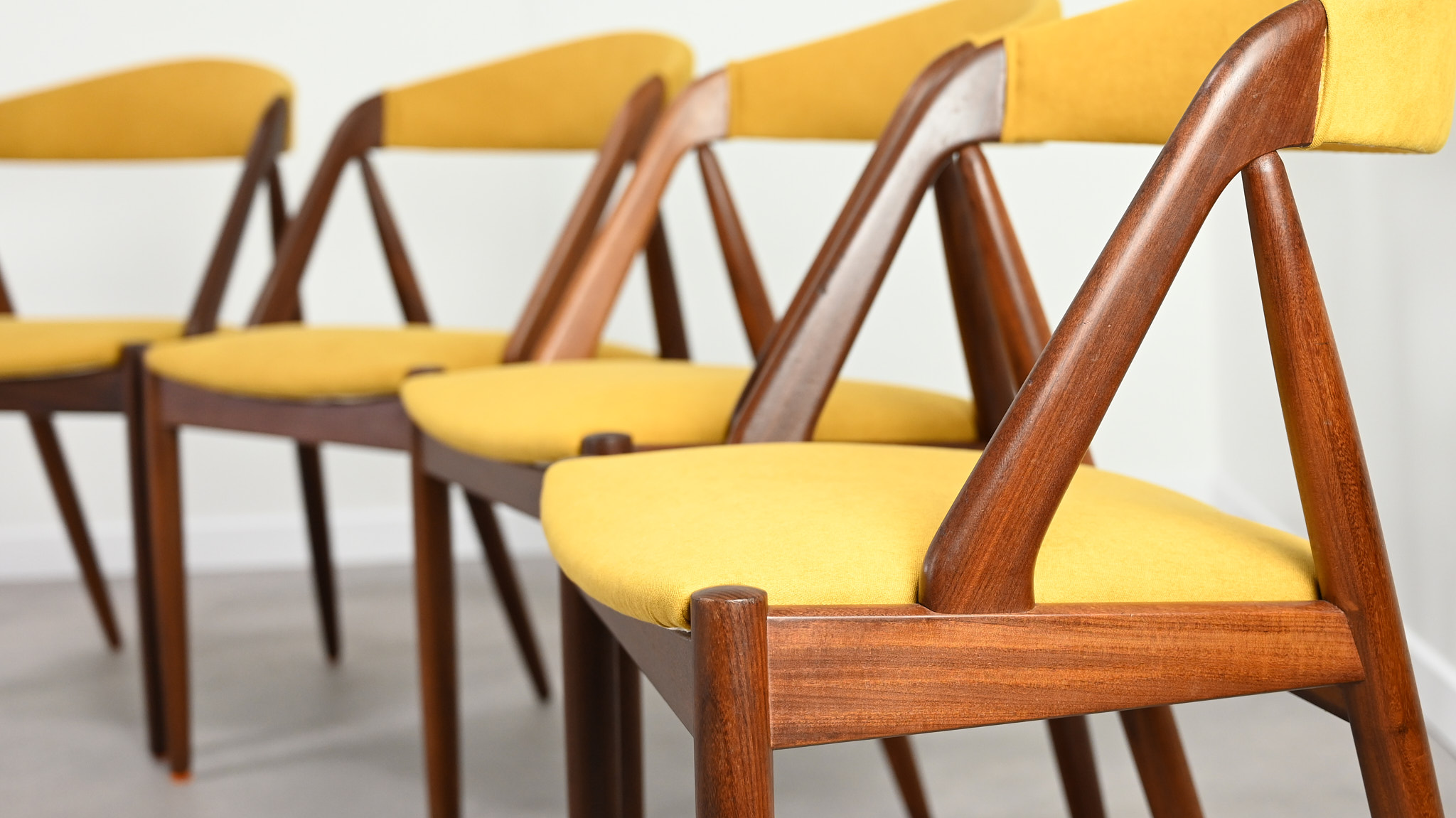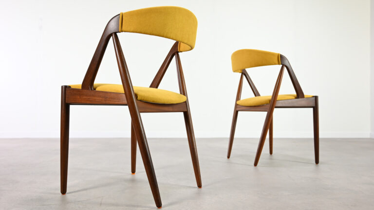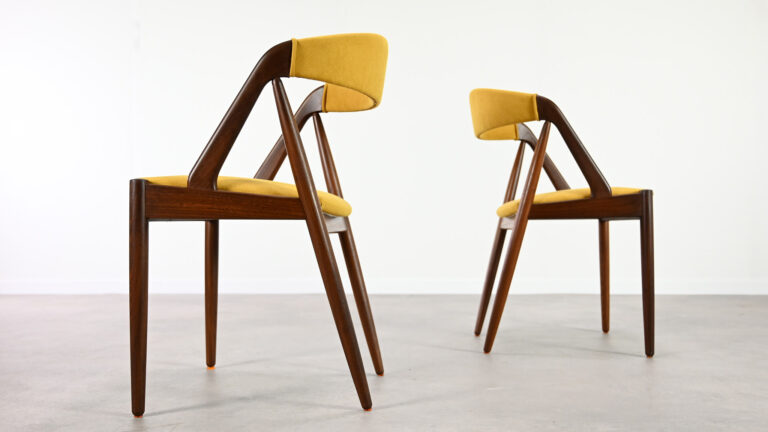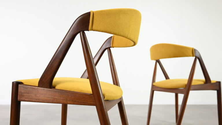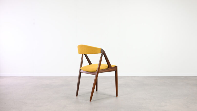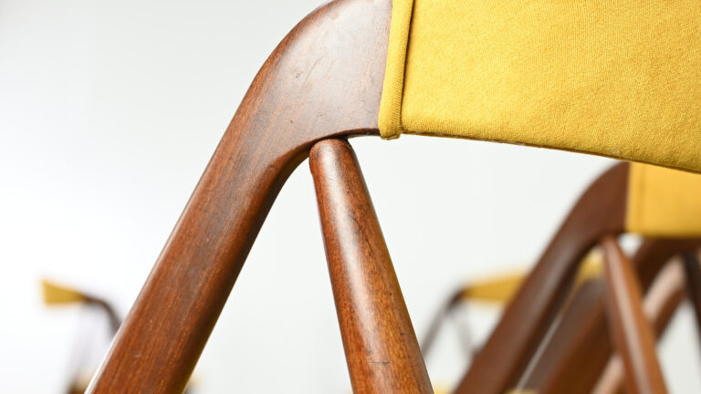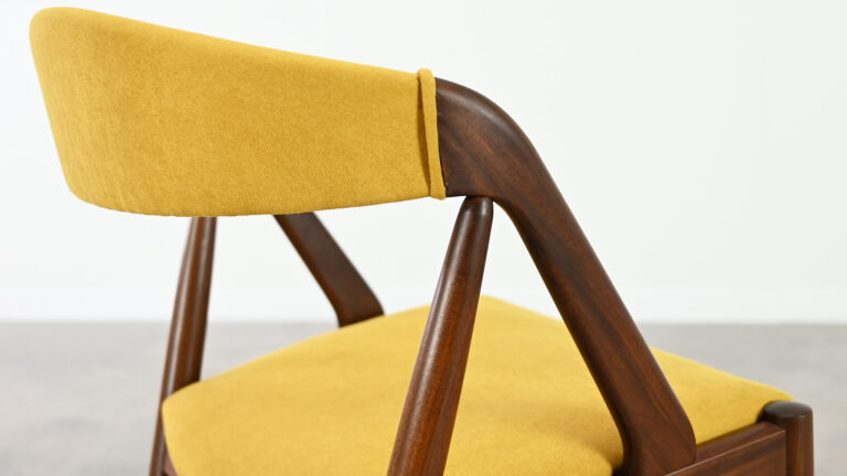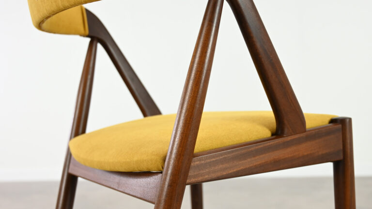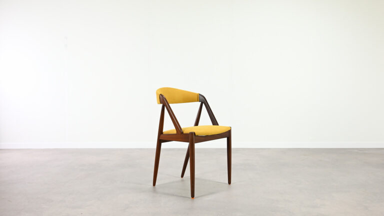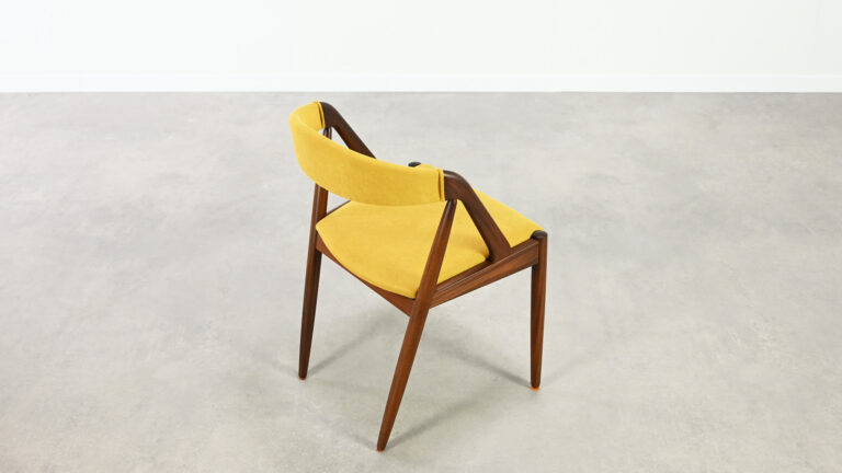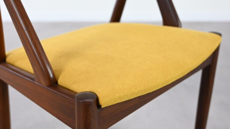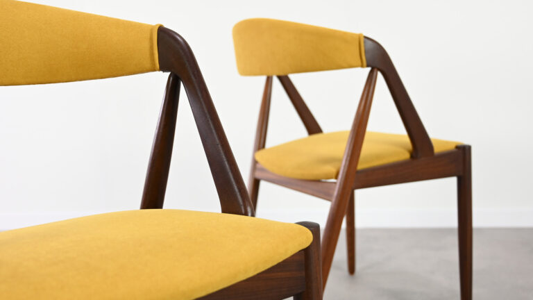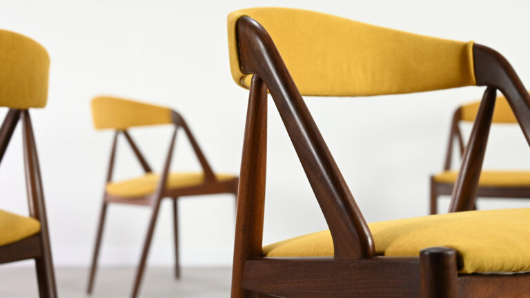 Suite de 8 chaises, modèle 31, dessinées par Kai Kristiansen pour Schou Andersen. Bel exemple du design danois des années 1960. Structures en teck massif, assises et dossiers retapissés dans un tissu jaune. Légères traces d’usage sur le teck, excellent état général. Hauteur d’assise : 45 cm.