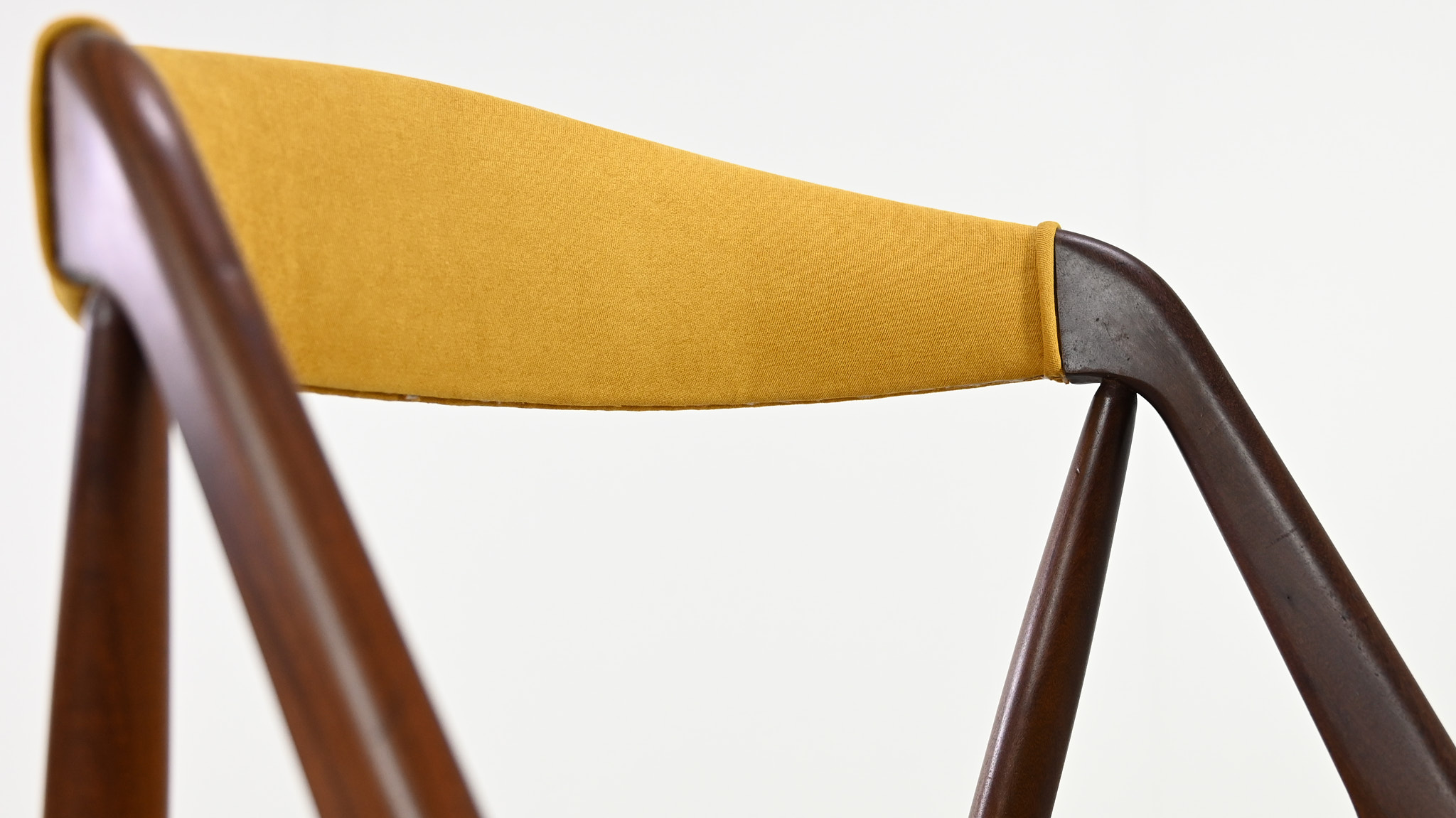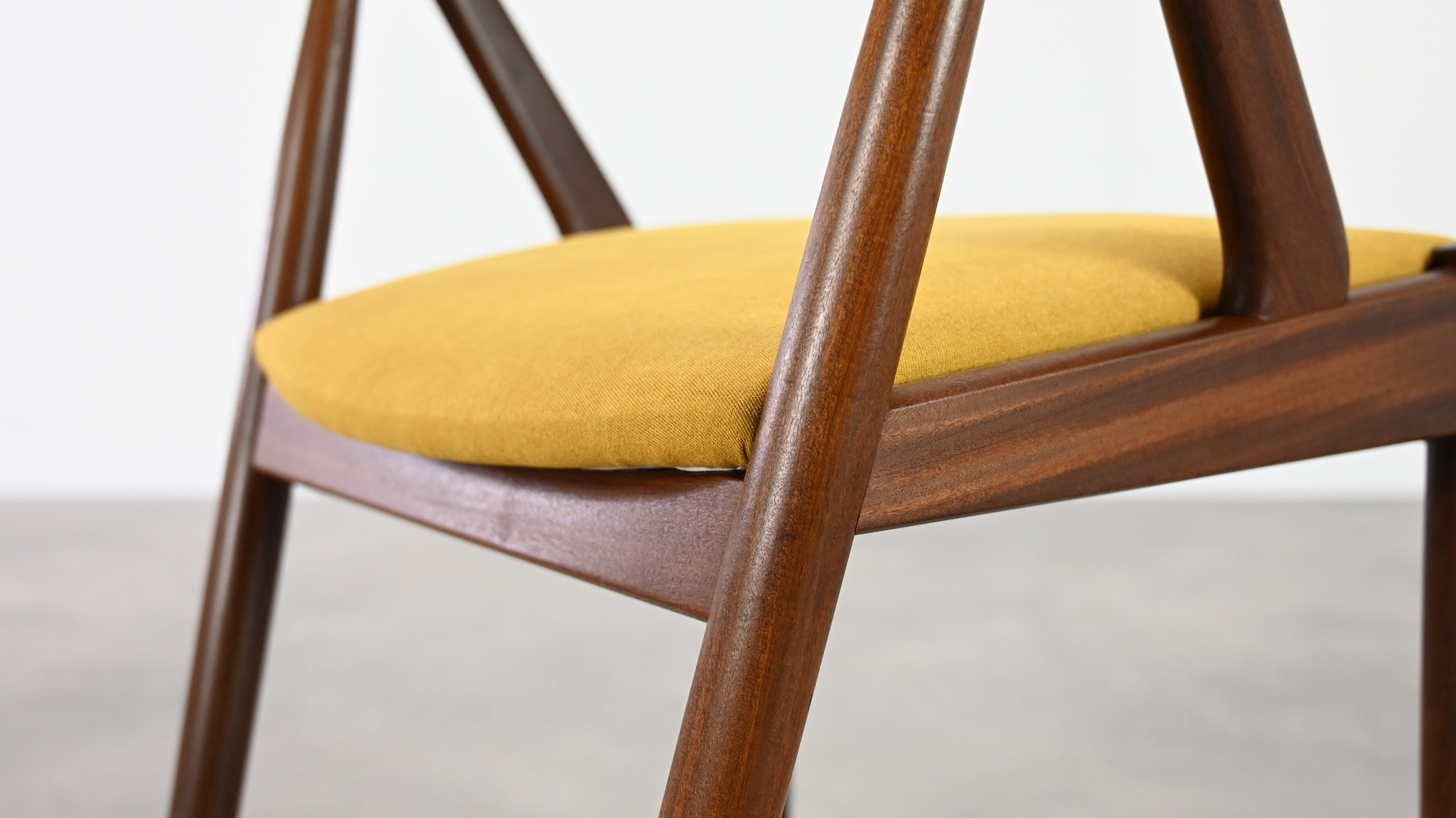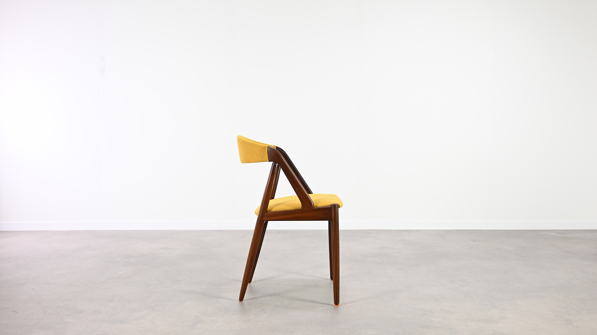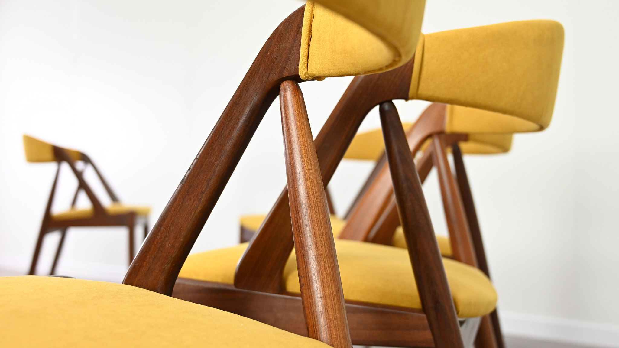 Suite de 8 chaises, modèle 31, dessinées par Kai Kristiansen pour Schou Andersen. Bel exemple du design danois des années 1960. Structures en teck massif, assises et dossiers retapissés dans un tissu jaune. Légères traces d’usage sur le teck, excellent état général. Hauteur d’assise : 45 cm.