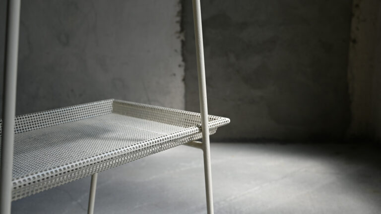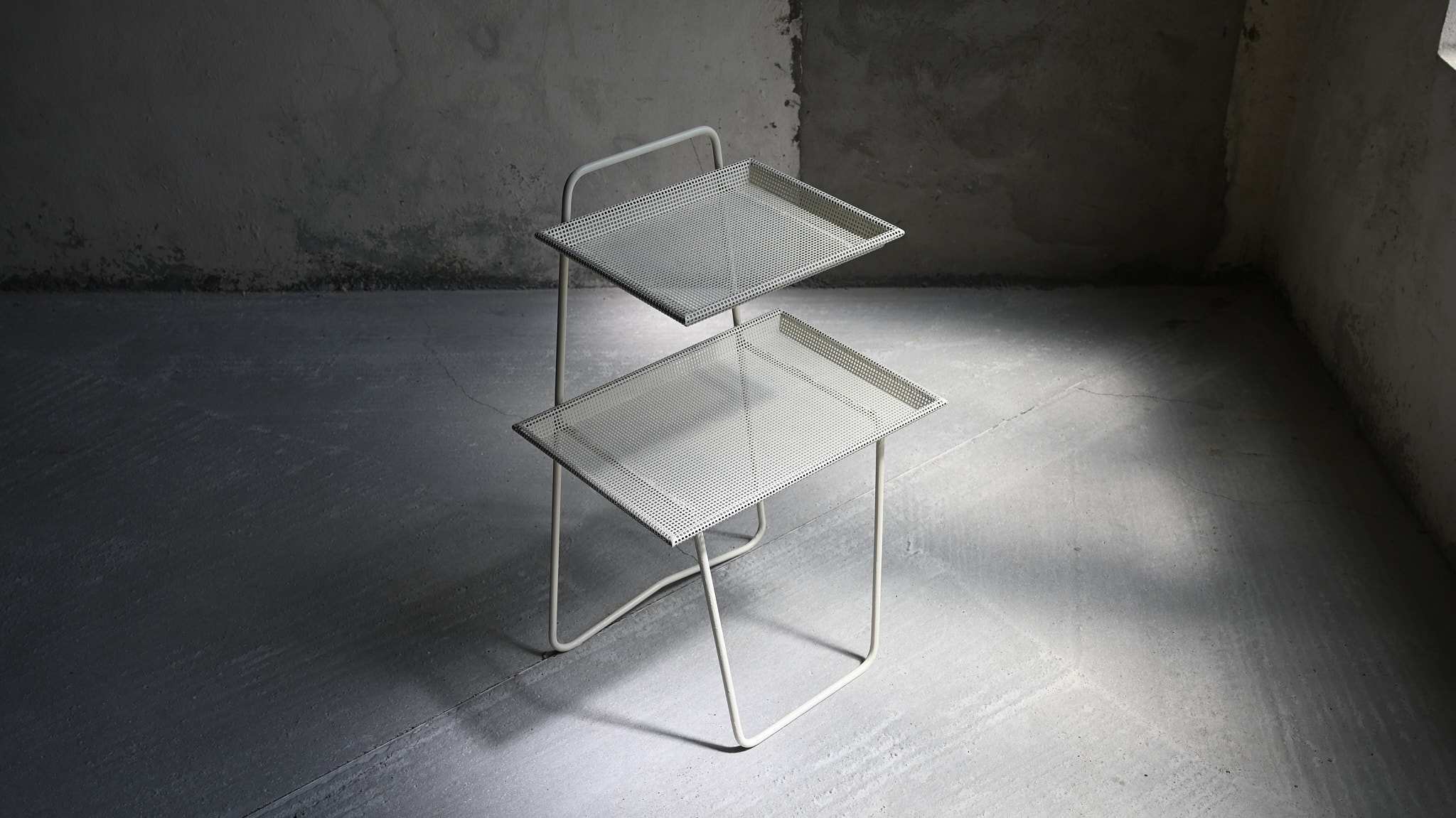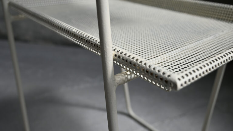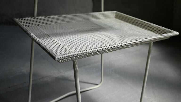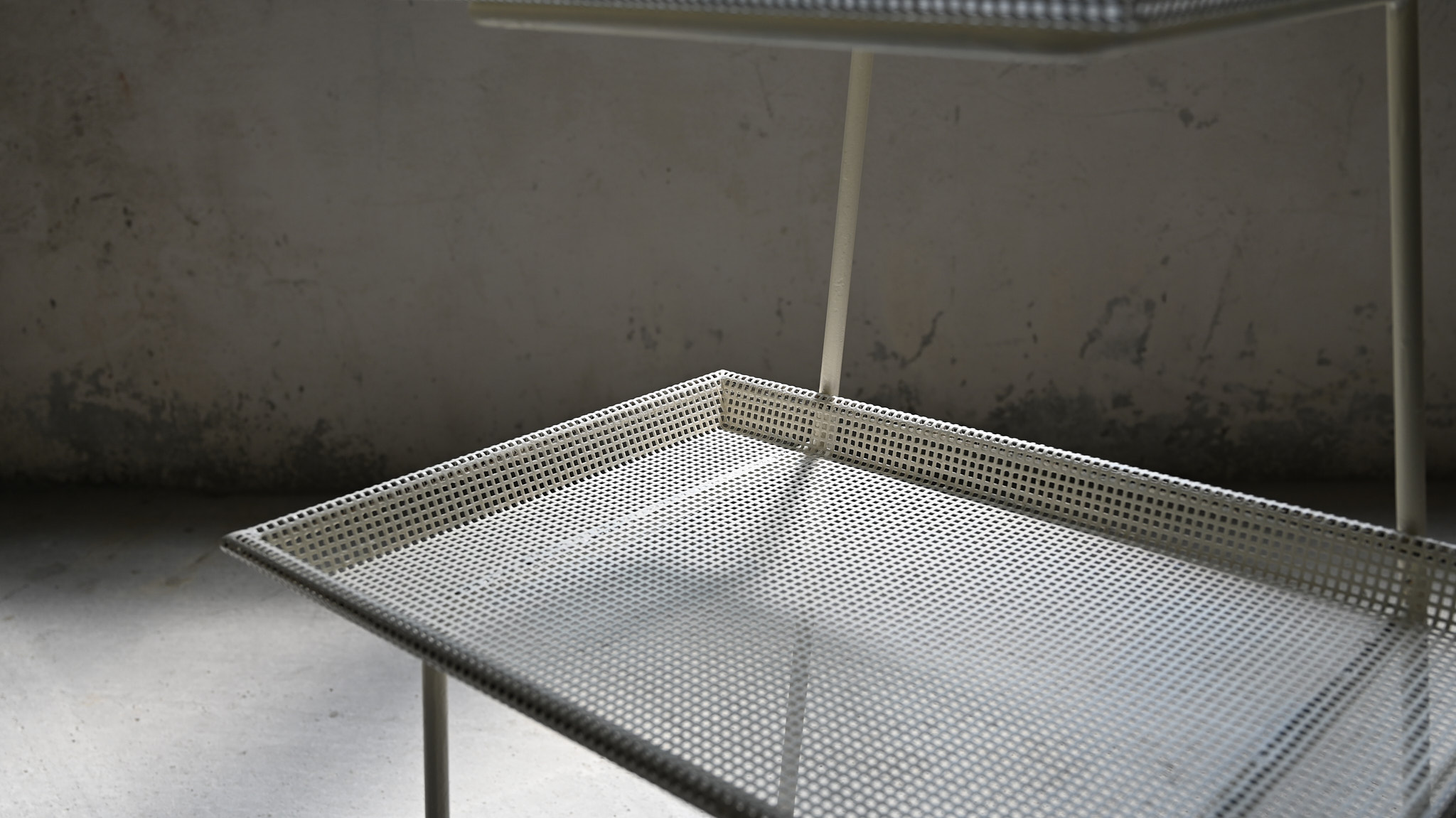 Présentée pour la première fois au Salon des Artistes Décorateurs en 1953, cette rare table d’appoint à deux plateaux de Mathieu Matégot, également appelée « table téléphone », est réalisée en métal perforé et en métal tubulaire. Cet exemplaire a fait l’objet d’une restauration partielle et professionnelle : l’une des soudures a été reprise (sur l’étagère inférieure, à droite — voir photos).