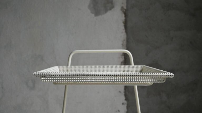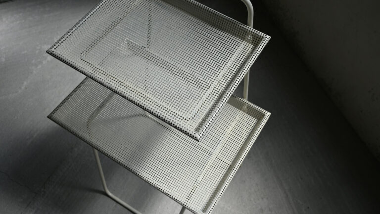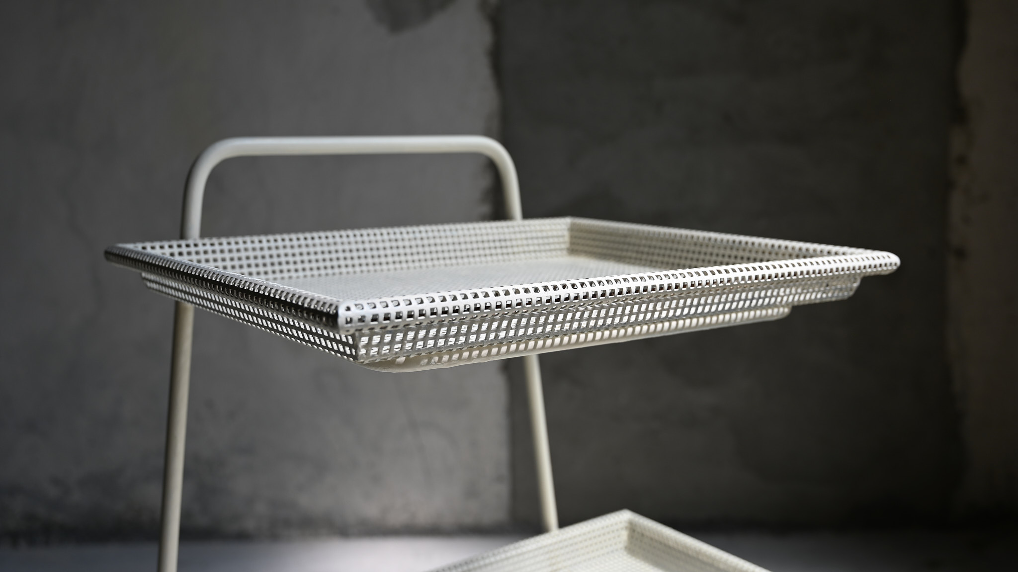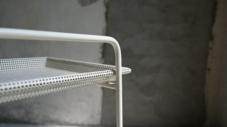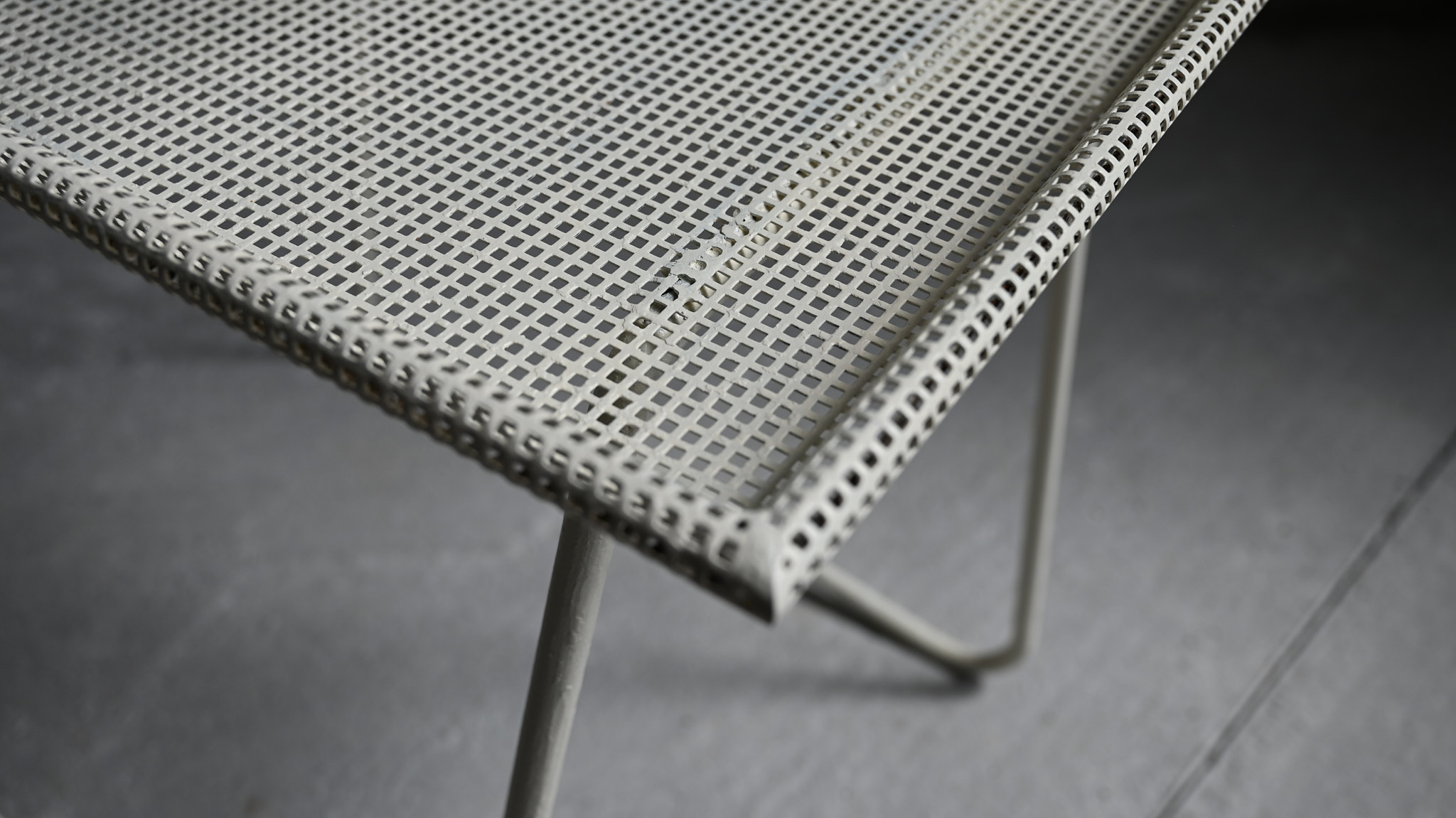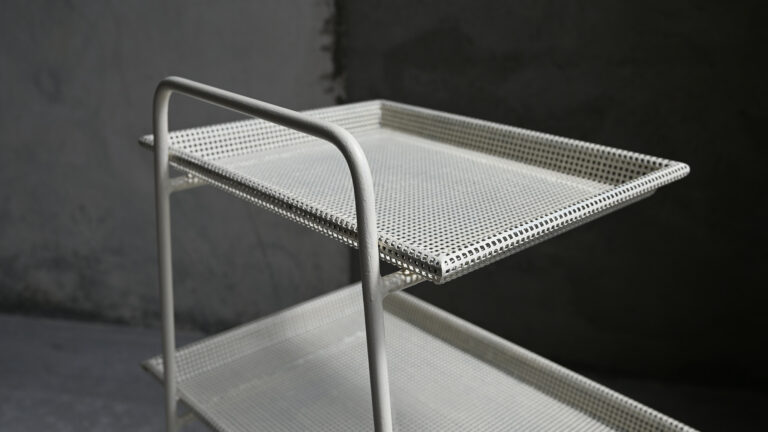 Présentée pour la première fois au Salon des Artistes Décorateurs en 1953, cette rare table d’appoint à deux plateaux de Mathieu Matégot, également appelée « table téléphone », est réalisée en métal perforé et en métal tubulaire. Cet exemplaire a fait l’objet d’une restauration partielle et professionnelle : l’une des soudures a été reprise (sur l’étagère inférieure, à droite — voir photos).