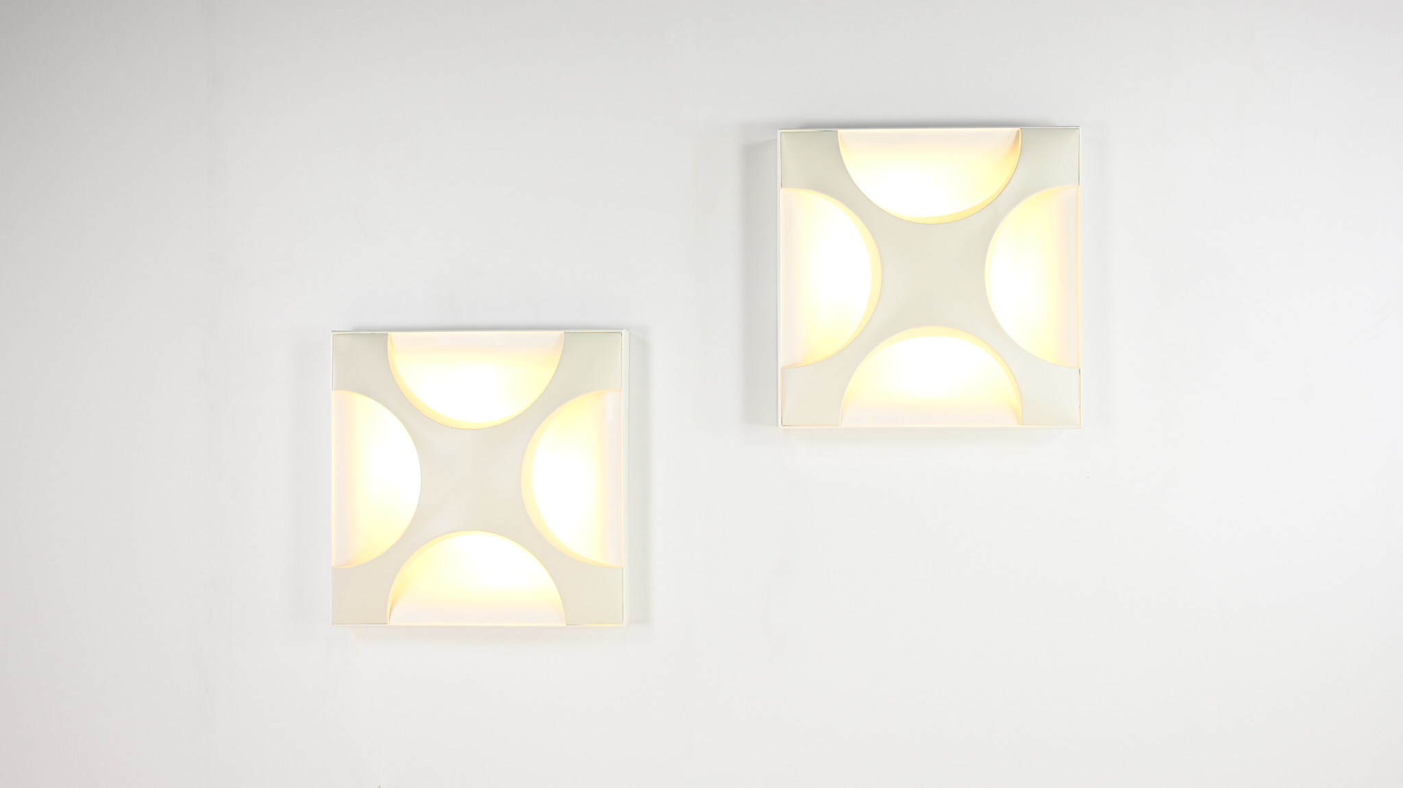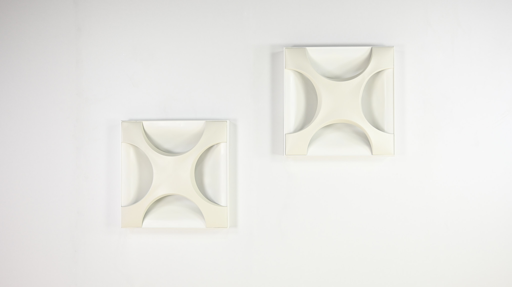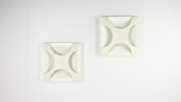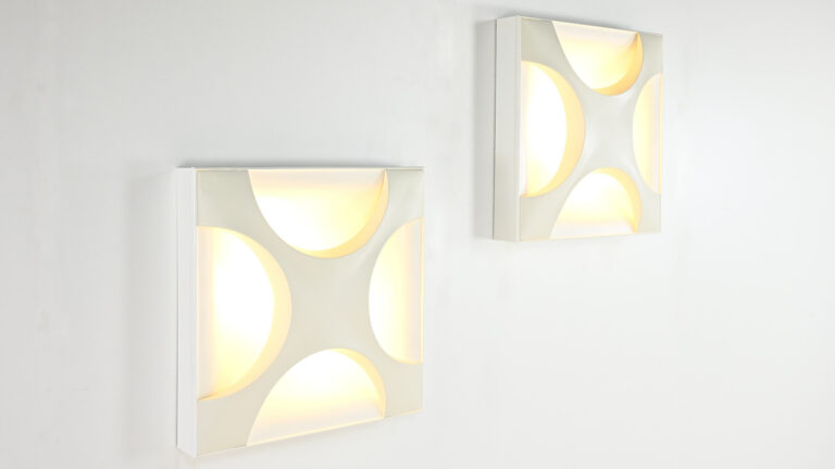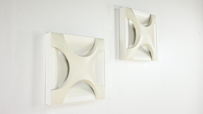 Paire de superbes appliques « Oyster », dessinées en 1968 par Rolf Krüger pour Staff Leuchten. Réalisées en aluminium laqué, avec un panneau arrière blanc mat et une croix en blanc ivoire, montées sur un cadre en bois laqué blanc mat. Traces d’usage, bon état général. Estampillées sur le luminaire. Allemagne, vers 1968. Prix pour la paire.