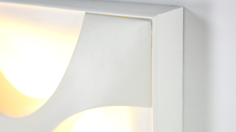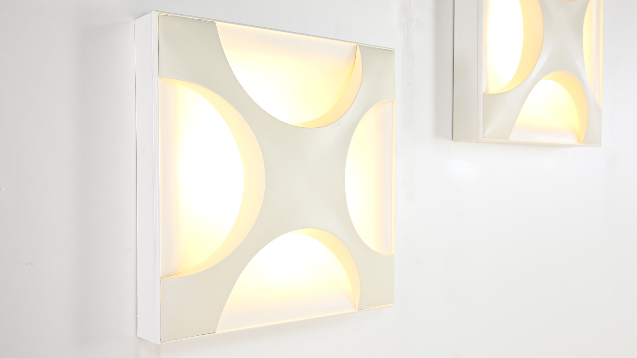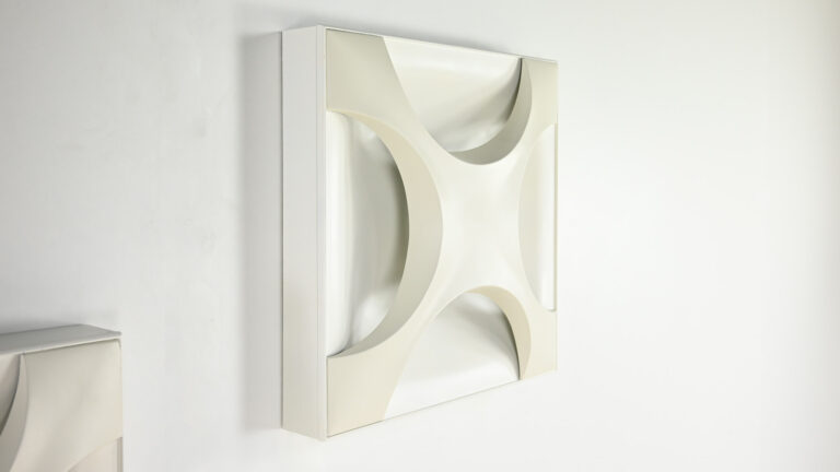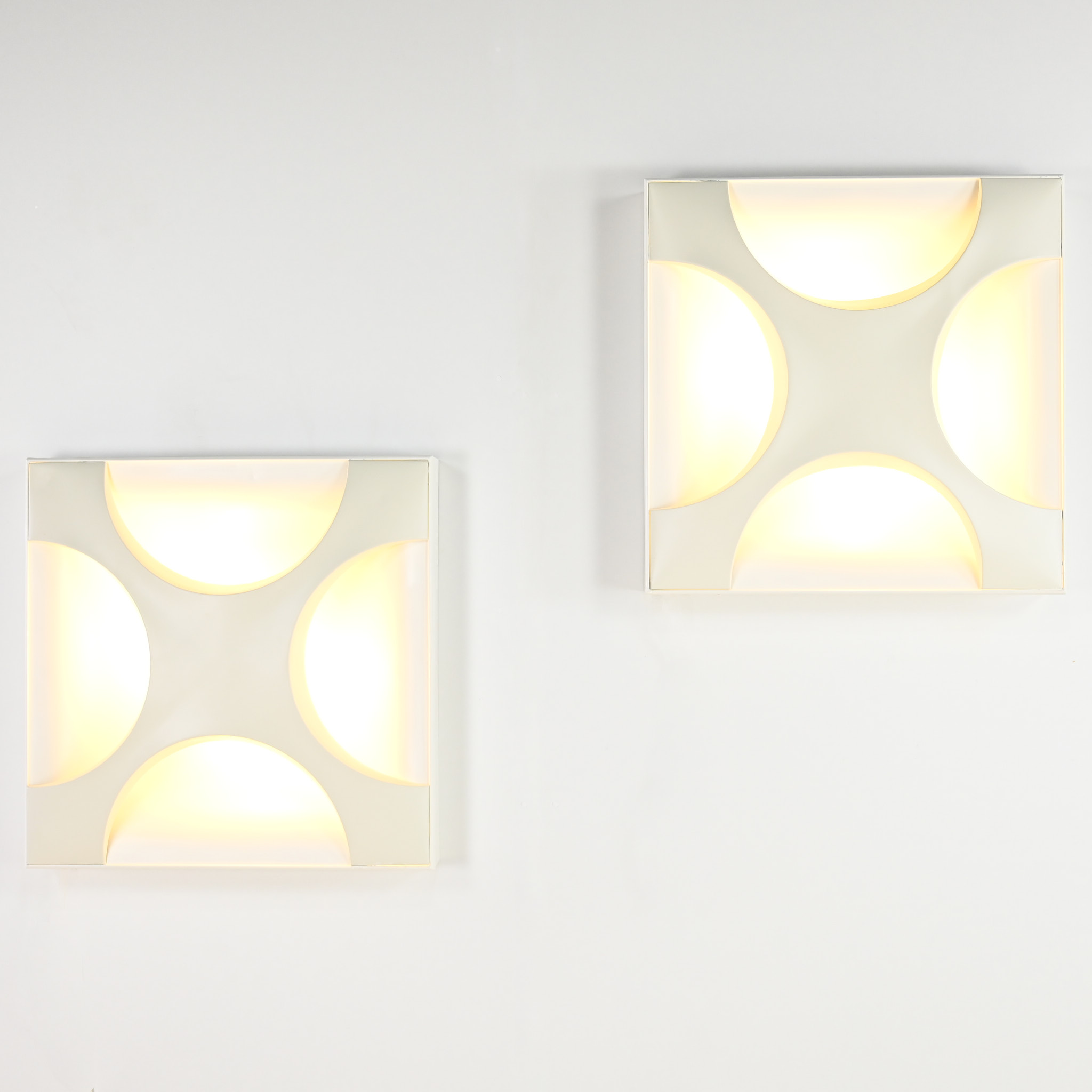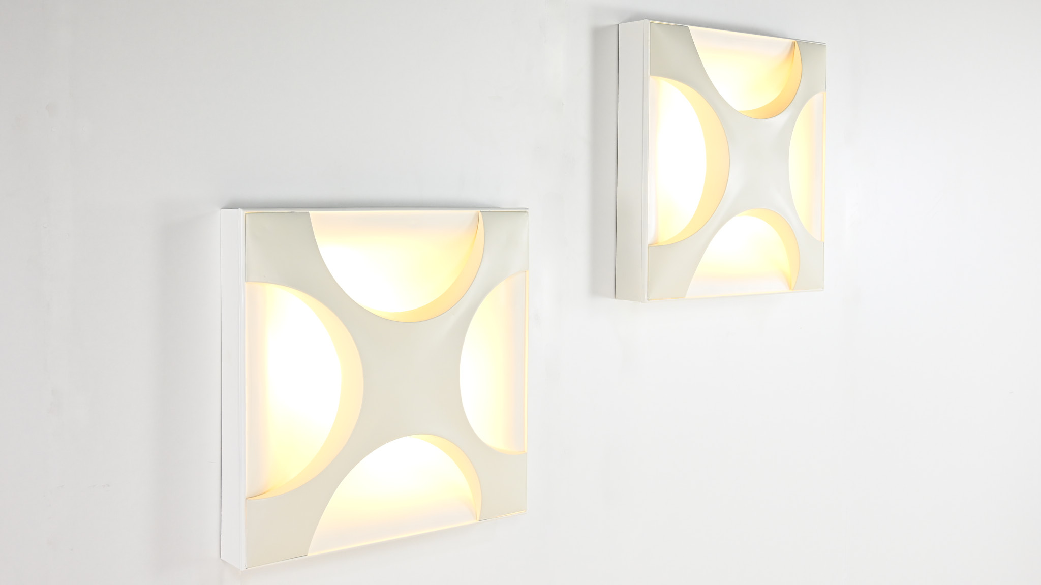 Paire de superbes appliques « Oyster », dessinées en 1968 par Rolf Krüger pour Staff Leuchten. Réalisées en aluminium laqué, avec un panneau arrière blanc mat et une croix en blanc ivoire, montées sur un cadre en bois laqué blanc mat. Traces d’usage, bon état général. Estampillées sur le luminaire. Allemagne, vers 1968. Prix pour la paire.